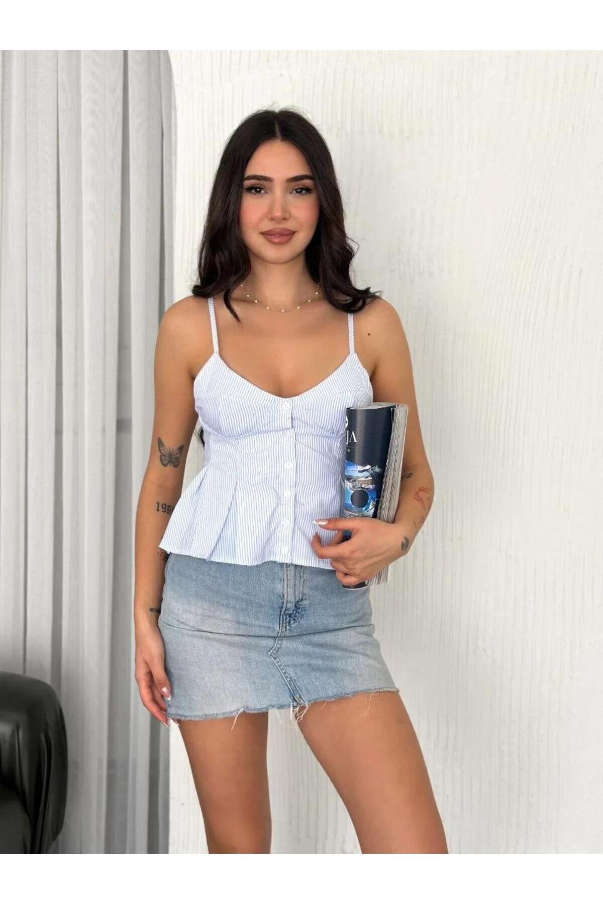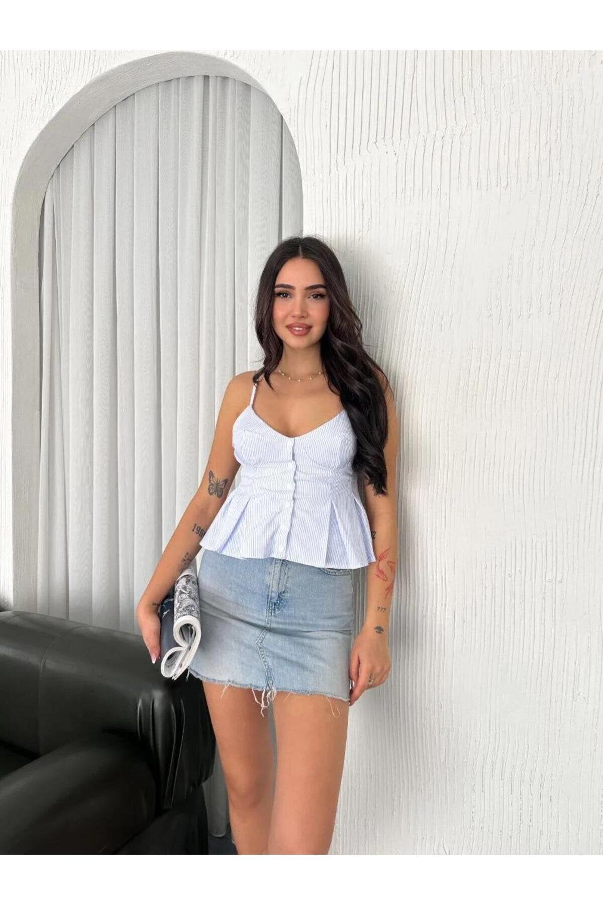 Cropped Strappy Neckline Detail Blouse - Light Blue