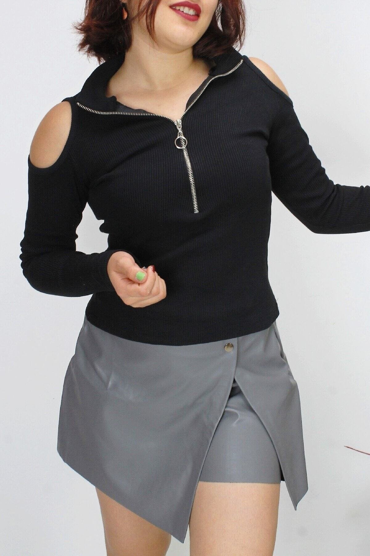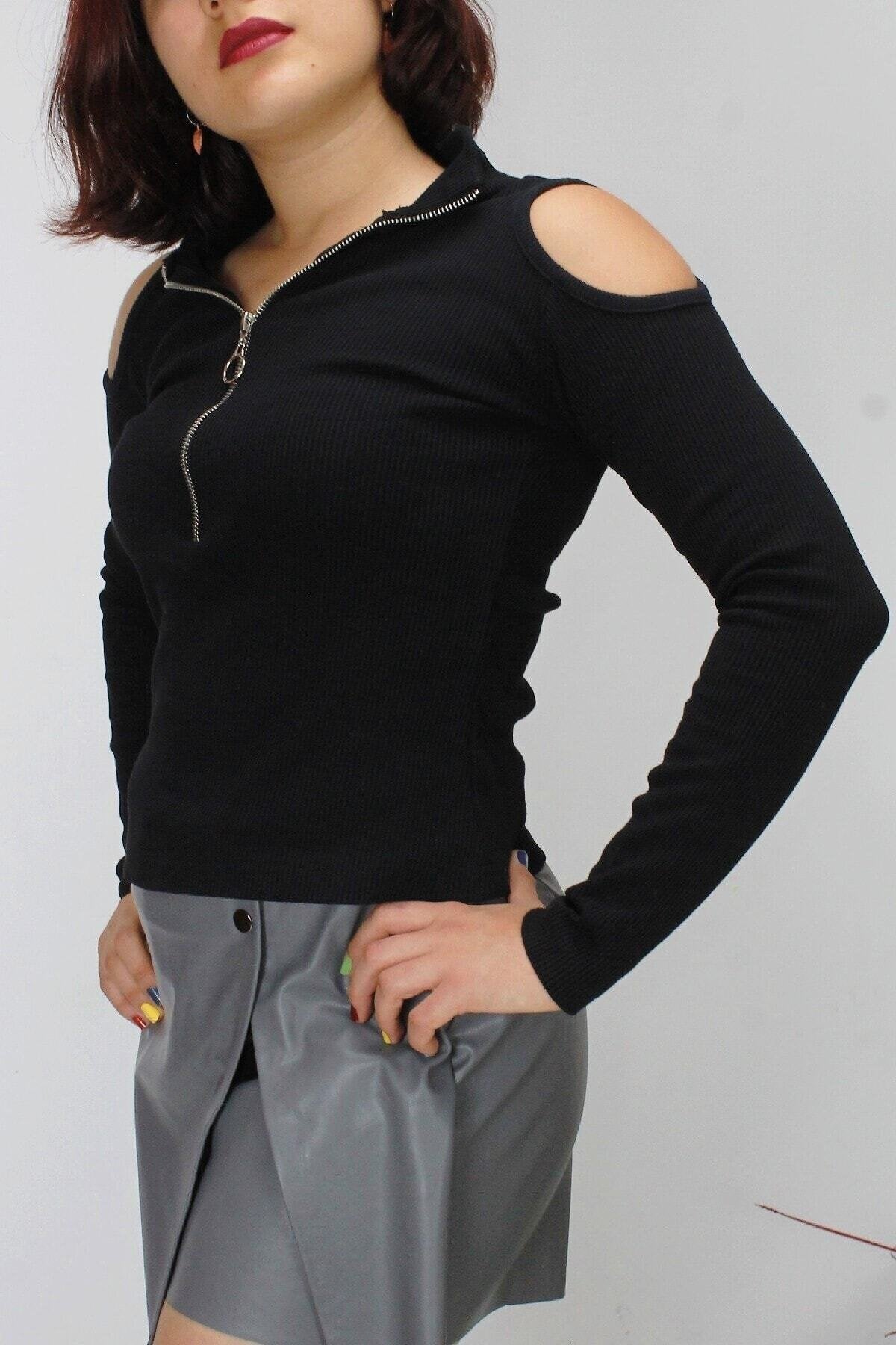 Fitted Ribbed Open Shoulder Zippered Blouse - Black