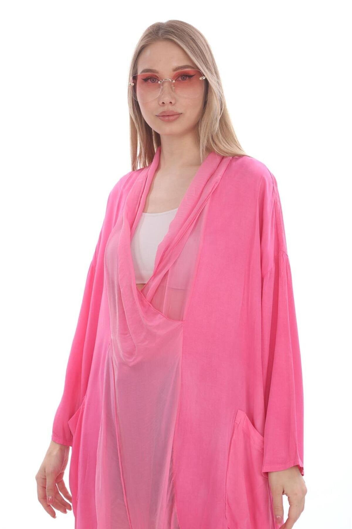 Pattern: Solid, Fit: Oversize, Neckline: V-Neck, Fabric Type: Woven, Material: Viscose, Sleeve Style: Long Sleeve, Color: Pink, Pockets: No Pockets, Product Type: Plain, Lining: Unlined, Length: Standard, Sleeve Length: Long, Occasion: Casual/Daily, Silhouette: Basic, Additional Features: Not Available, Belt: No Belt, Closure: No Closure, Sustainability Detail: No, Package Contents: Single, Origin: TR