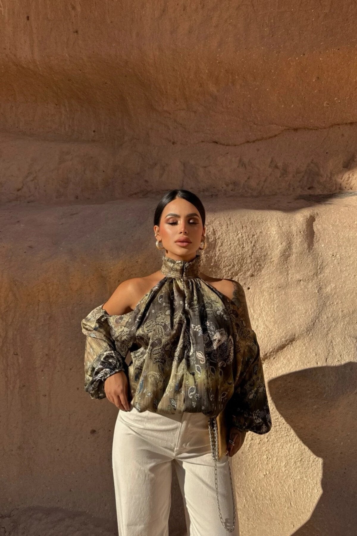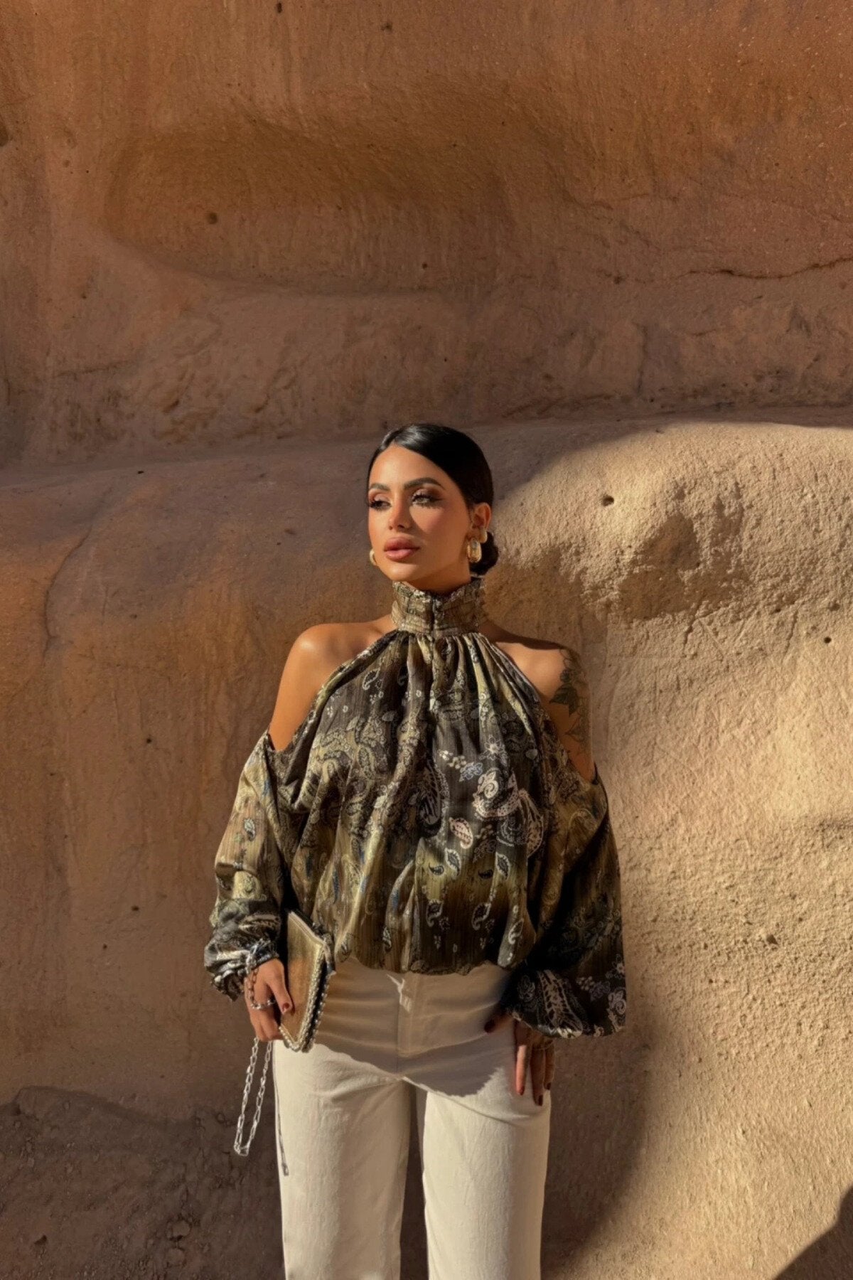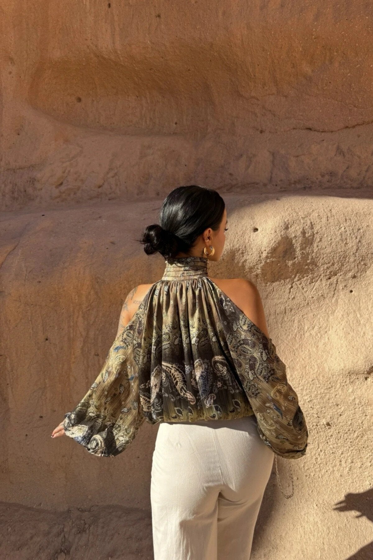 Patterned Chiffon High-Neck Shoulder Cutout Blouse - Green