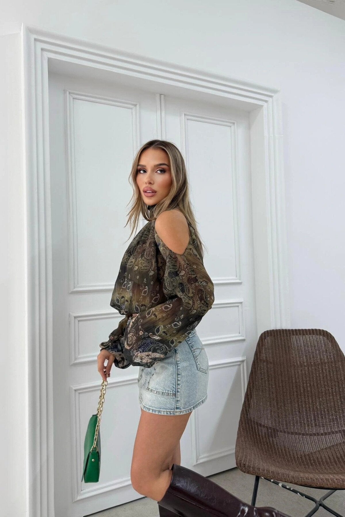 Patterned Chiffon Shoulder Cutout Blouse - Green