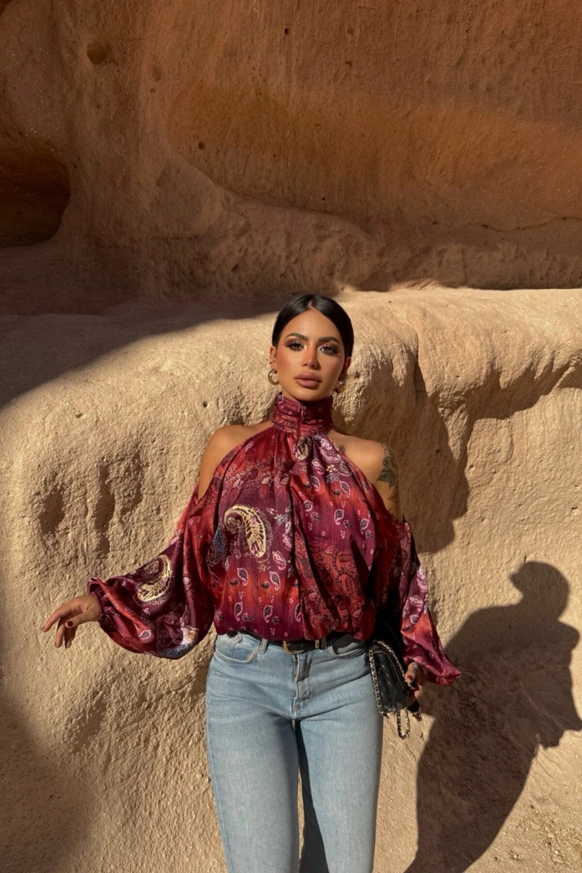Pattern: Patterned, Fit: Relaxed, Neckline Type: Stand-up Collar, Fabric Type: Woven, Material: Cotton Polyester, Sleeve Type: Long Sleeve, Color: Burgundy, Pockets: No Pockets, Product Detail: Undetailed, Product Type: Plain, Thickness: Medium, Lining Status: Unlined, Length: Standard, Collection: Design, Sleeve Length: Long, Occasion: Chic/Evening, Silhouette: Crop, Weave Type: Chiffon, Additional Feature: Not Available, Persona: Sexy, Belt/Sash Status: Beltless, Print/Embroidery Technique: Unprinted, Closure Type: Buttoned, Sustainability Detail: Yes, Package Content: Single, Cup: Cupless, Season: All Seasons, Origin: Turkey, Box Status: No Box