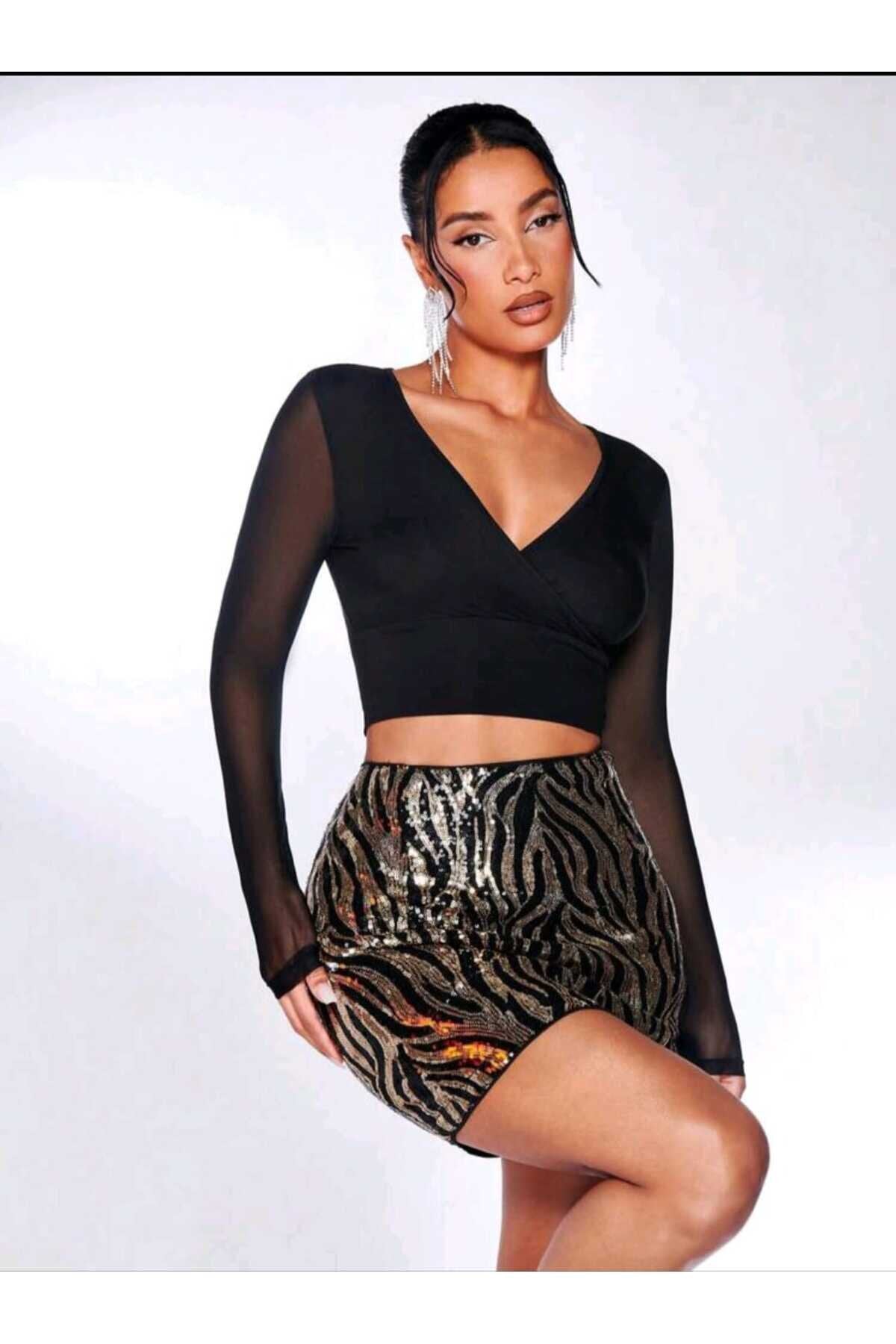Sandy Wrap-Neck Tulle Sleeve Blouse - Black