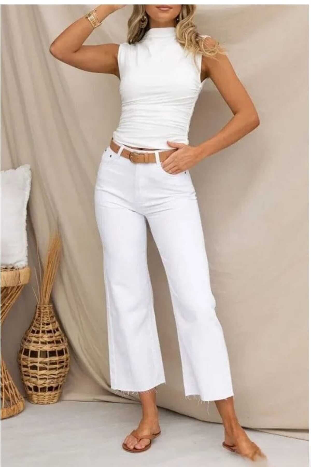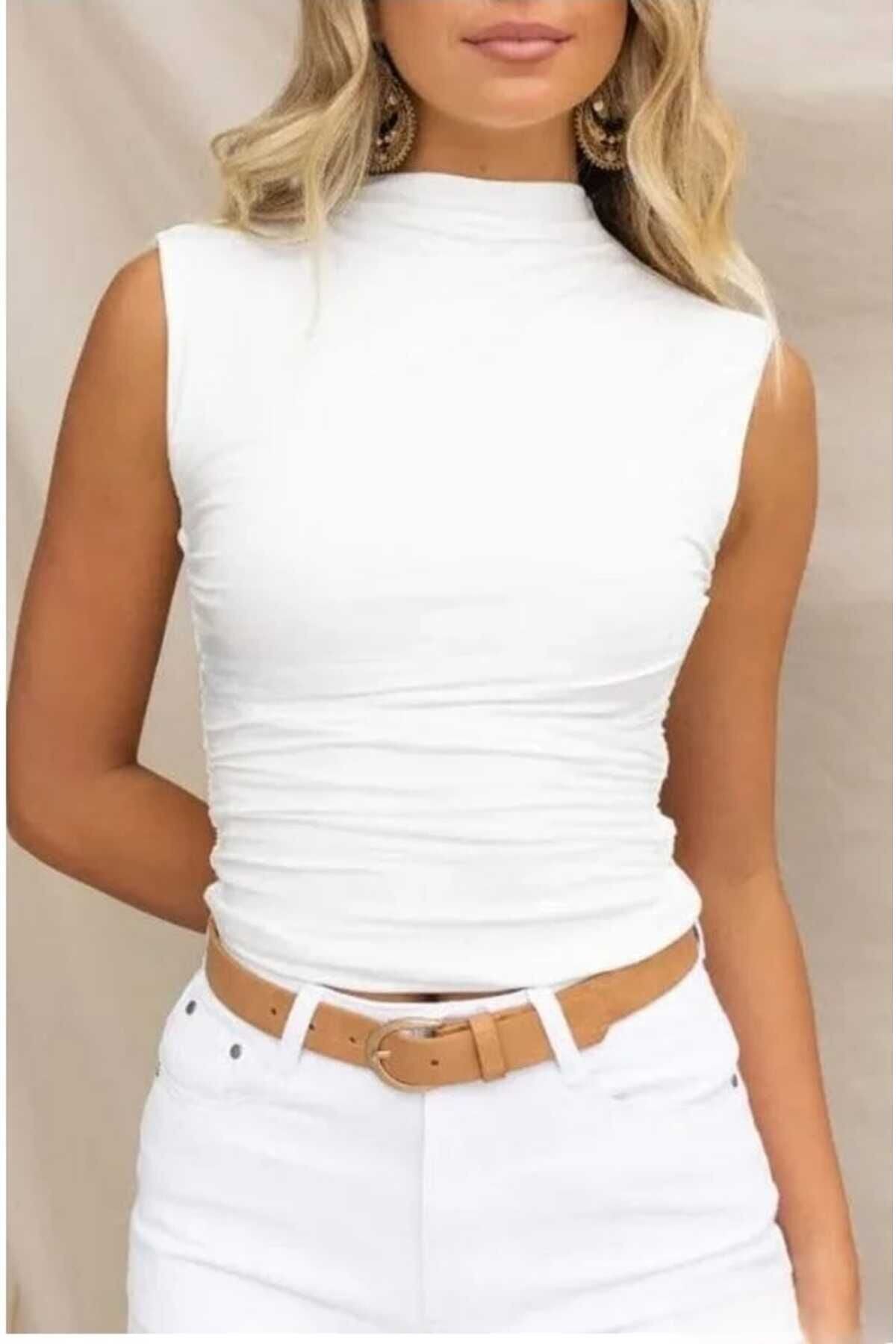 Seamless Lycra Turtleneck Side-Ruched Tank Top Blouse - White