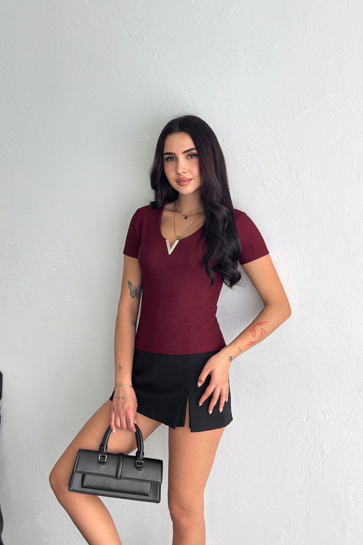 - A chic V-neckline gracefully frames your décolletage, perfectly complemented by a distinctive "V" shaped accessory, adding an instant touch of curated charm and sophistication.