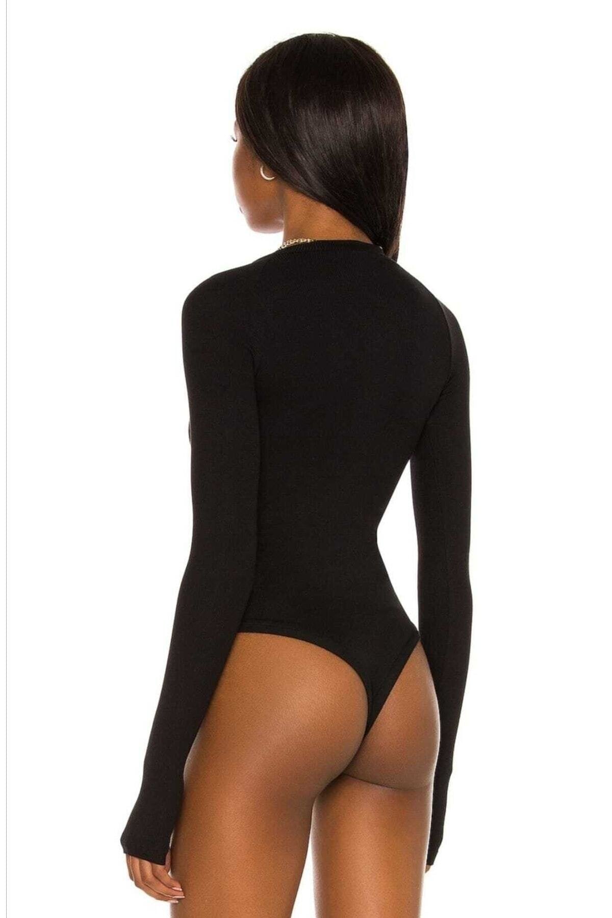 Double Layered Silk Jersey Placket Thumb-Hole Bodysuit - Black
