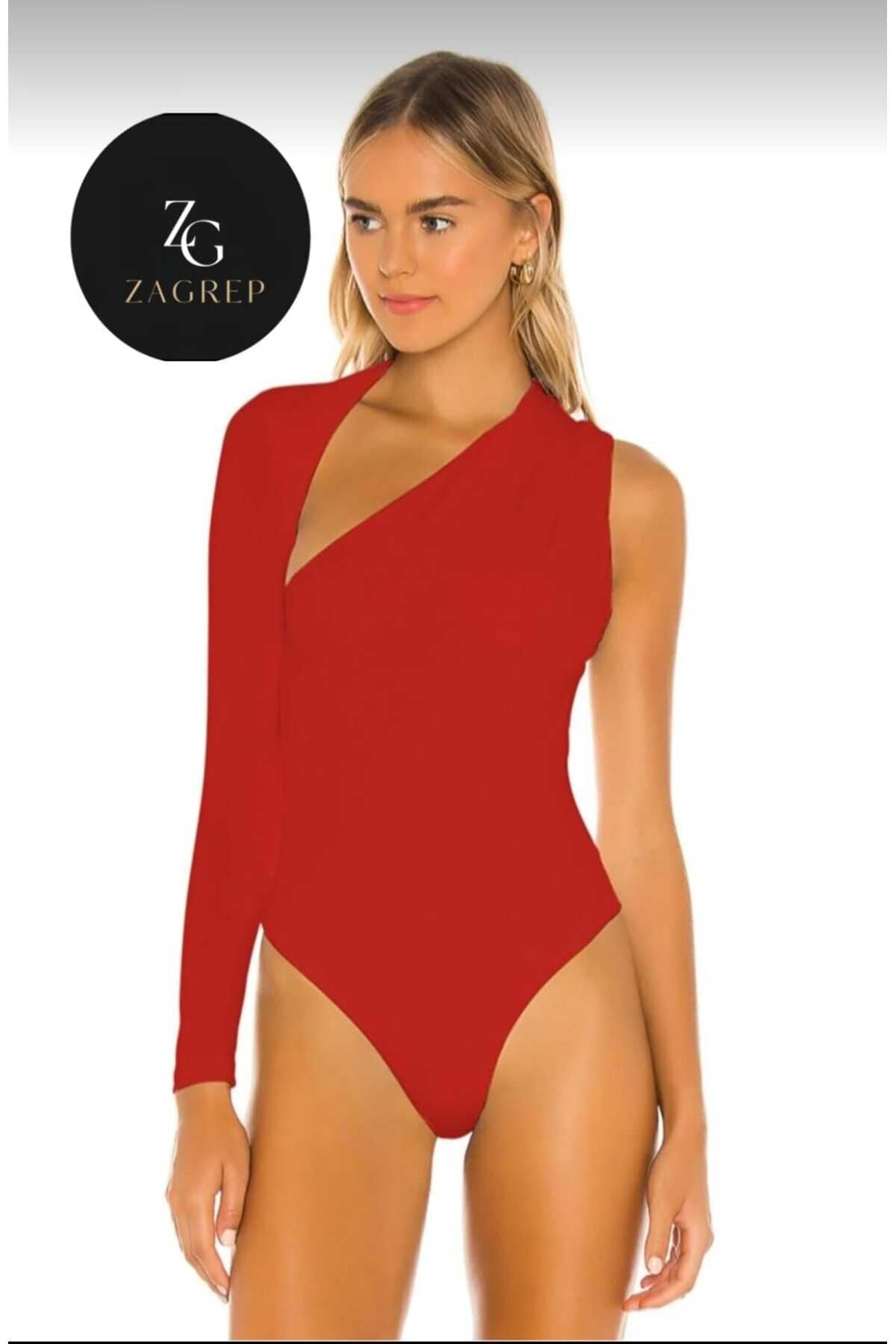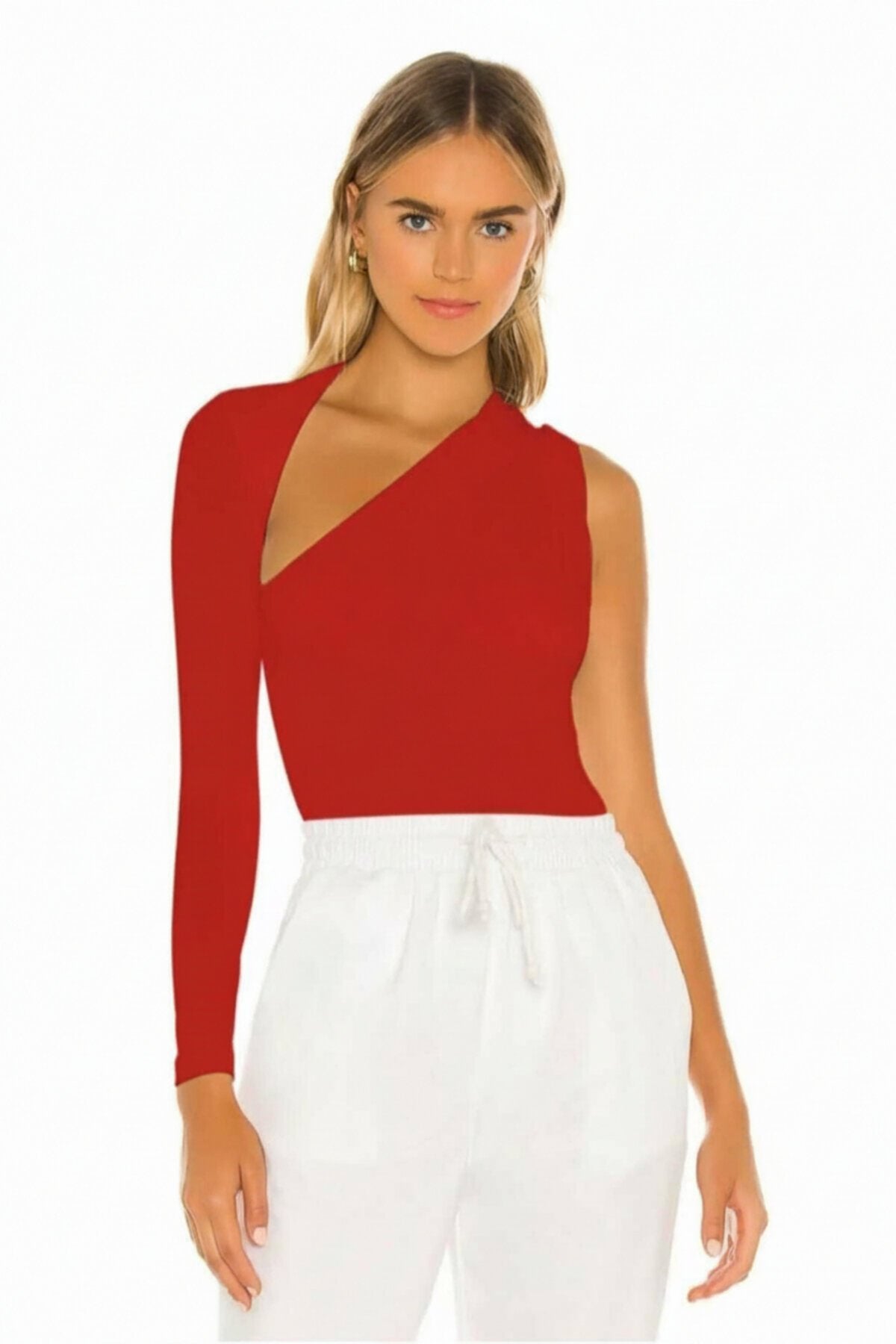 Pattern: Solid; Neckline: Asymmetric Neck; Material: Polyamide Blend; Fabric Type: Woven; Sleeve Type: Long Sleeve; Color: Red; Product Detail: Lined; Fit: Slim Fit; Product Type: Plain; Collection: Design; Package Contents: Single; Sleeve Length: Long; Additional Feature: Bottom Snap Closure; Sustainability Detail: Yes; Persona: Sexy; Weave Type: Jersey; Context: Trend; Length: Midi; Silhouette: Slim; Bottom Silhouette: Slip; Cup: Uncupped