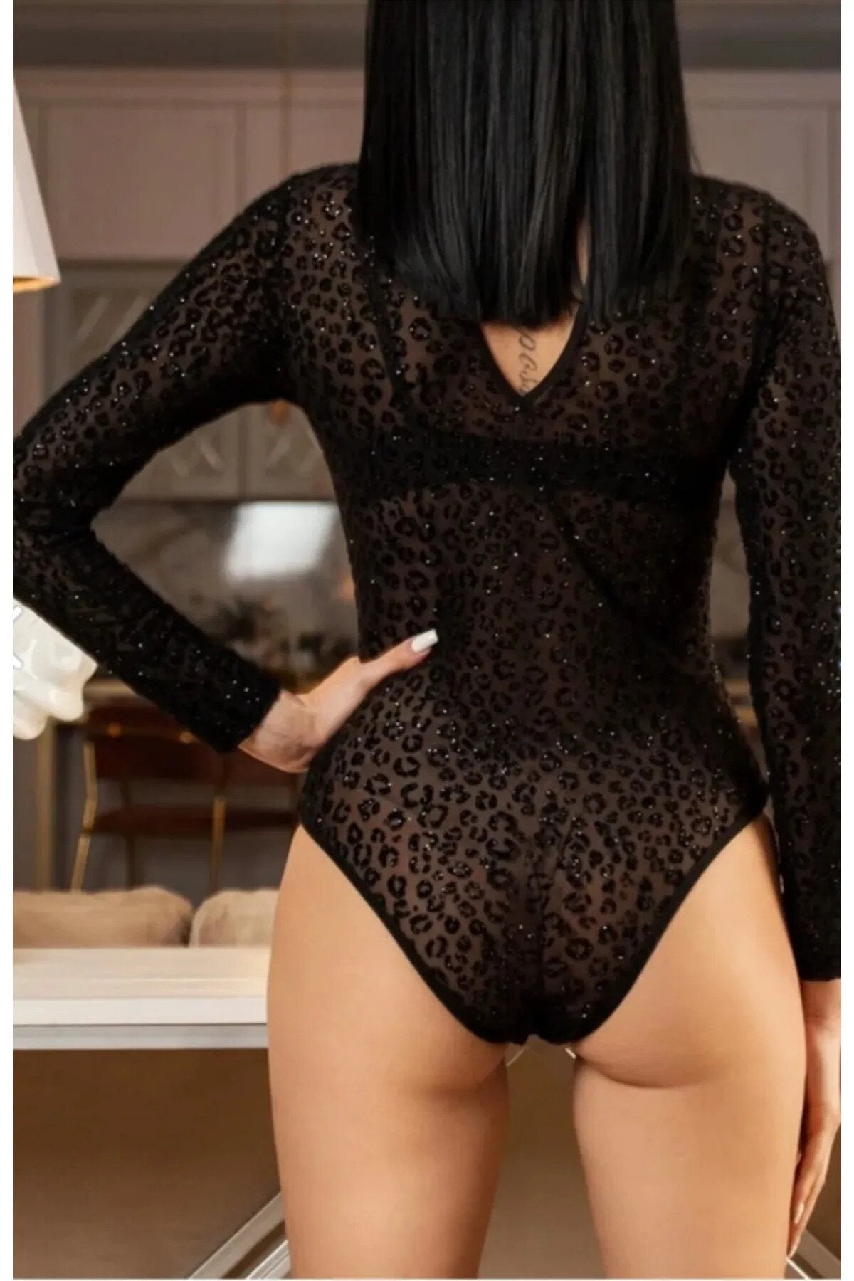 Pattern: Leopard, Collar Type: Mock Neck, Material: Polyester, Fabric Type: Knit, Sleeve Type: Long Sleeve, Color: Black, Product Detail: Snap-button Closure, Pocket: Hidden, Fit: Slim, Product Type: Plain, Collection: Glam, Package Contents: Single Item, Sleeve Length: Long, Additional Feature: Anti-pilling, Sustainability Detail: No, Persona: Cool & Comfort, Weave Type: Mesh, Occasion: Night, Length: Short / Mini, Silhouette: Short, Bottom Silhouette: Brief, Cup: Cupless, Season: All Seasons, Origin: TR, Box Condition: No Box, Closure Type: Mono Closure