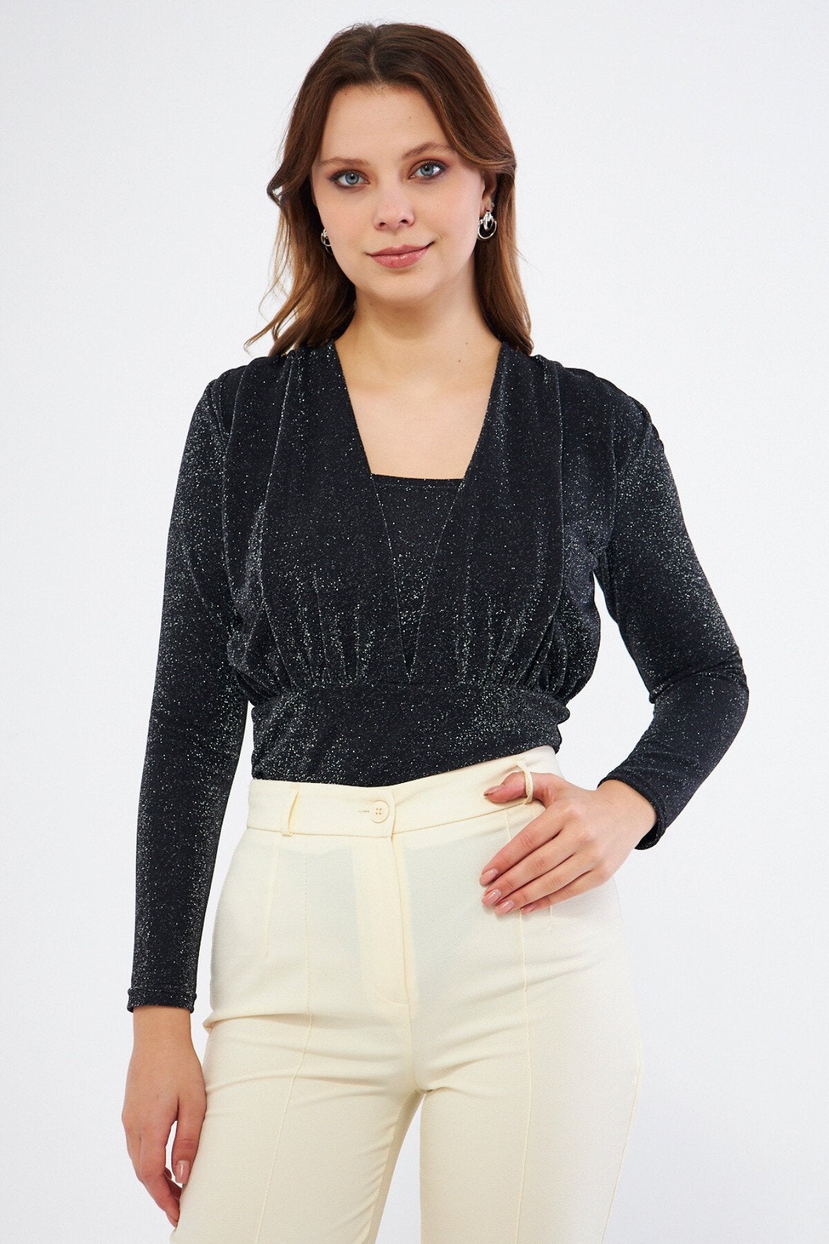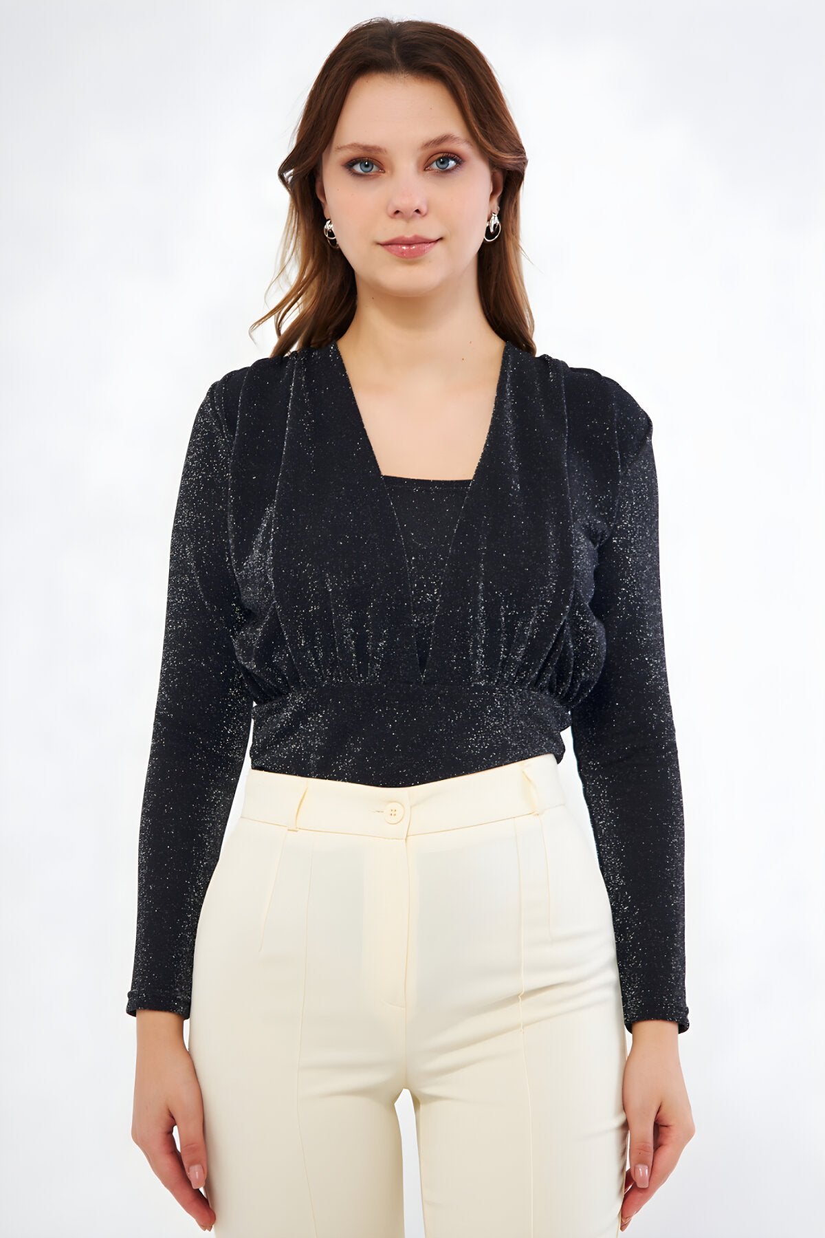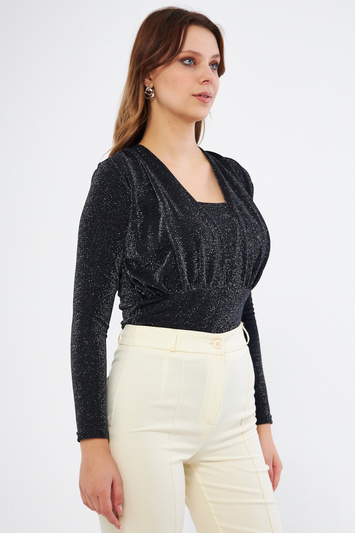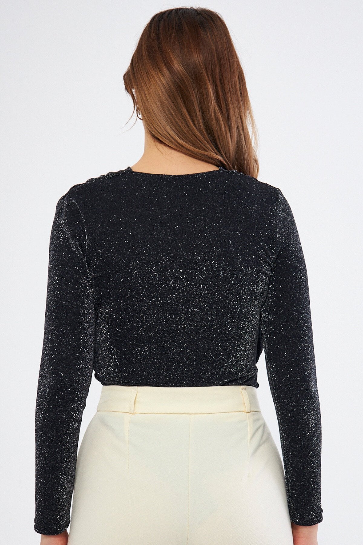 Long Sleeve Glittery Knitted Ruched Detail Snap-Button Bodysuit - Black