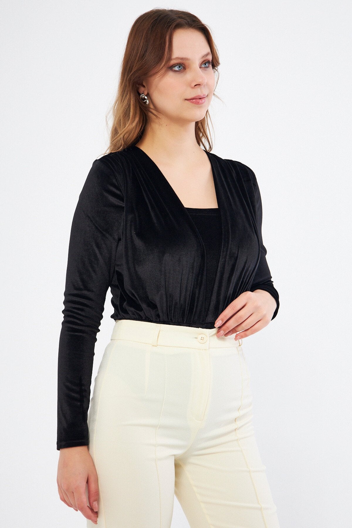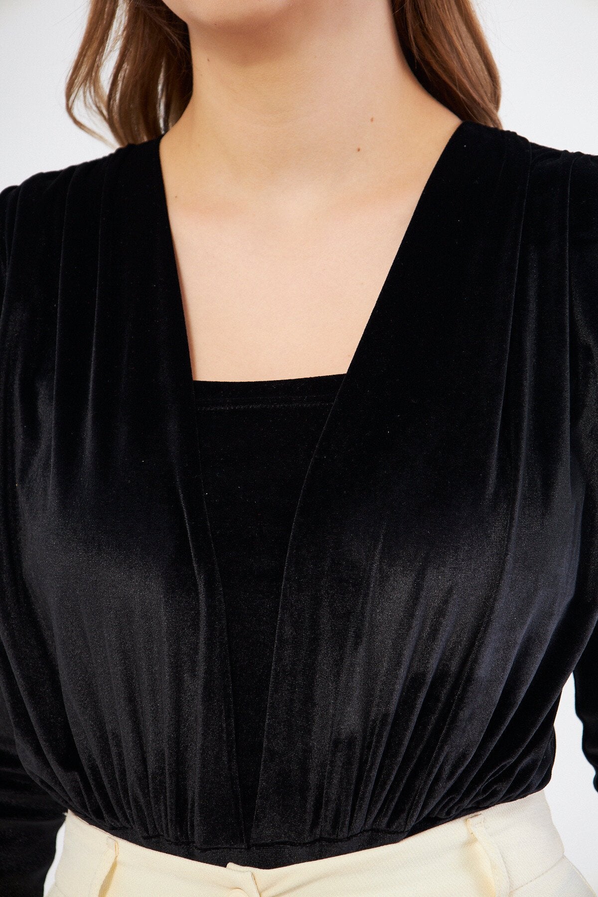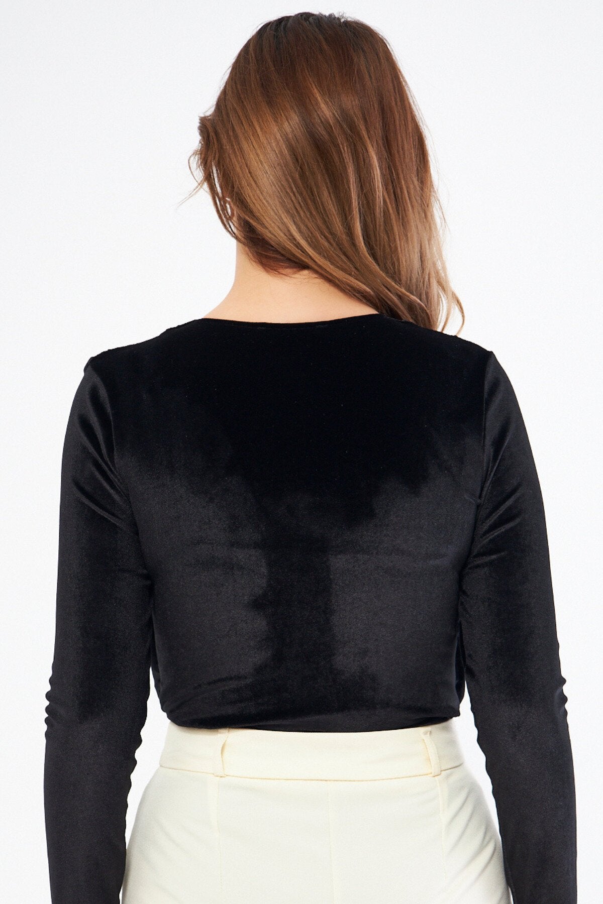 Pattern: Solid; Neckline: V-Neck; Material: Velvet; Fabric Type: Knit; Sleeve Type: Long Sleeve; Color: Black; Product Detail: Snap Closure; Fit: Slim Fit; Product Type: Plain; Collection: Design; Package Content: Single Item; Sleeve Length: Long; Additional Feature: Bottom Snap Closure; Sustainability Detail: Yes; Persona: Fashion Forward; Weave Type: Tulle; Occasion: Day / Night; Length: Long; Silhouette: Long; Bottom Silhouette: Slip; Cups: No Cups; Packaging: No Box; Closure Type: Snap;
