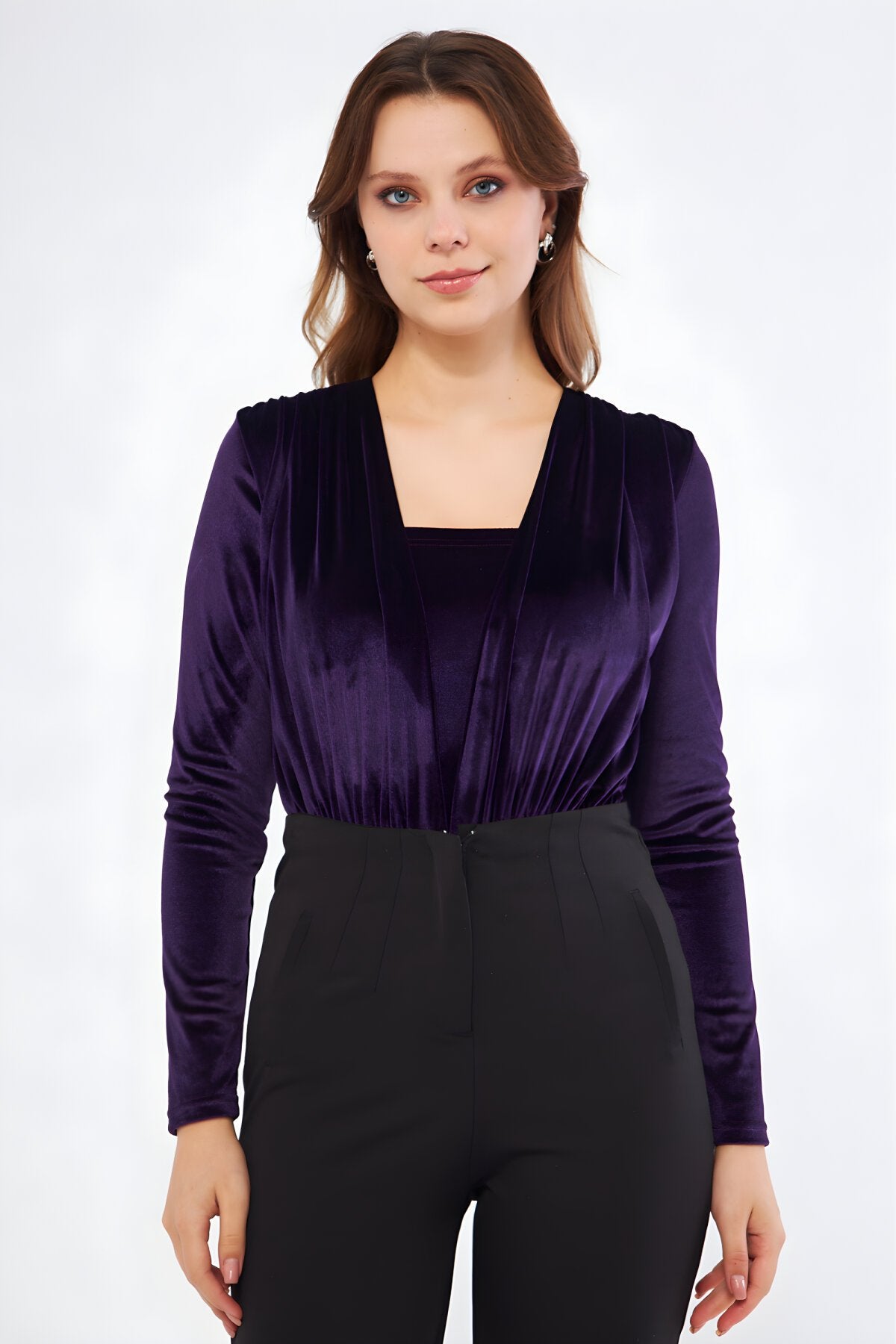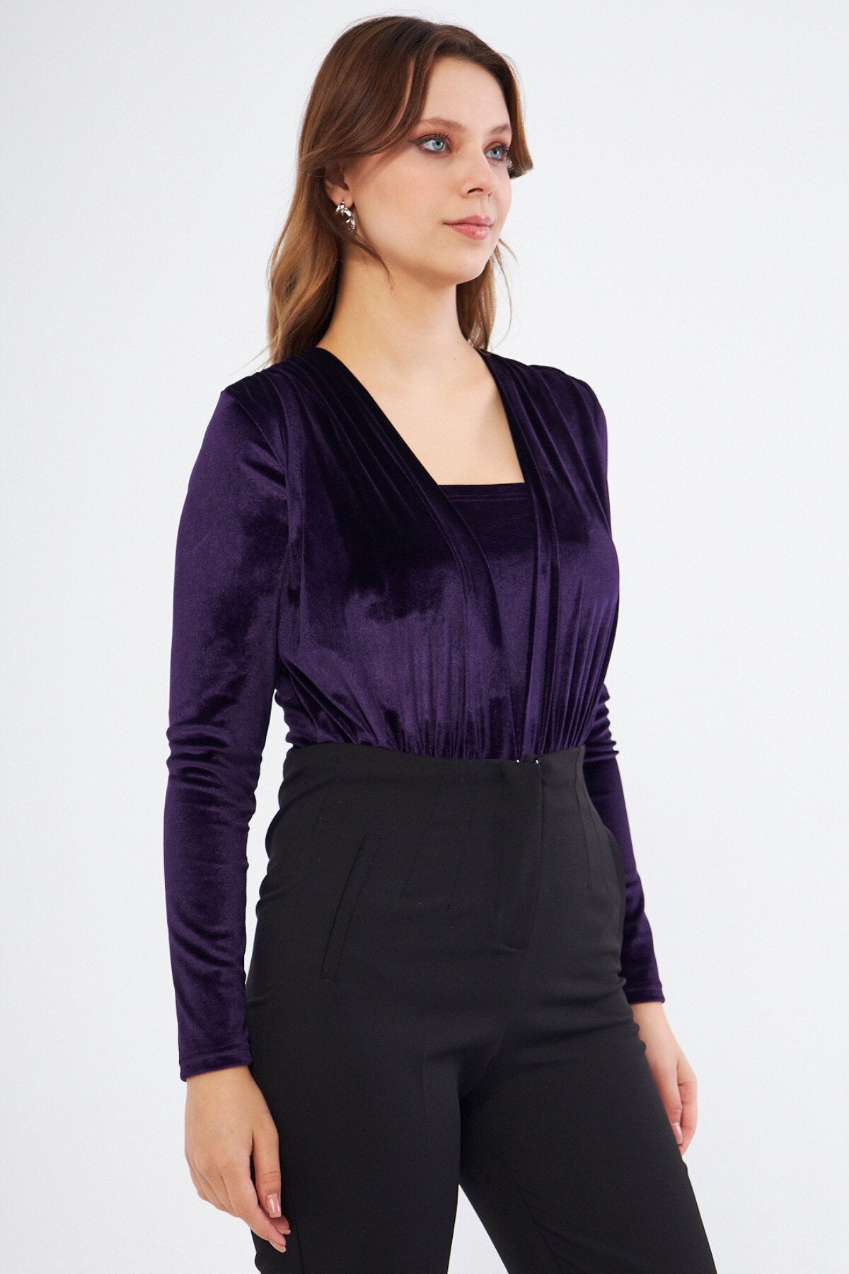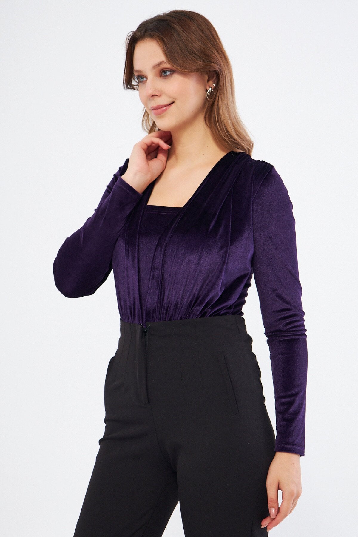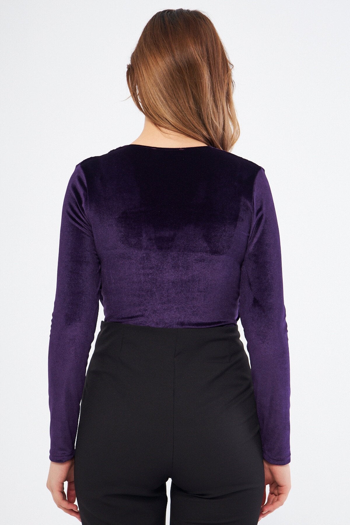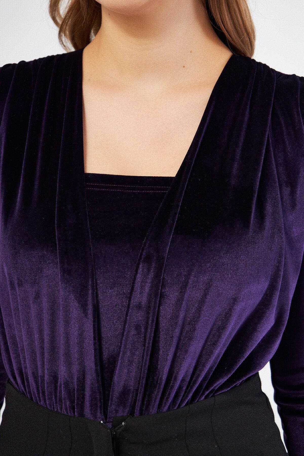 Pattern: Plain; Neckline: V-Neck; Material: Velvet; Fabric Type: Knitted; Sleeve Type: Long Sleeve; Color: Purple; Product Detail: Snap Closure; Fit: Slim Fit; Product Type: Plain; Collection: Design; Package Content: Single; Sleeve Length: Long; Additional Feature: Bottom Snap Closure; Sustainability Detail: Yes; Persona: Fashion Forward; Weave Type: Tulle; Occasion: Day / Night; Length: Long; Silhouette: Long; Bottom Silhouette: Slip; Cup: Cupless; Box Condition: No Box; Closure Type: Snap