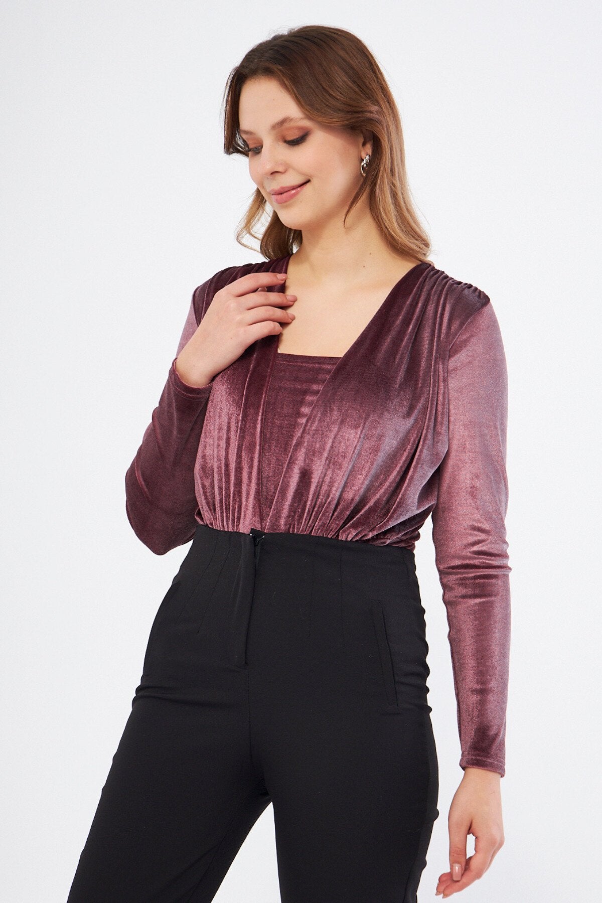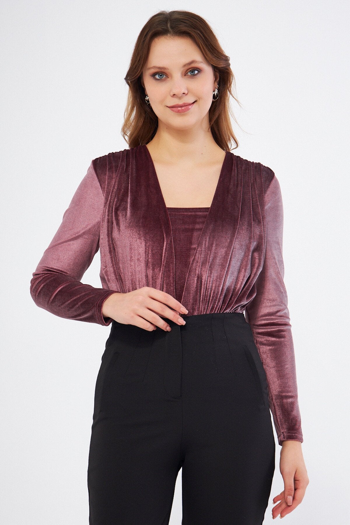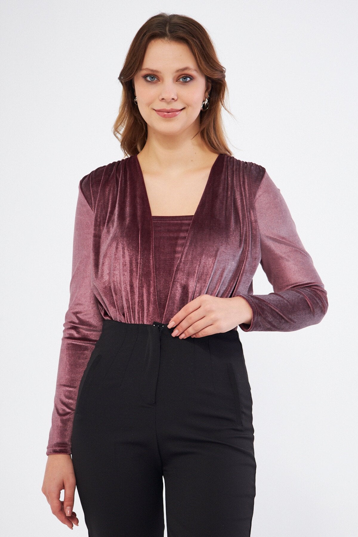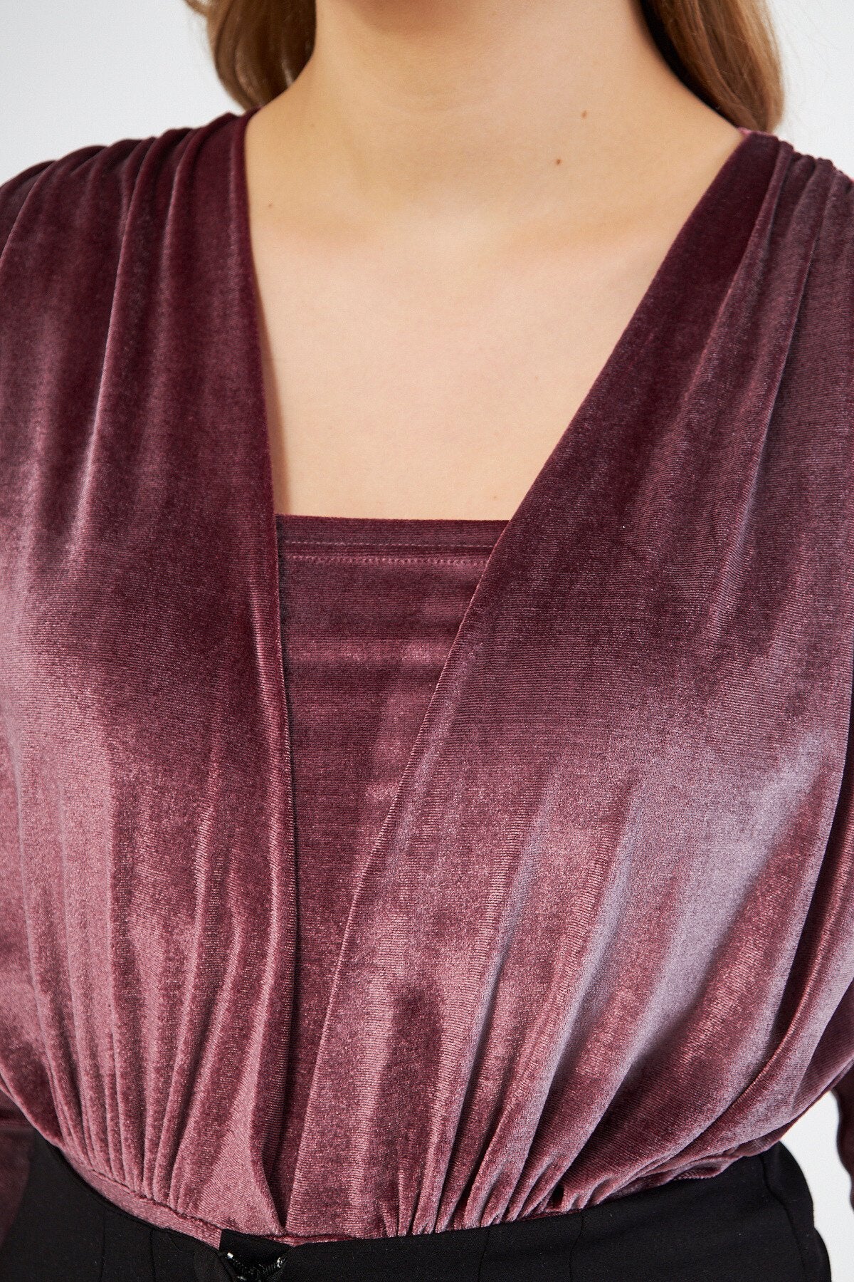 Pattern: Solid, Neckline: V-Neck, Material: Velvet, Fabric Type: Knit, Sleeve Type: Long Sleeve, Color: Pink, Product Detail: Snap Closure, Fit: Slim Fit, Product Type: Plain, Collection: Design, Package Contents: Single, Sleeve Length: Long, Additional Feature: Bottom Snap Closure, Sustainability Detail: Yes, Persona: Fashion Forward, Weave Type: Tulle, Occasion: Day / Night, Length: Long, Silhouette: Long, Bottom Silhouette: Slip, Cup: Cupless, Box Status: No Box, Closure Type: Snap Closure