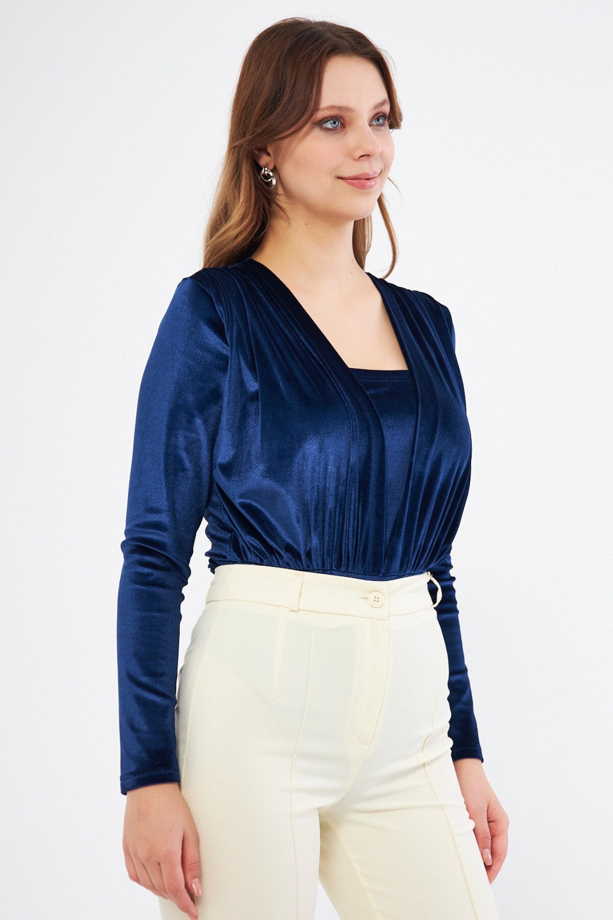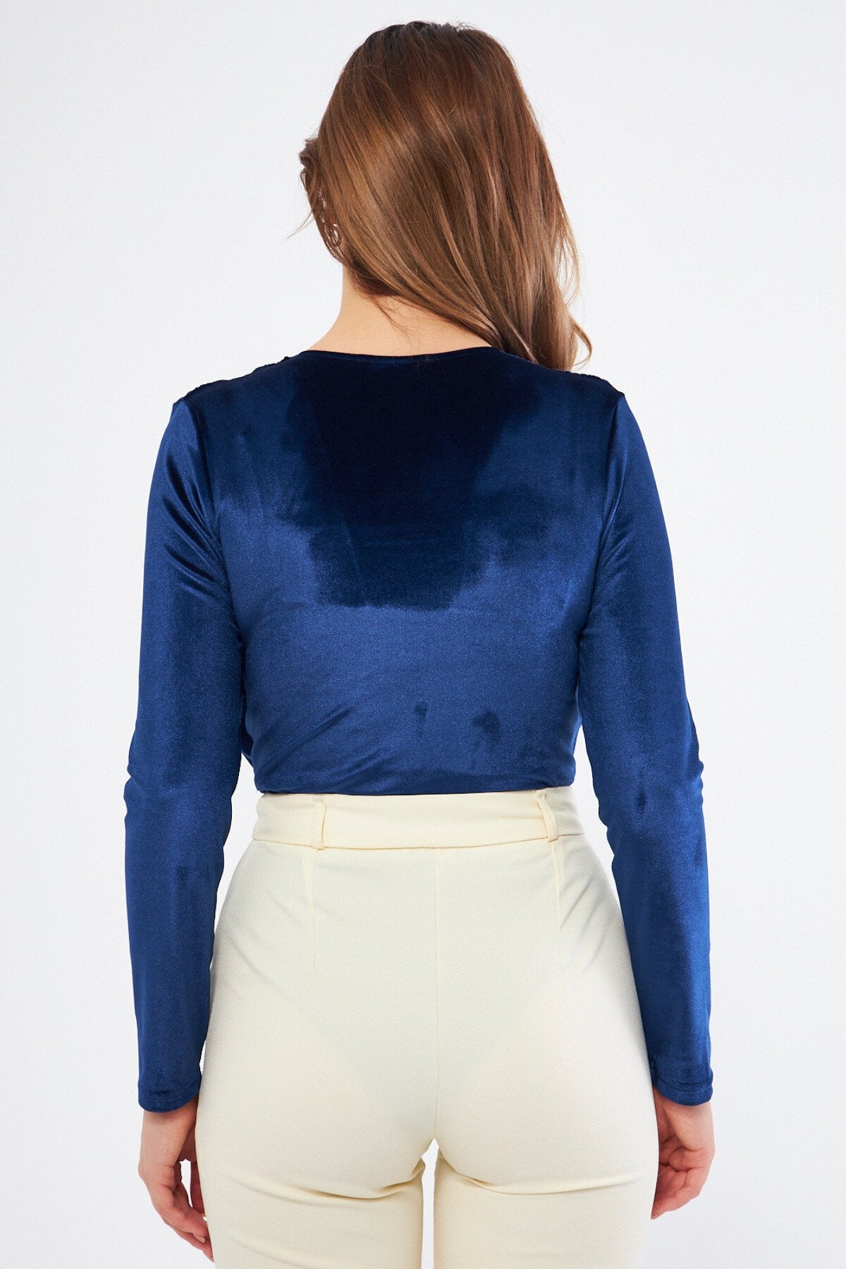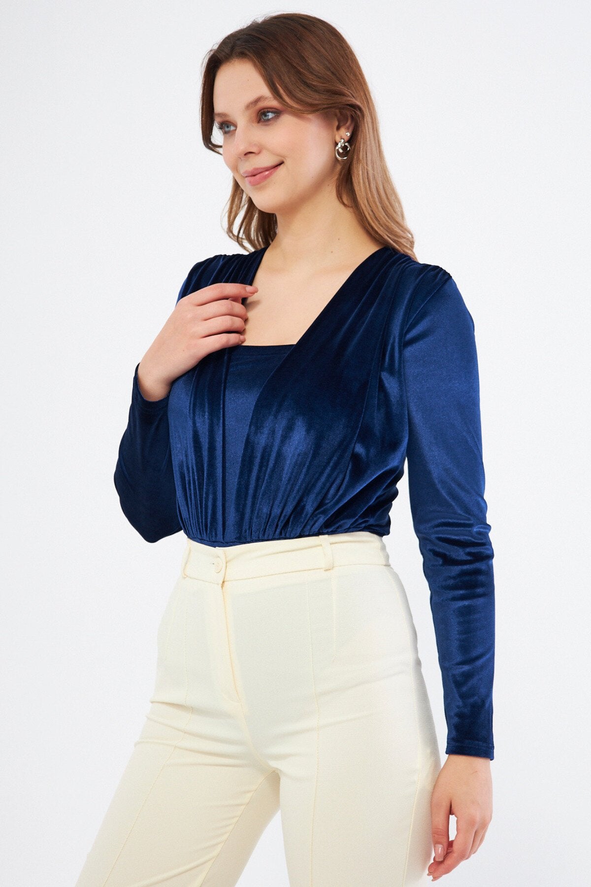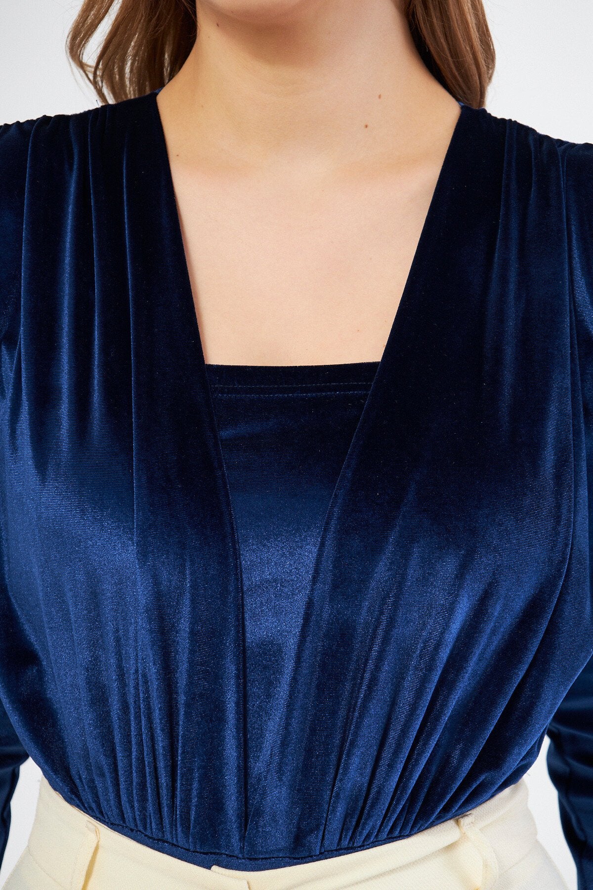Long Sleeve Velvet Ruched Detail Snap Bodysuit - Navy Blue