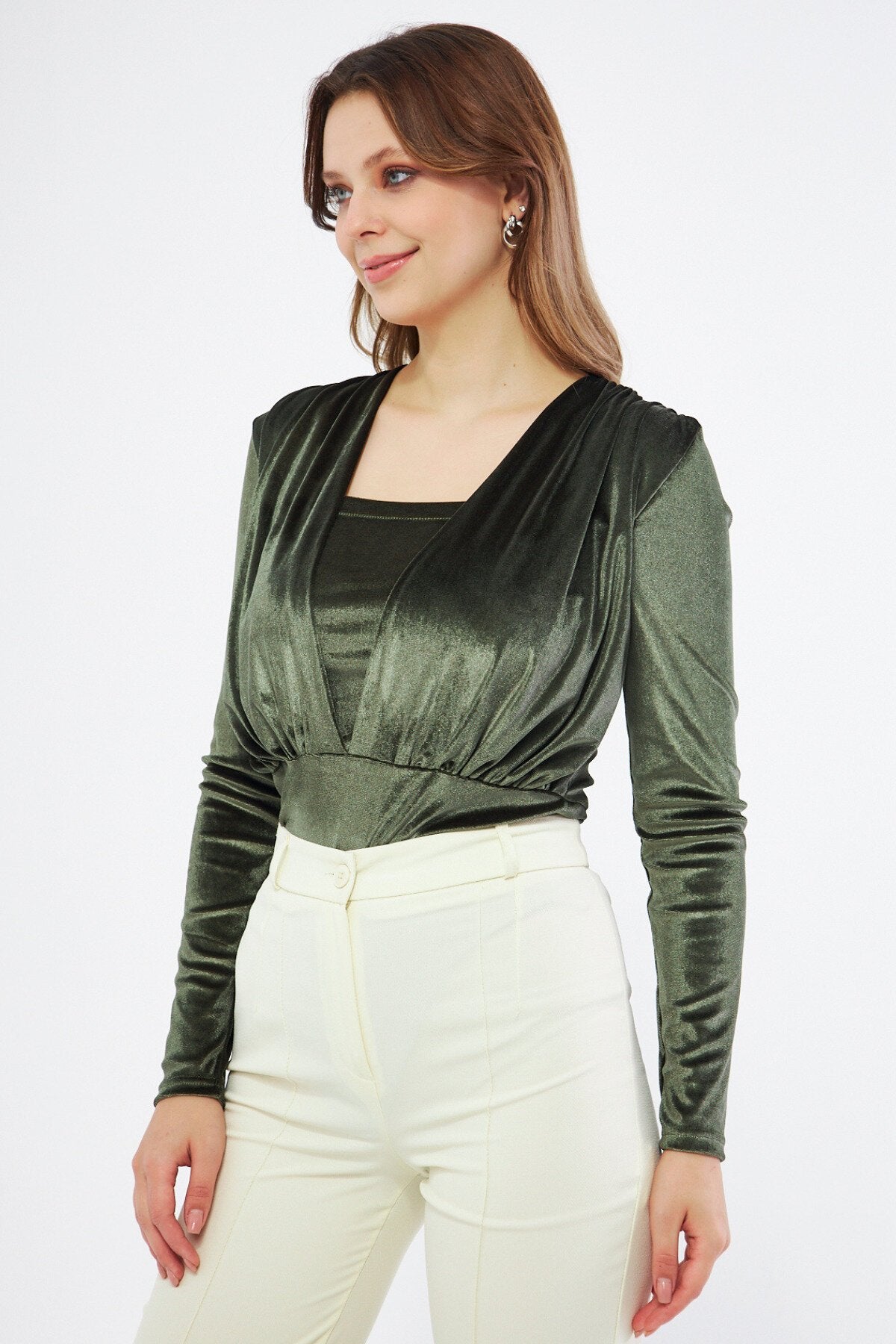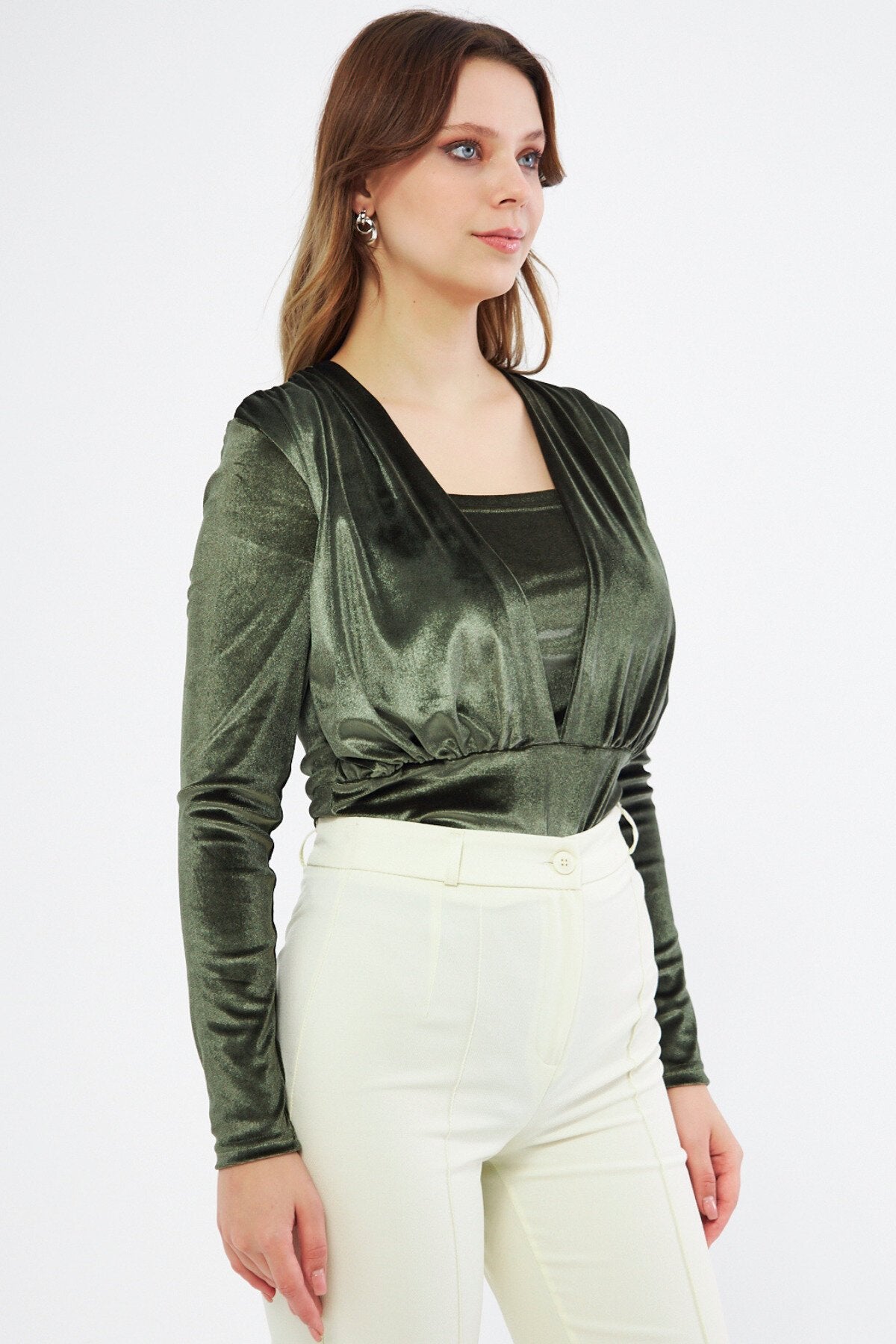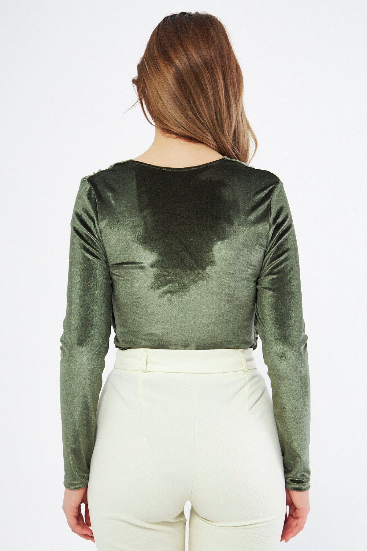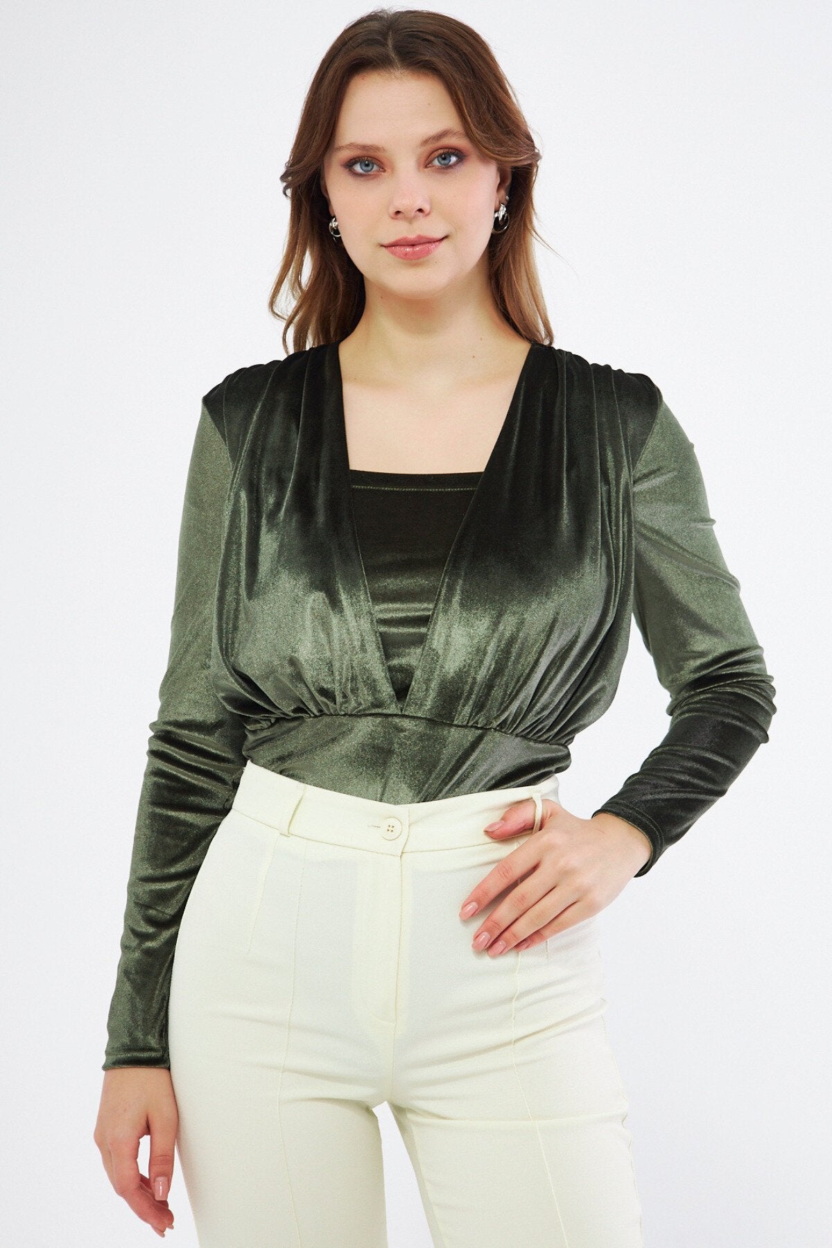 Pattern: Plain, Neckline: V-Neck, Material: Velvet, Fabric Type: Knit, Sleeve Type: Long Sleeve, Color: Khaki, Product Detail: Snap Closure, Fit: Slim Fit, Product Type: Plain, Collection: Design, Package Contents: Single Item, Sleeve Length: Long, Additional Feature: Snap Fastening at Bottom, Sustainability Detail: Yes, Persona: Fashion Forward, Weave Type: Tulle, Occasion: Day / Night, Length: Long, Silhouette: Long, Bottom Silhouette: Slip, Cup: Cupless, Box Condition: No Box, Closure Type: Snap Closure