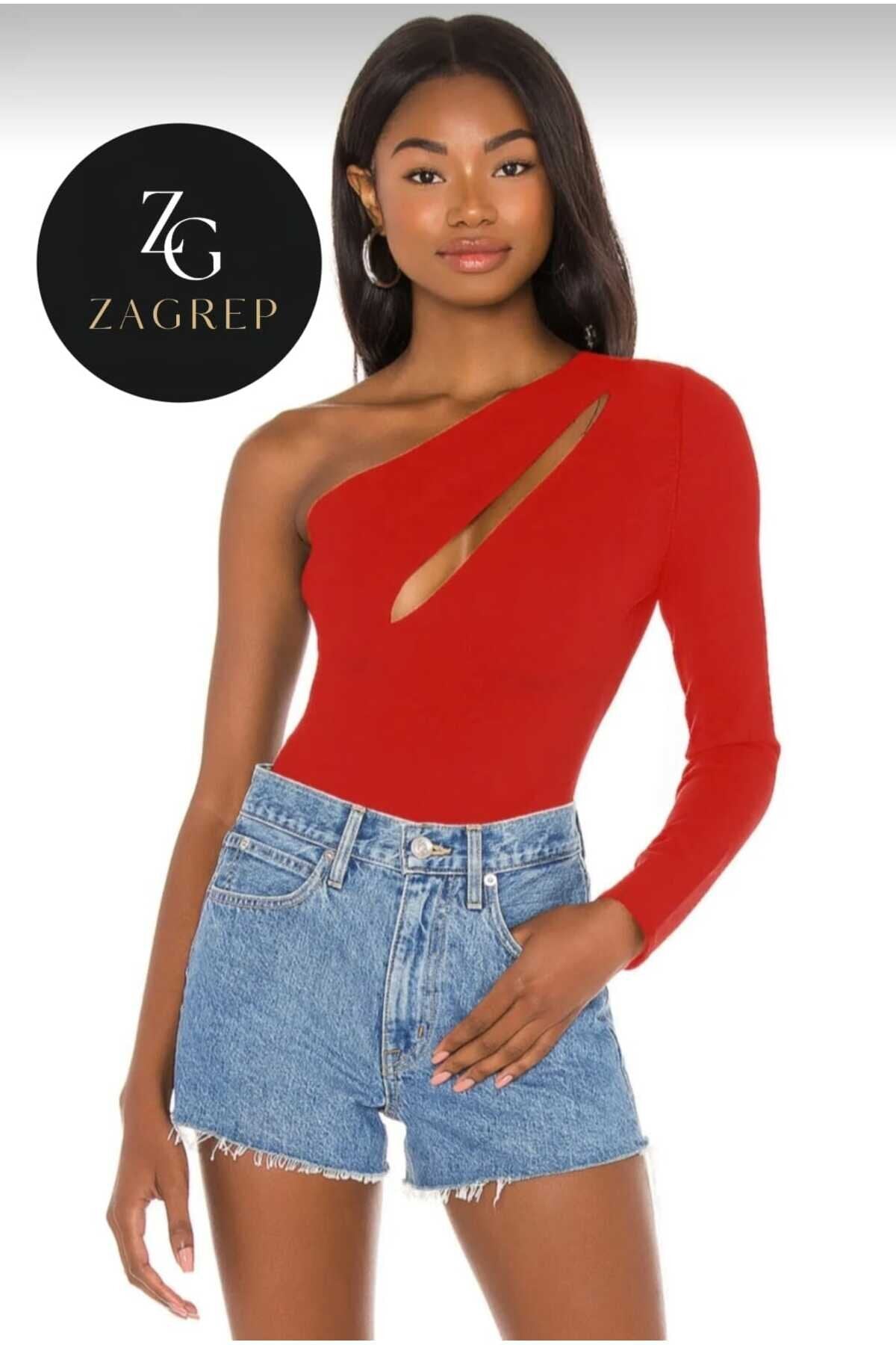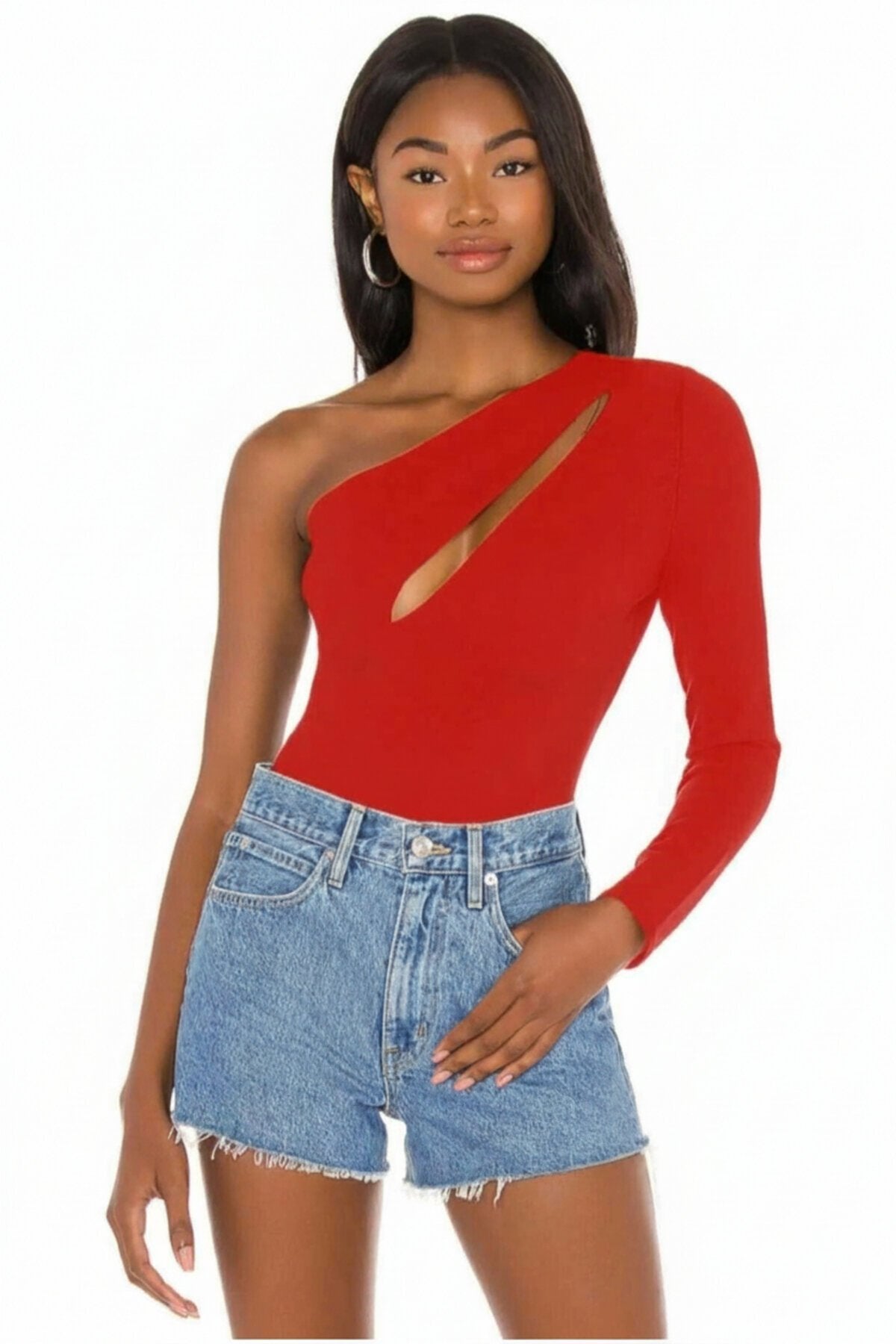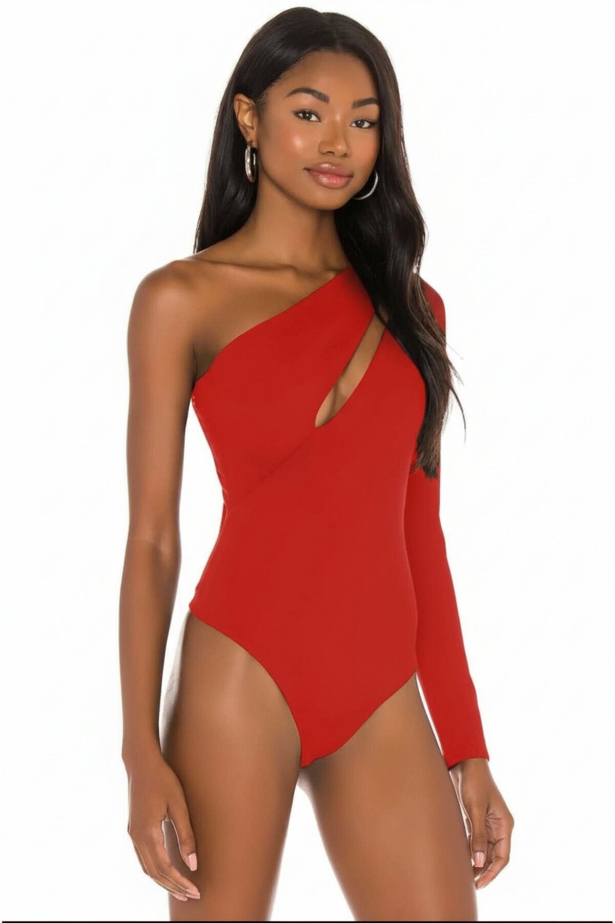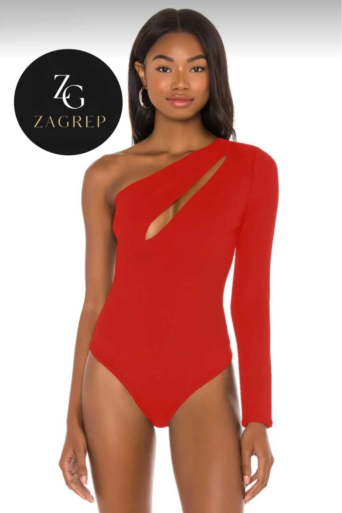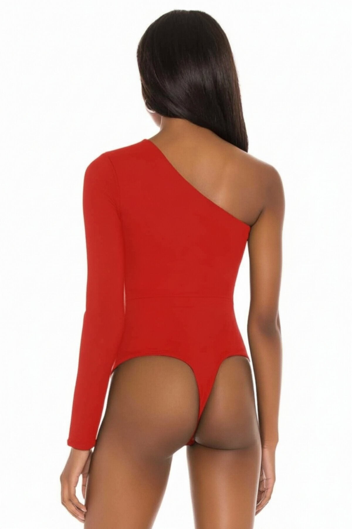 Pattern: Solid, Neckline: Asymmetric Neckline, Material: Jersey, Fabric Type: Knit, Sleeve Type: One-Sleeve, Color: Red, Product Detail: Lined, Fit: Slim, Product Type: Plain, Collection: Design, Package Contents: 1+, Sleeve Length: Long, Additional Feature: Bottom Snap Closure, Sustainability Detail: Yes, Persona: Sexy, Weave Type: Jersey, Style: Trendy, Length: Regular, Silhouette: Basic, Bottom Silhouette: Slip, Cup: Cupless, Box Status: No Box