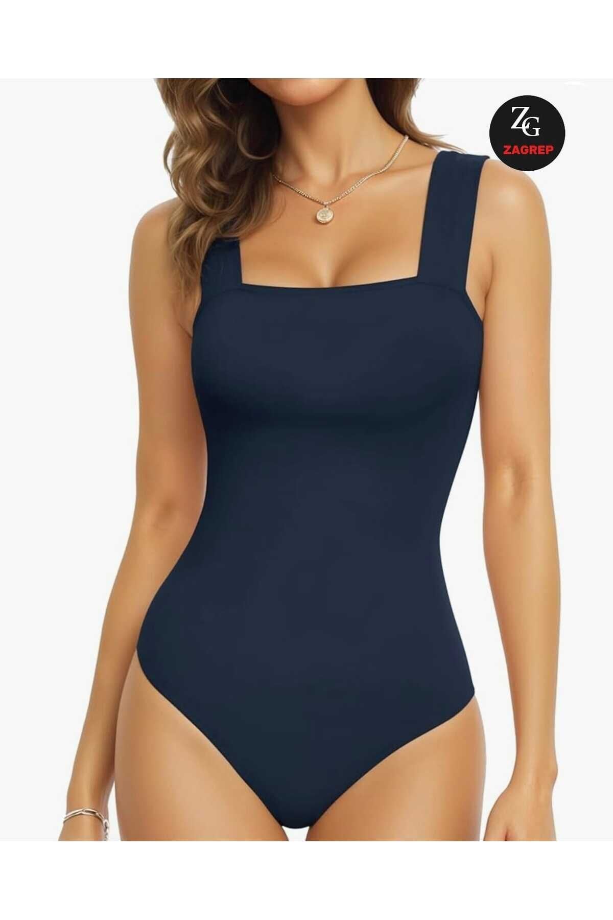 Opaque Silk Jersey Wide Strap Square Neck Bodysuit - Navy Blue