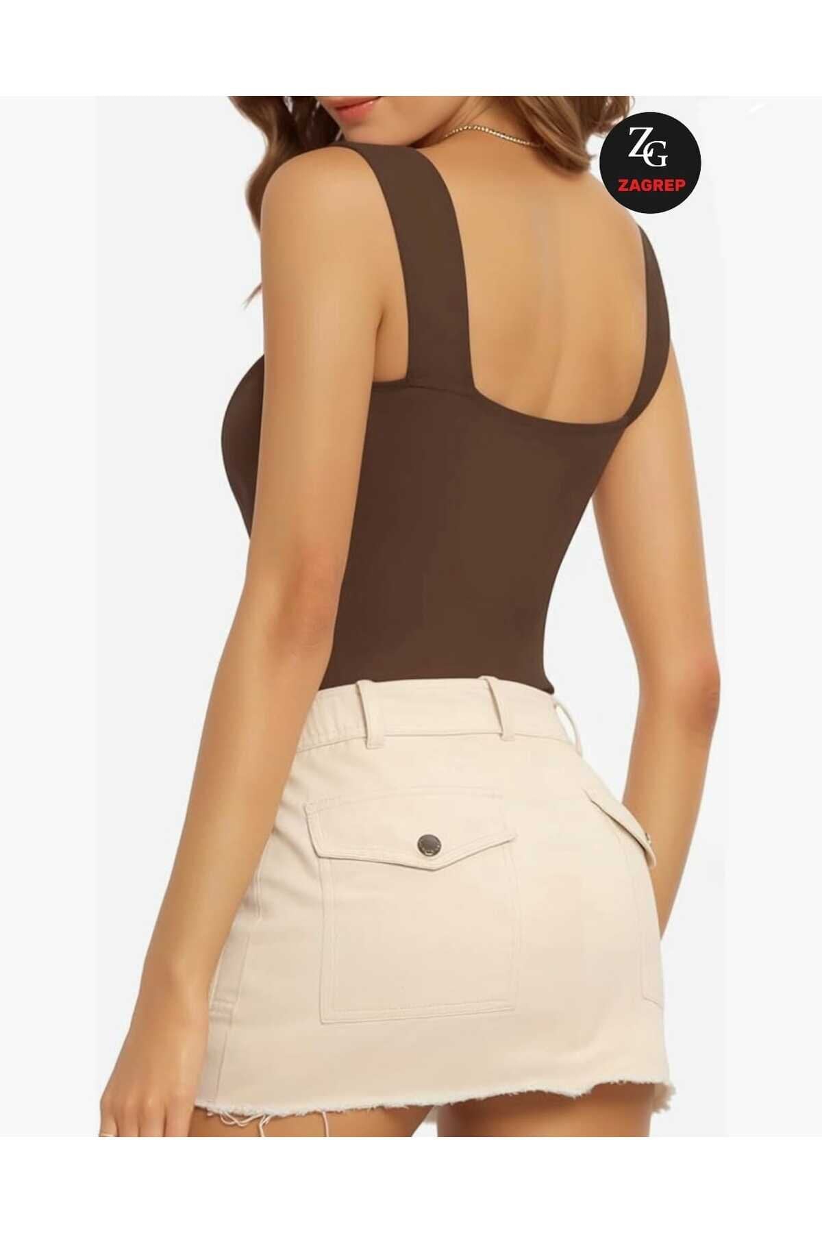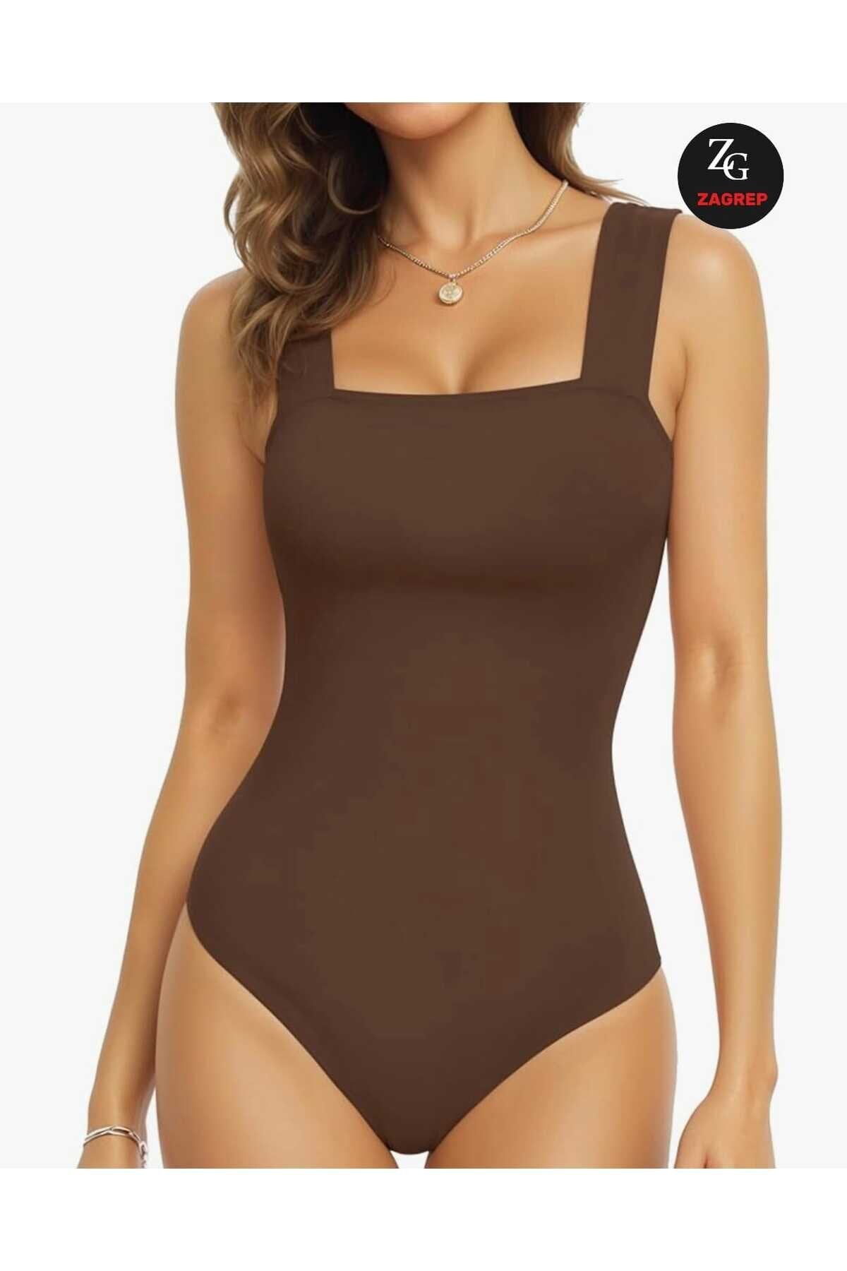 Wide-Strap Square Neck Silk Jersey Non-Sheer Body - Brown