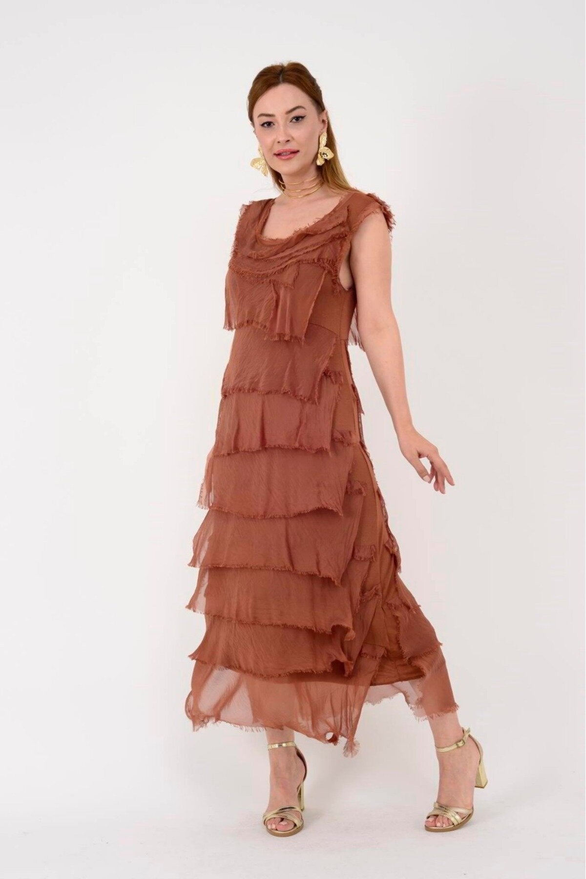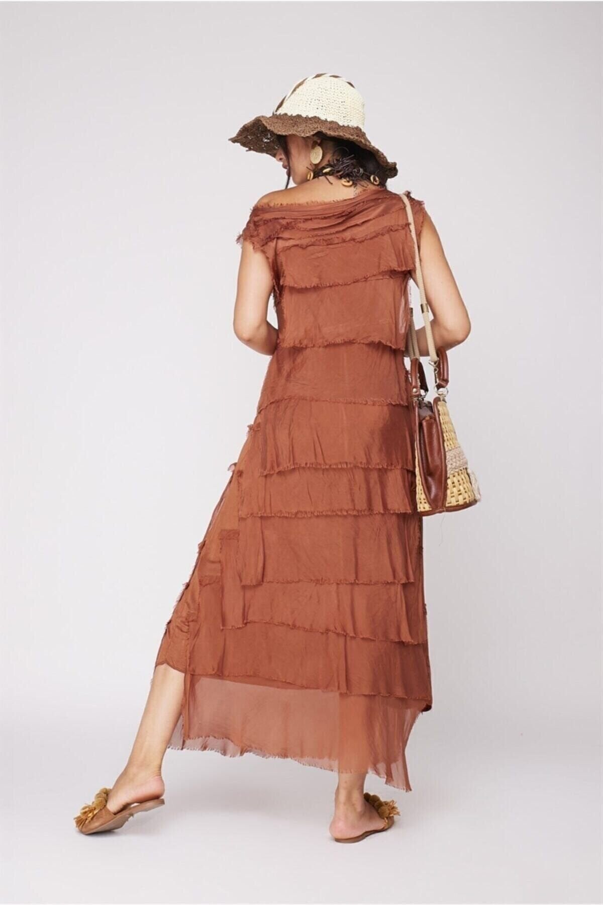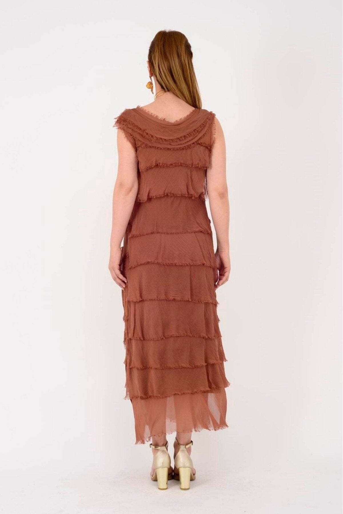 Long Italian Fit Slimming Layered Silk Dress - Cinnamon