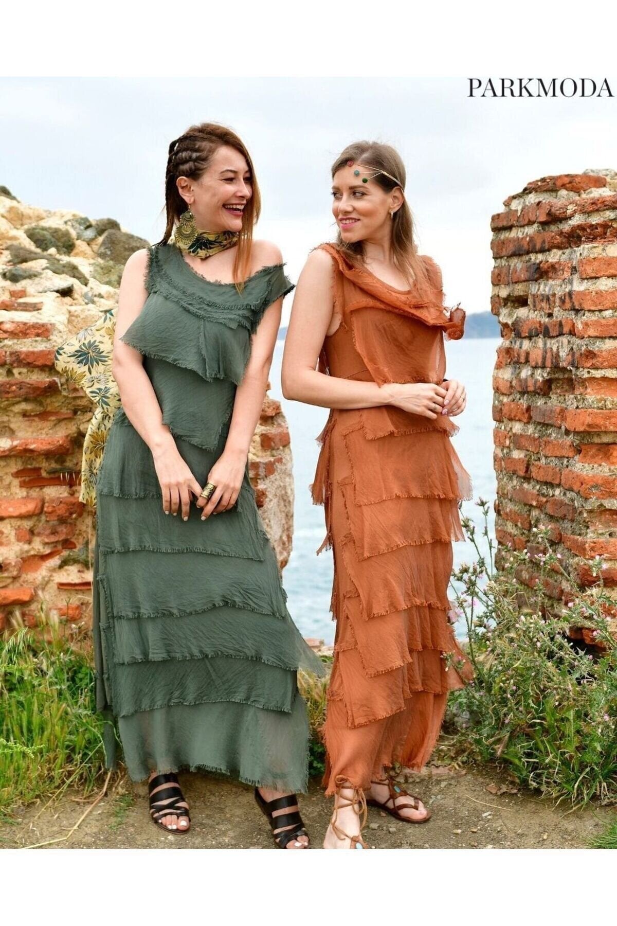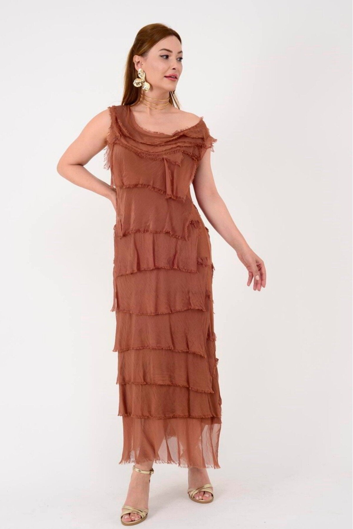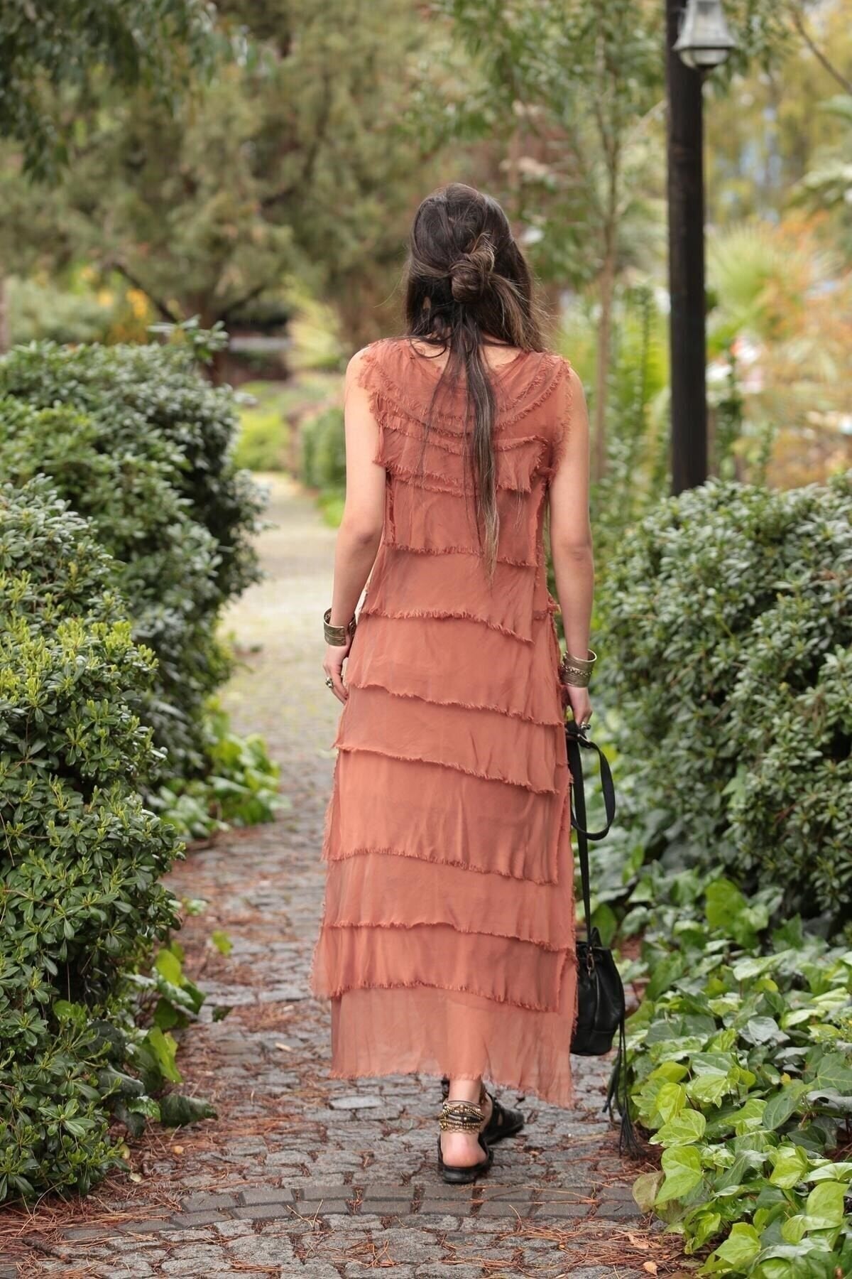 Long Italian Fit Slimming Layered Silk Dress - Cinnamon
