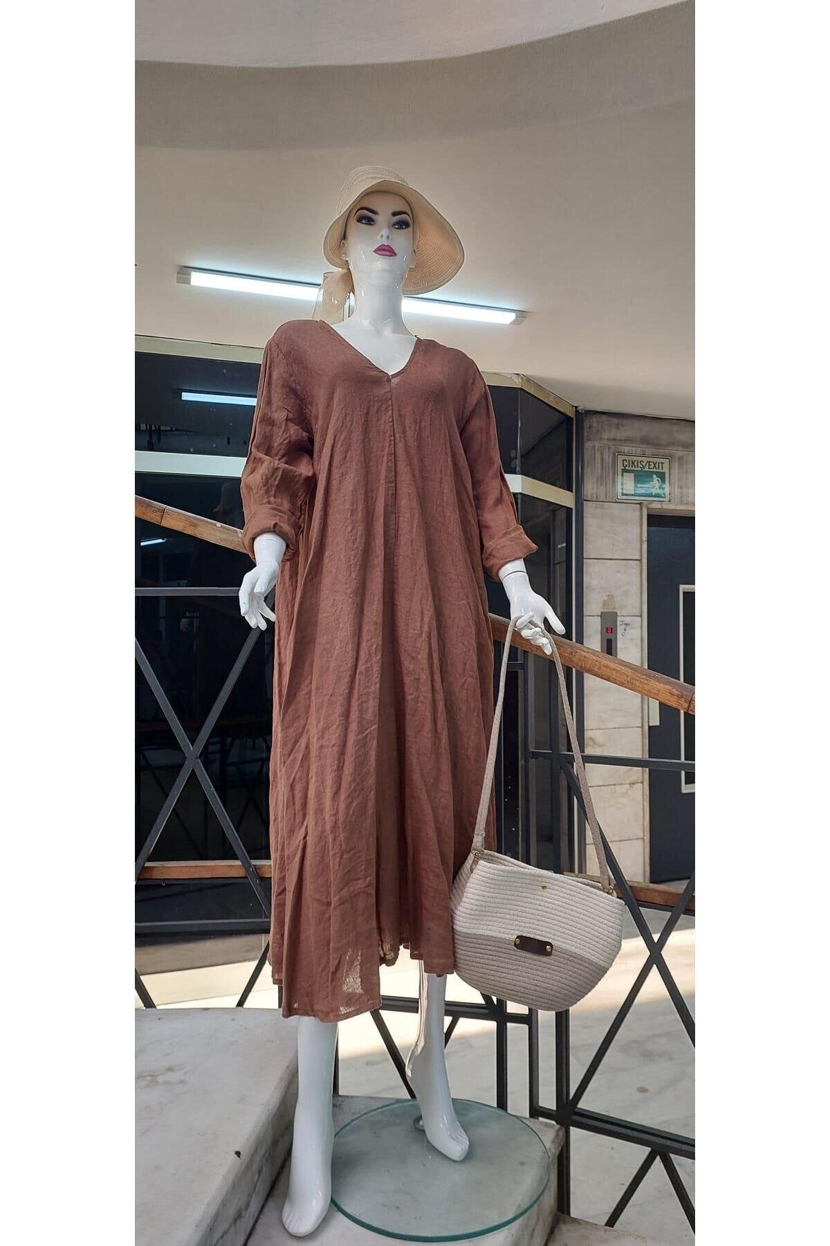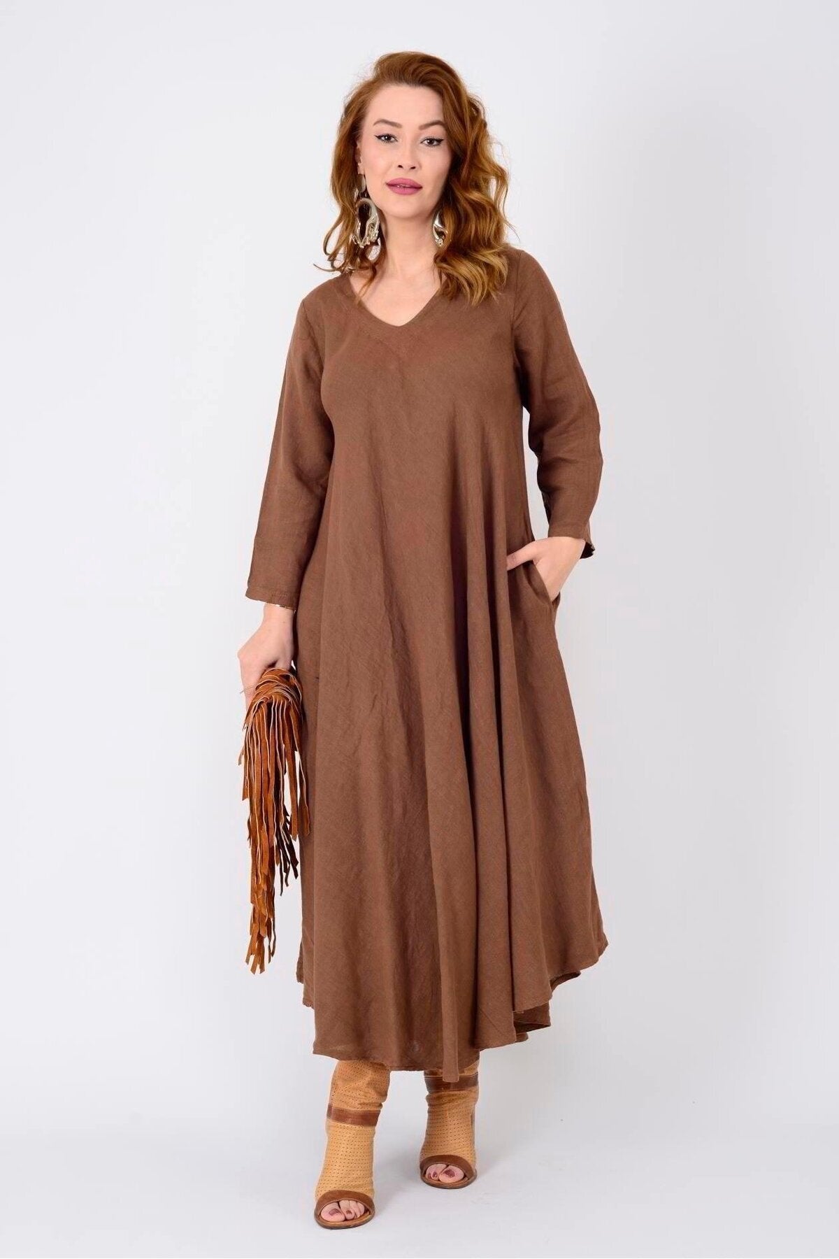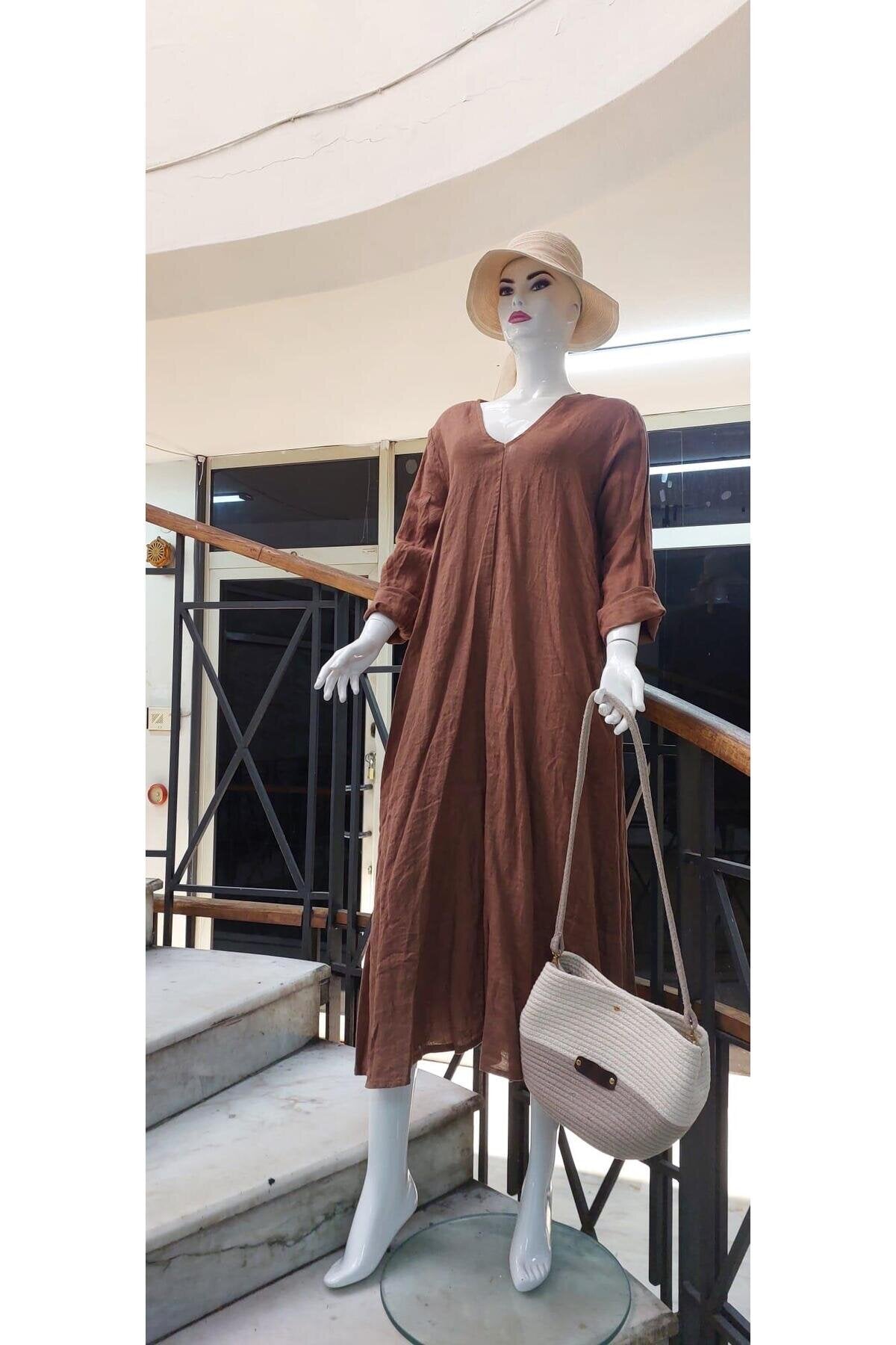 Long Sleeve Italian Linen V-Neck Dress - Brown