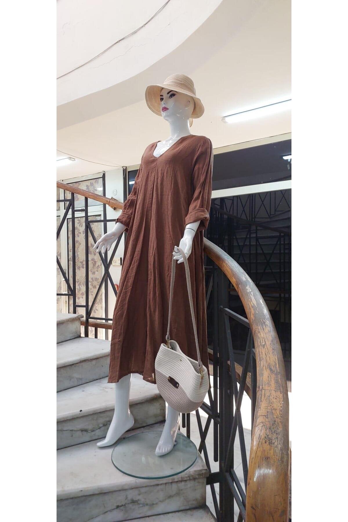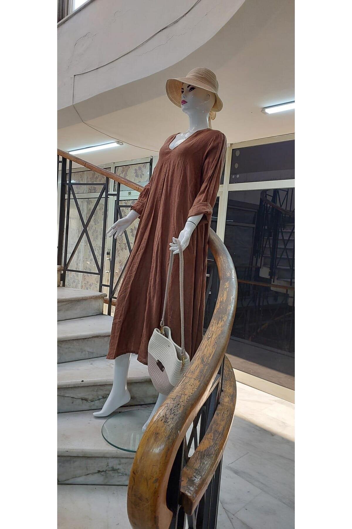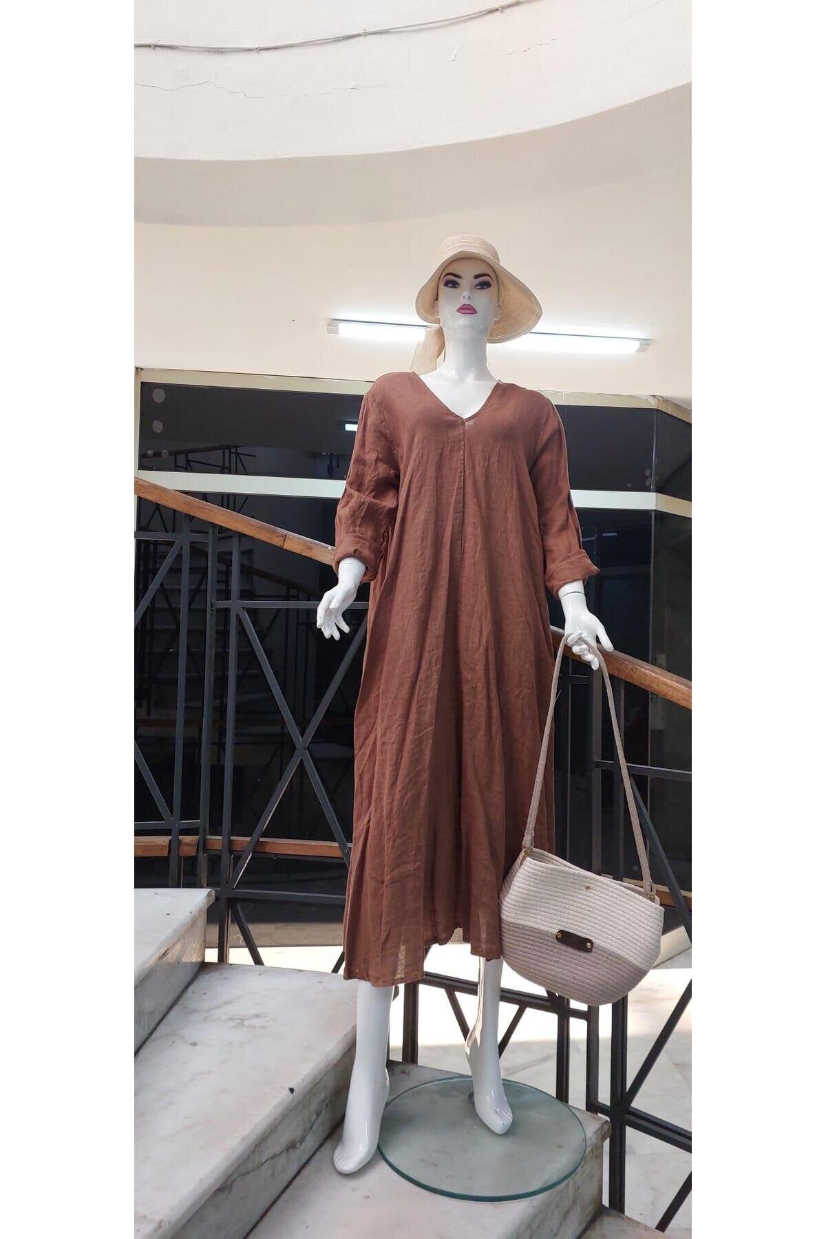 Long Sleeve Italian Linen V-Neck Dress - Brown