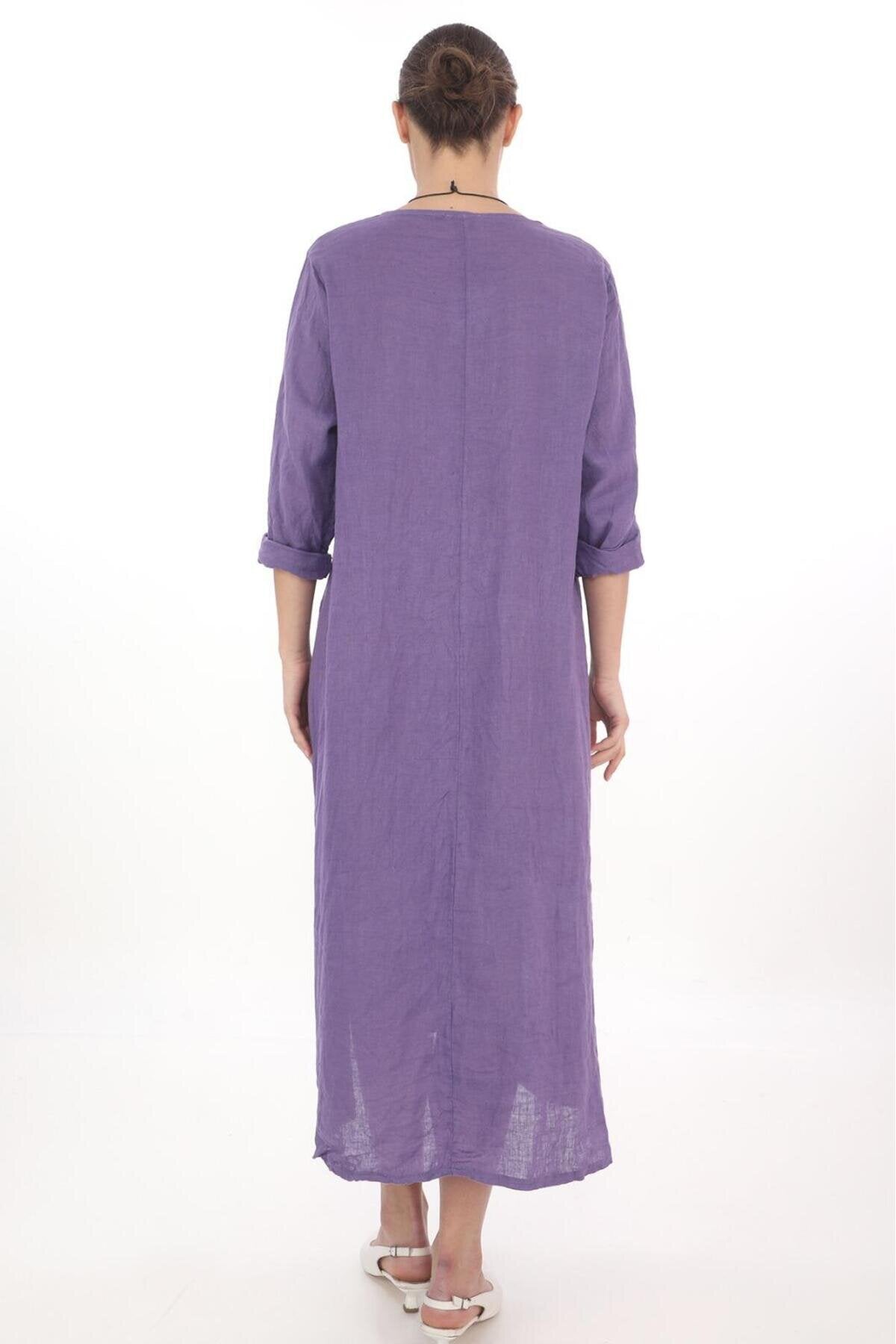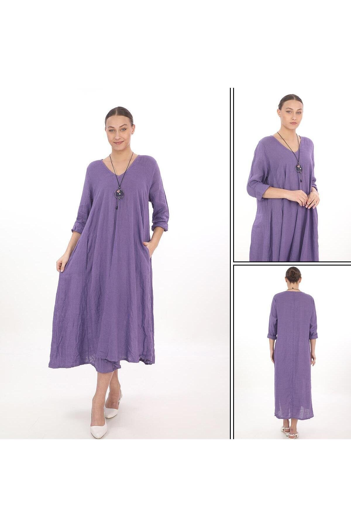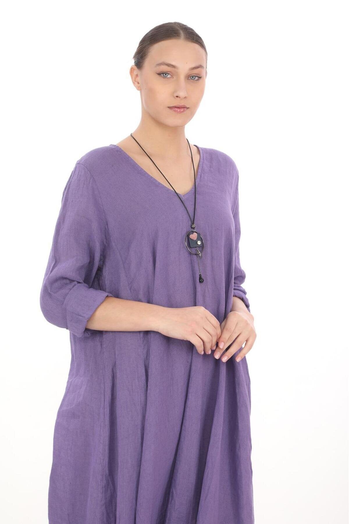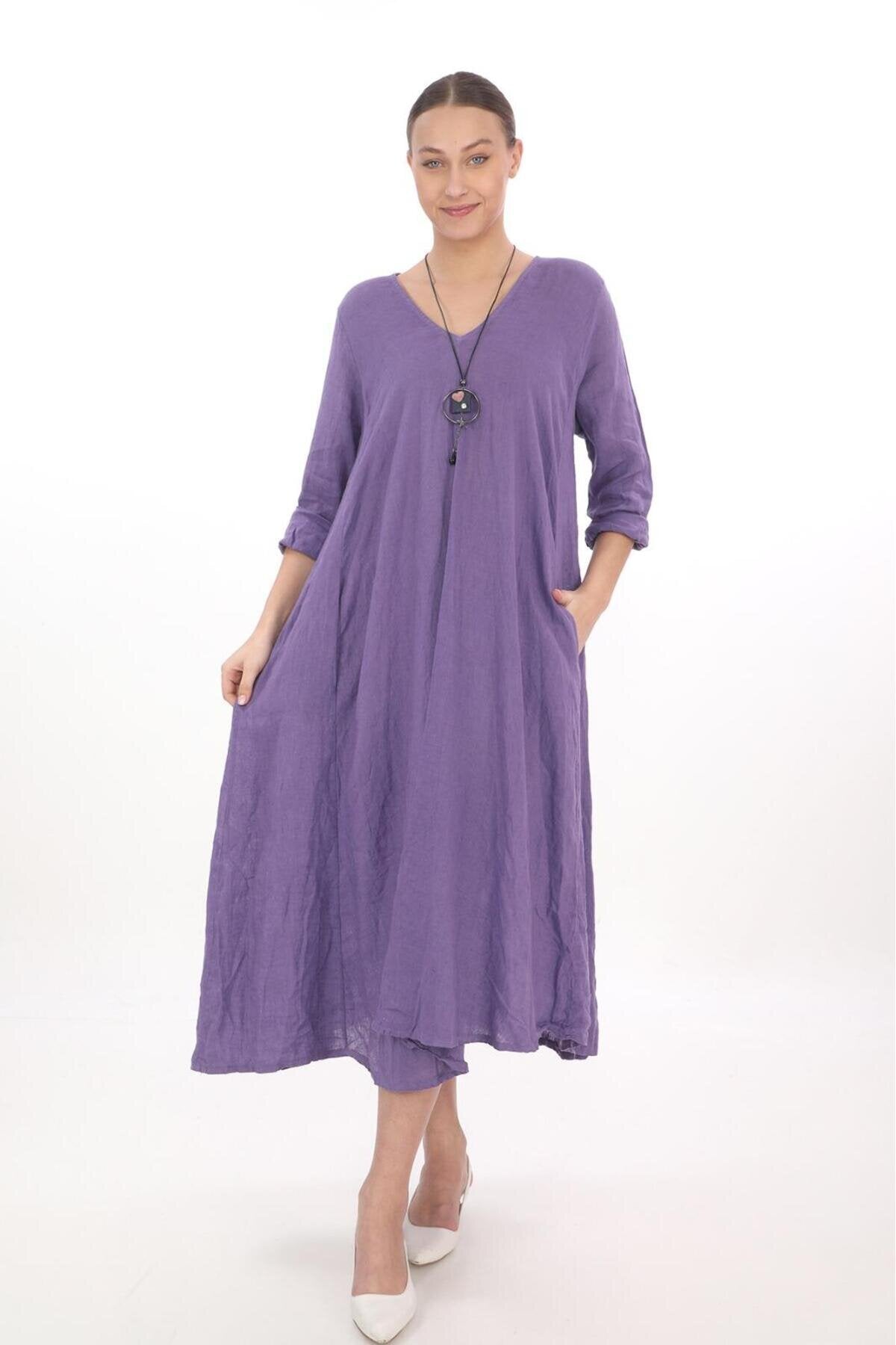 Midi Long Sleeve Italian Linen V-Neck Dress - Purple