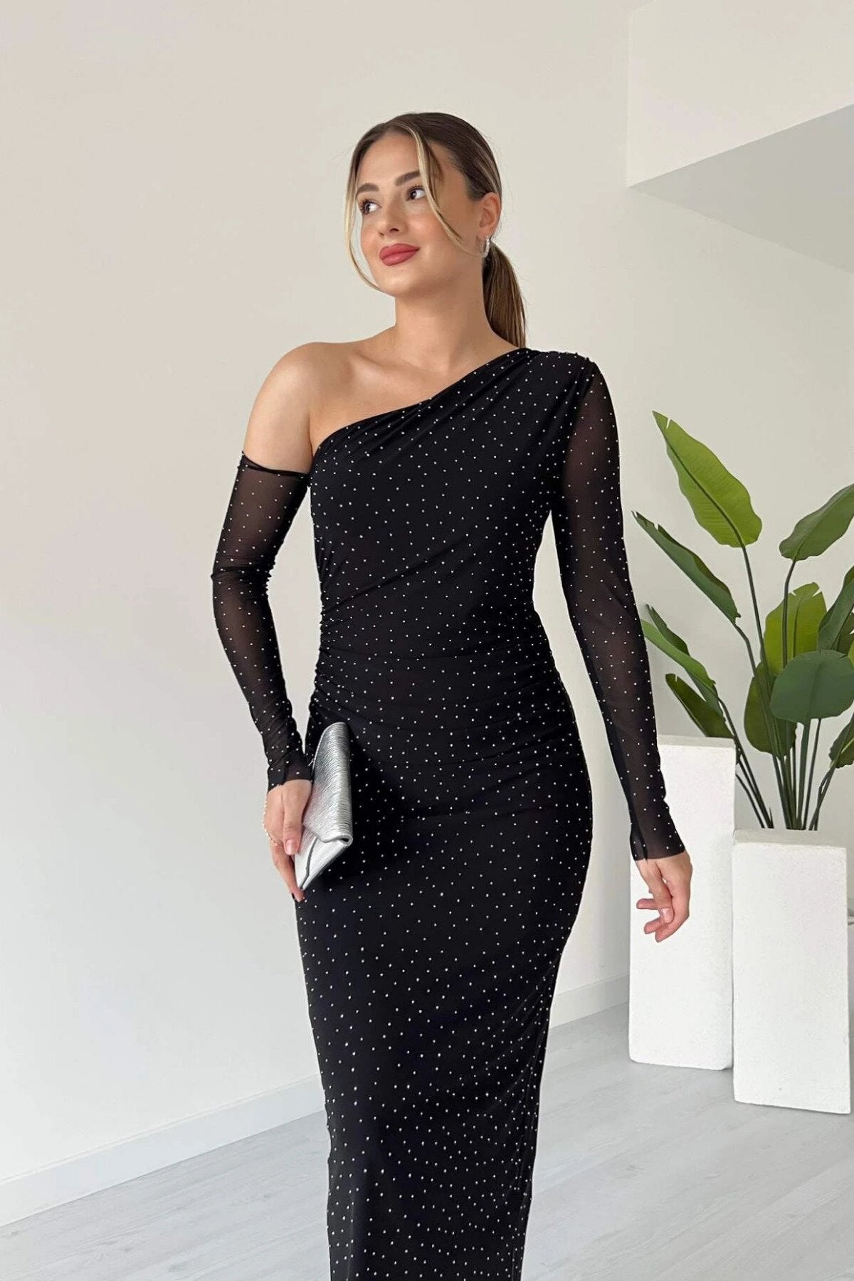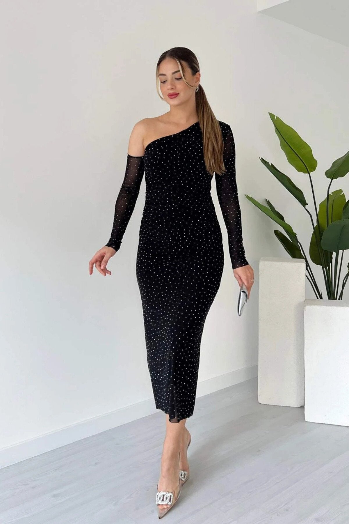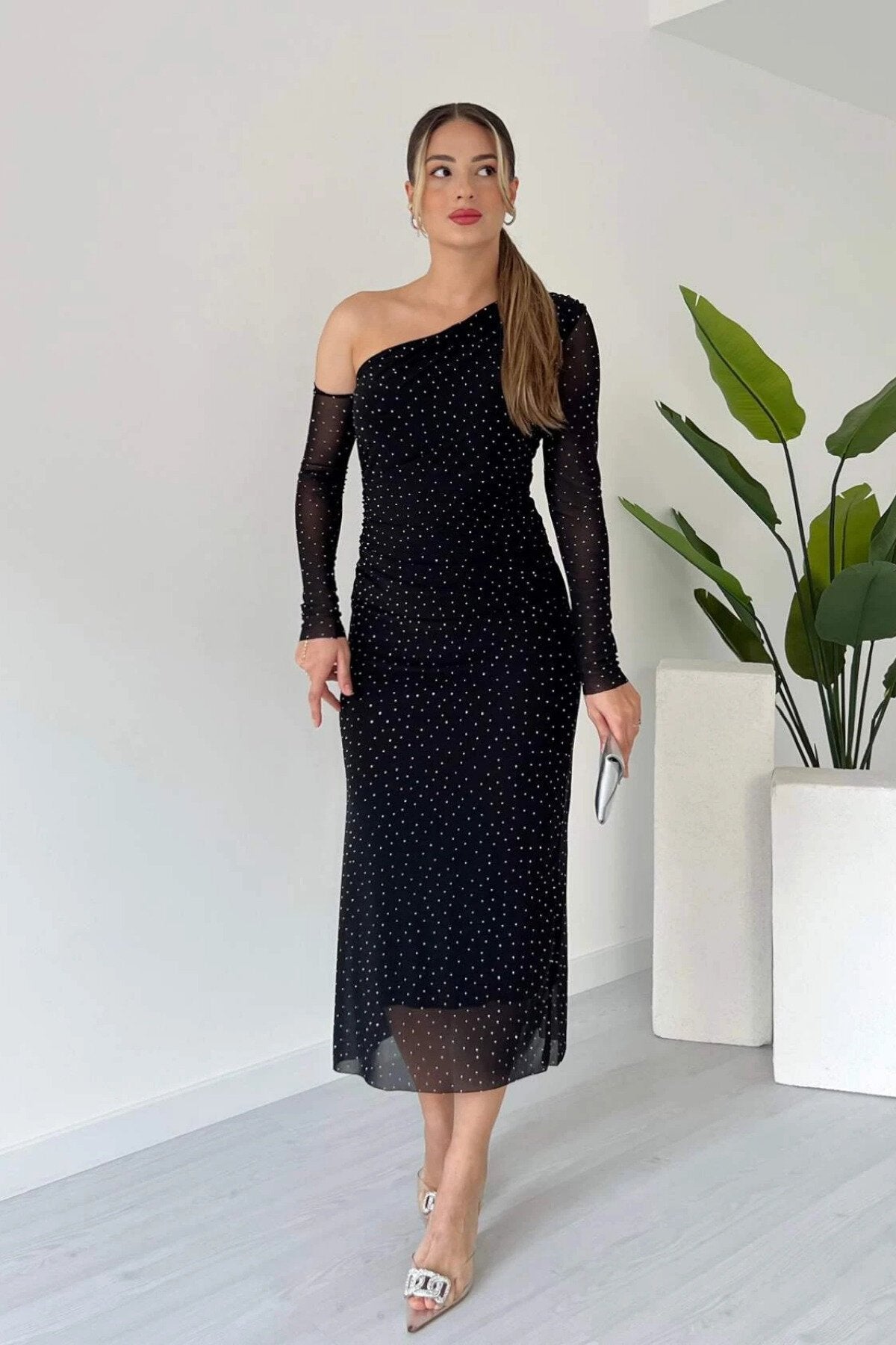 Midi One-Shoulder Tulle Stone-Detail Dress - Black