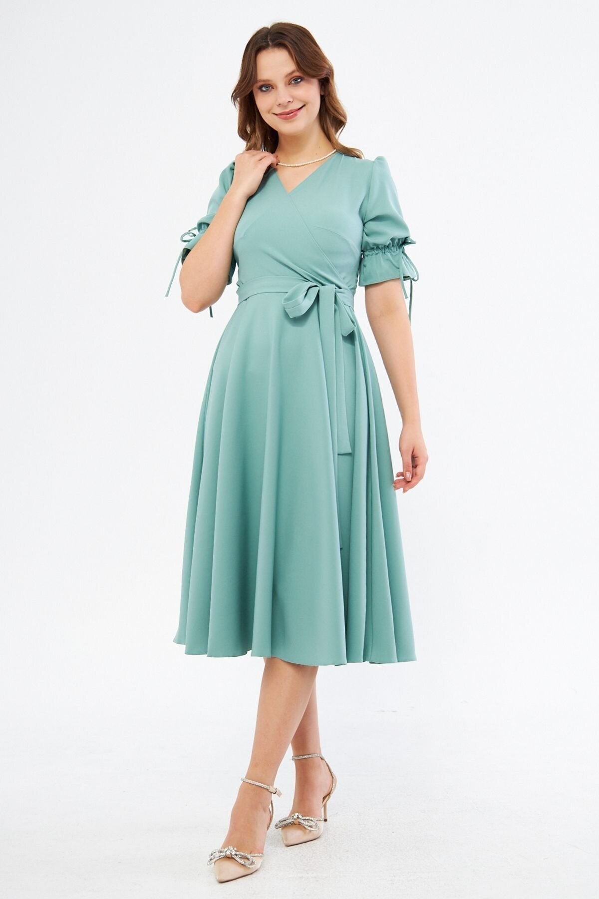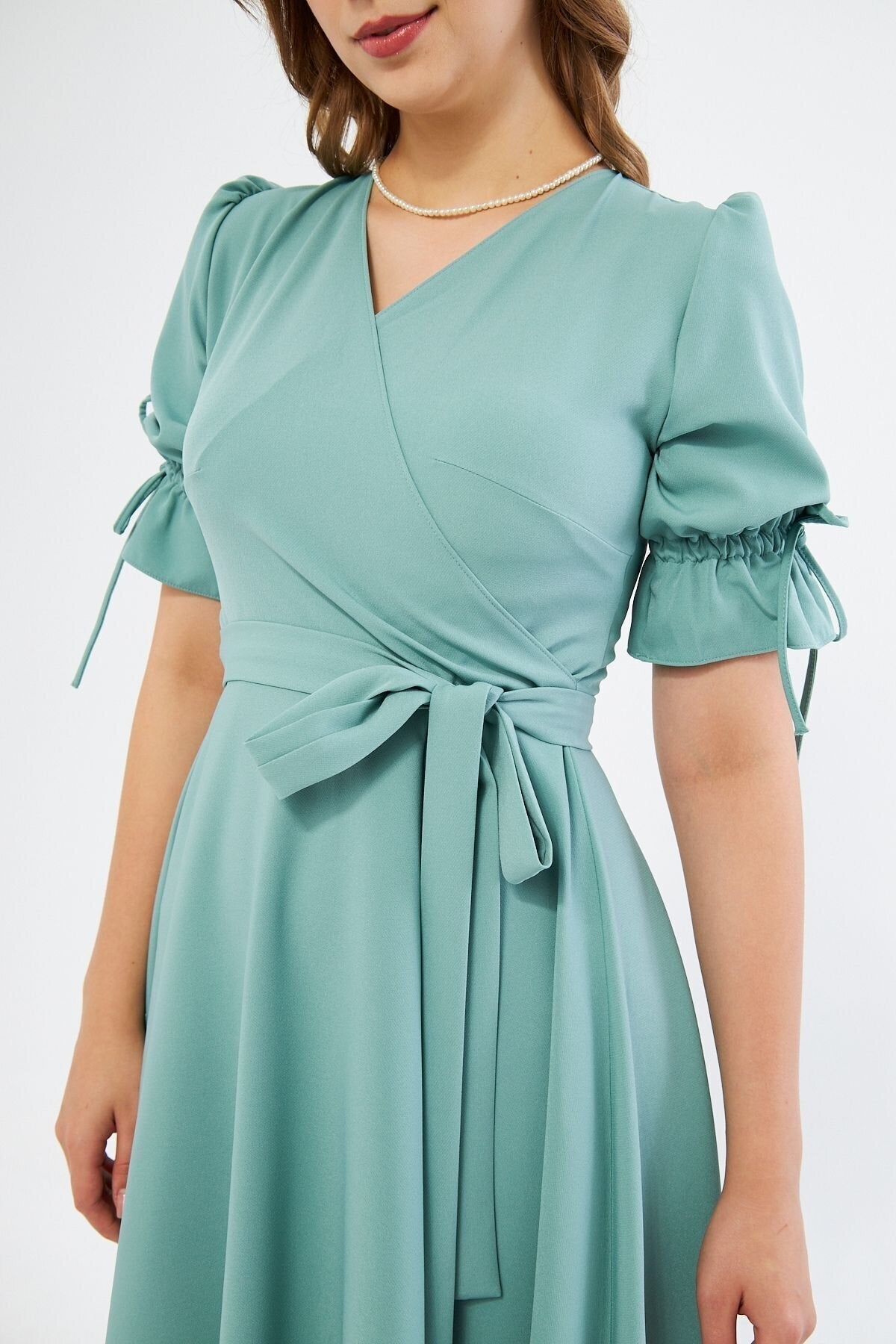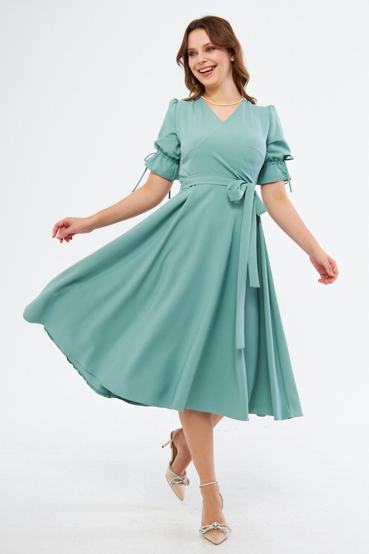 Midi Short Sleeve Wrap Neck Belted Dress - Mint Green
