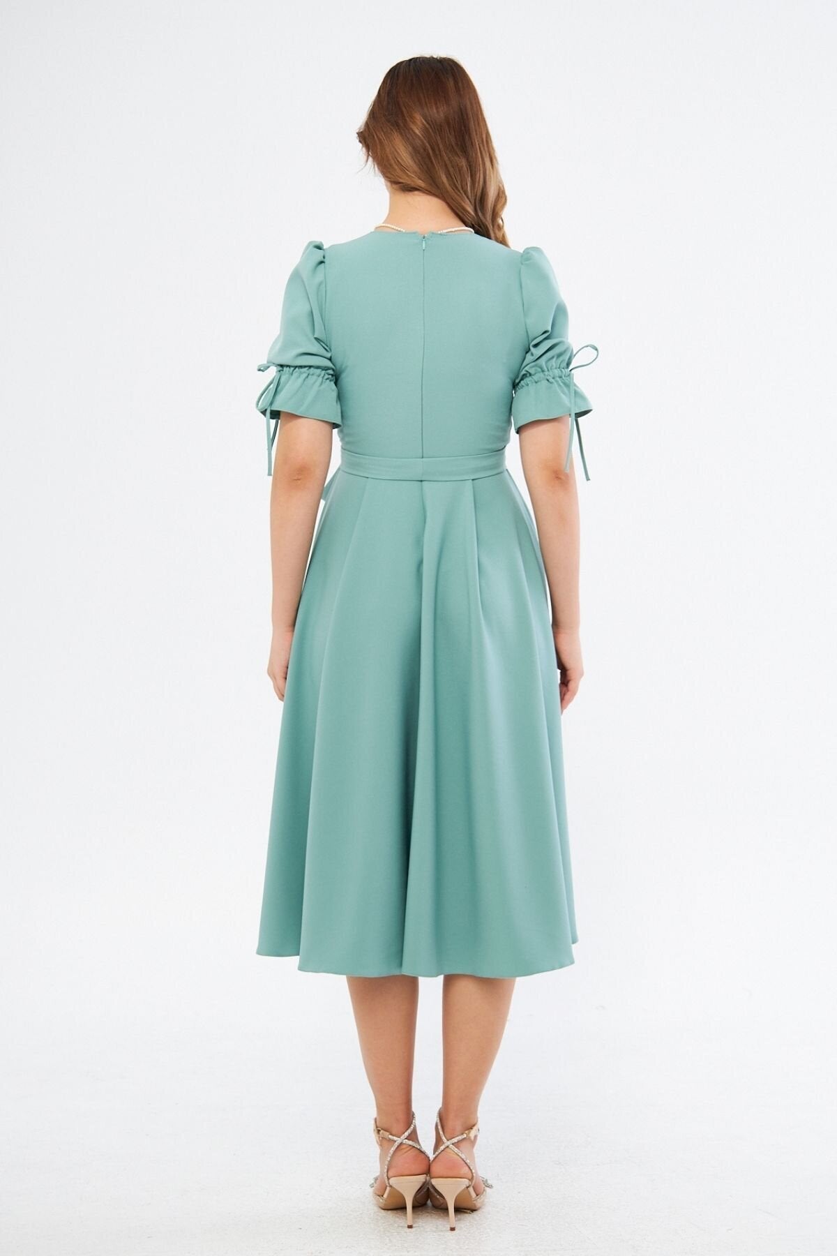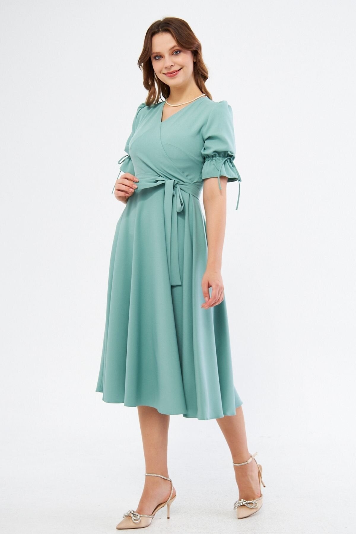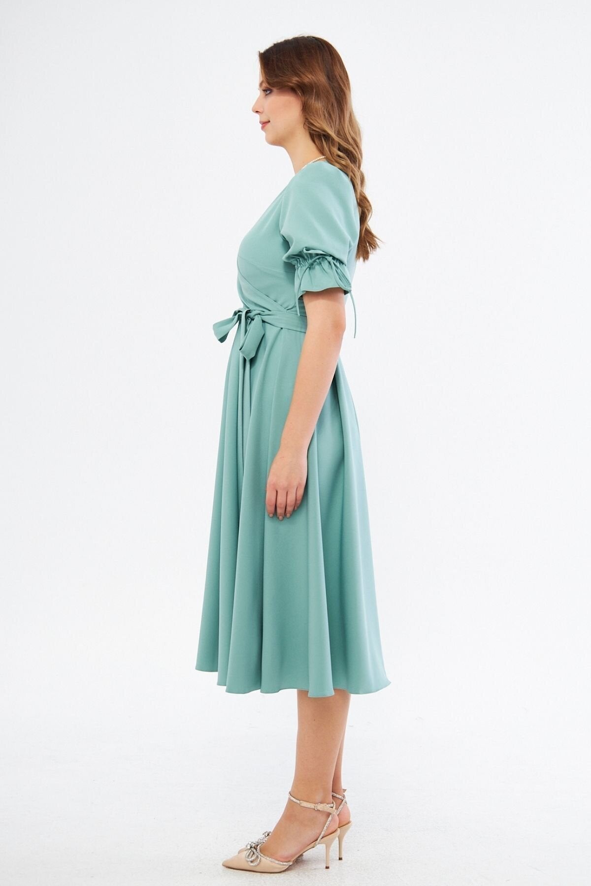 Midi Short Sleeve Wrap Neck Belted Dress - Mint Green