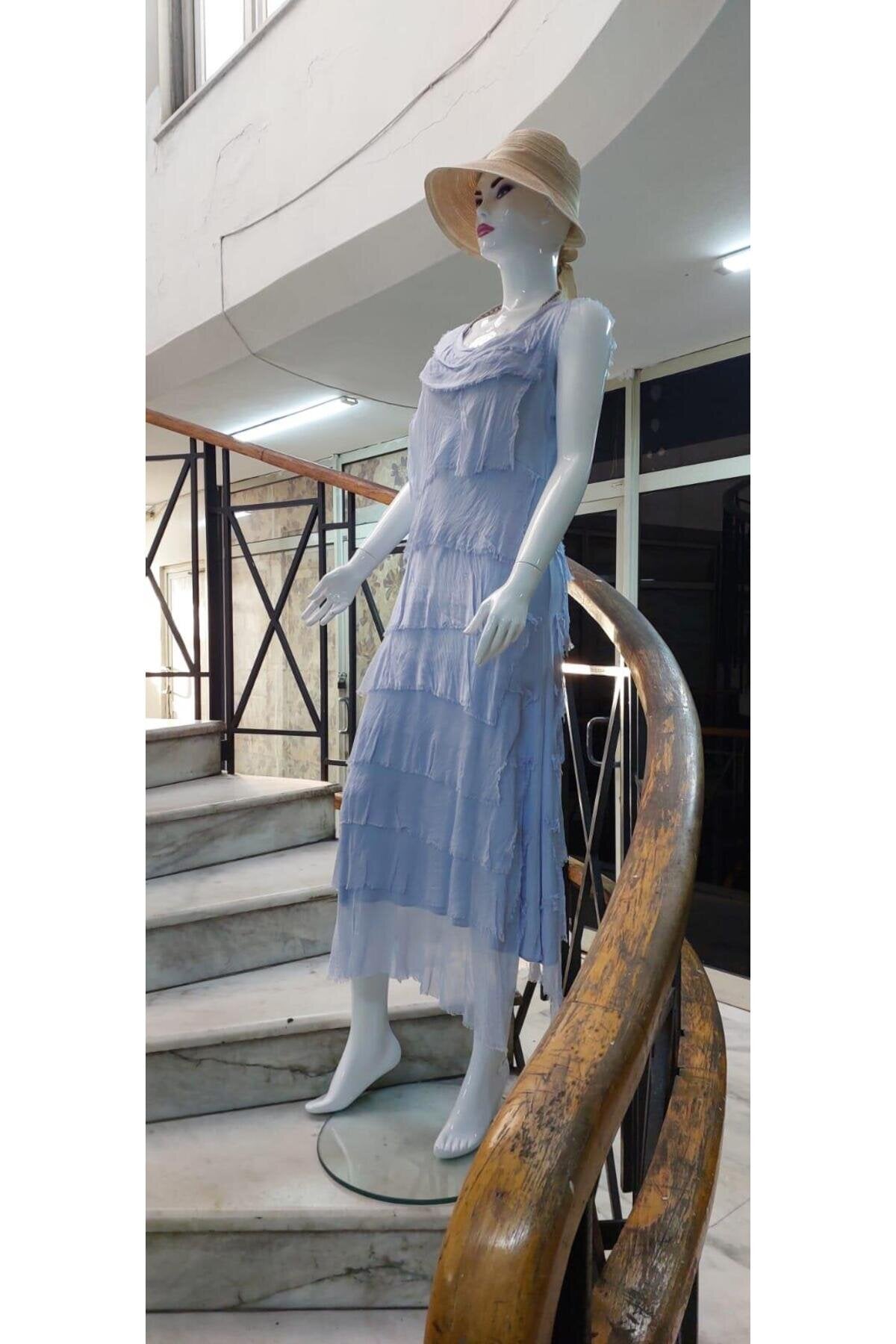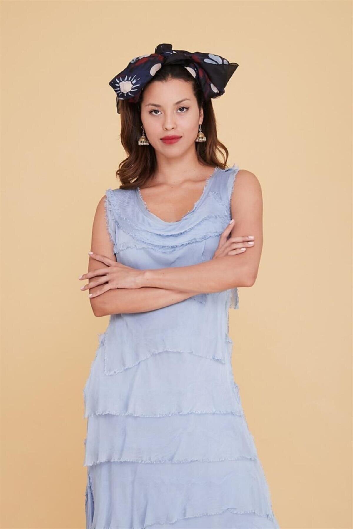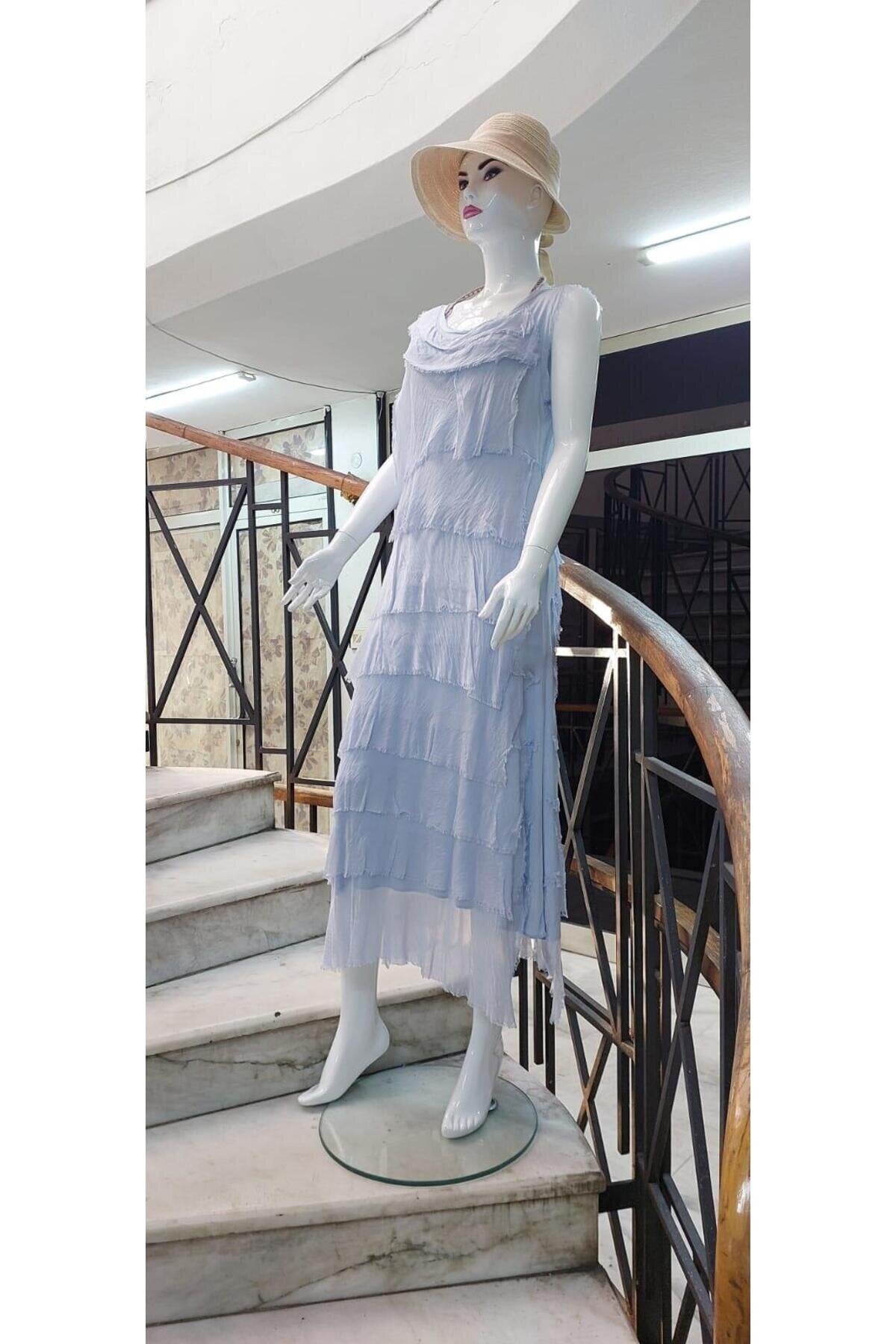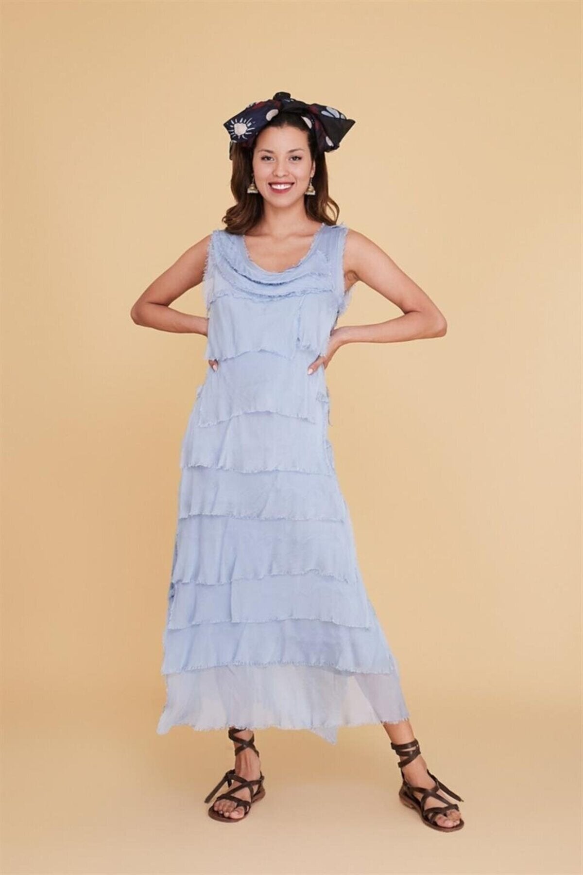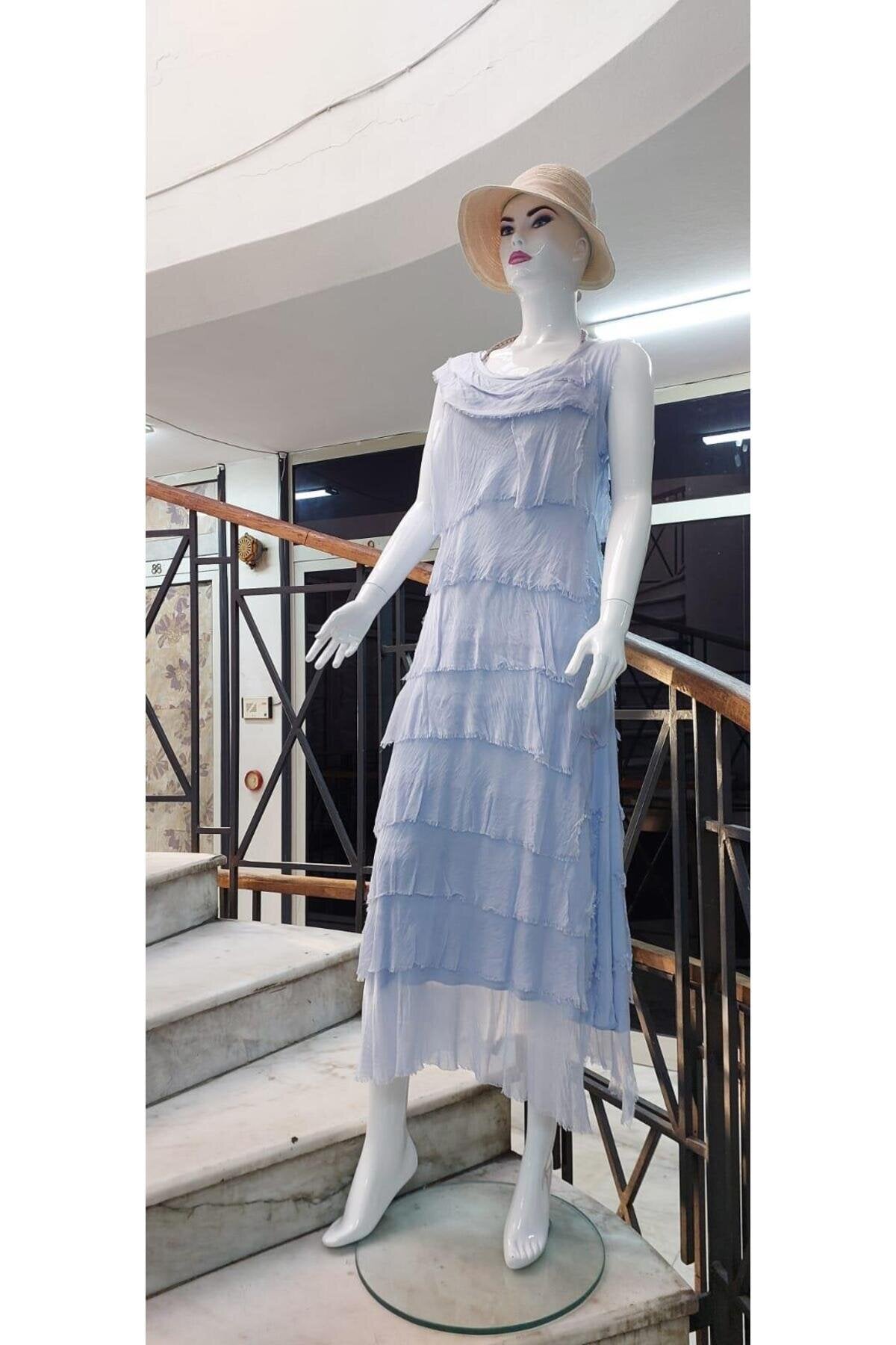 Midi Slimming Italian Tiered Silk Dress - Light Blue