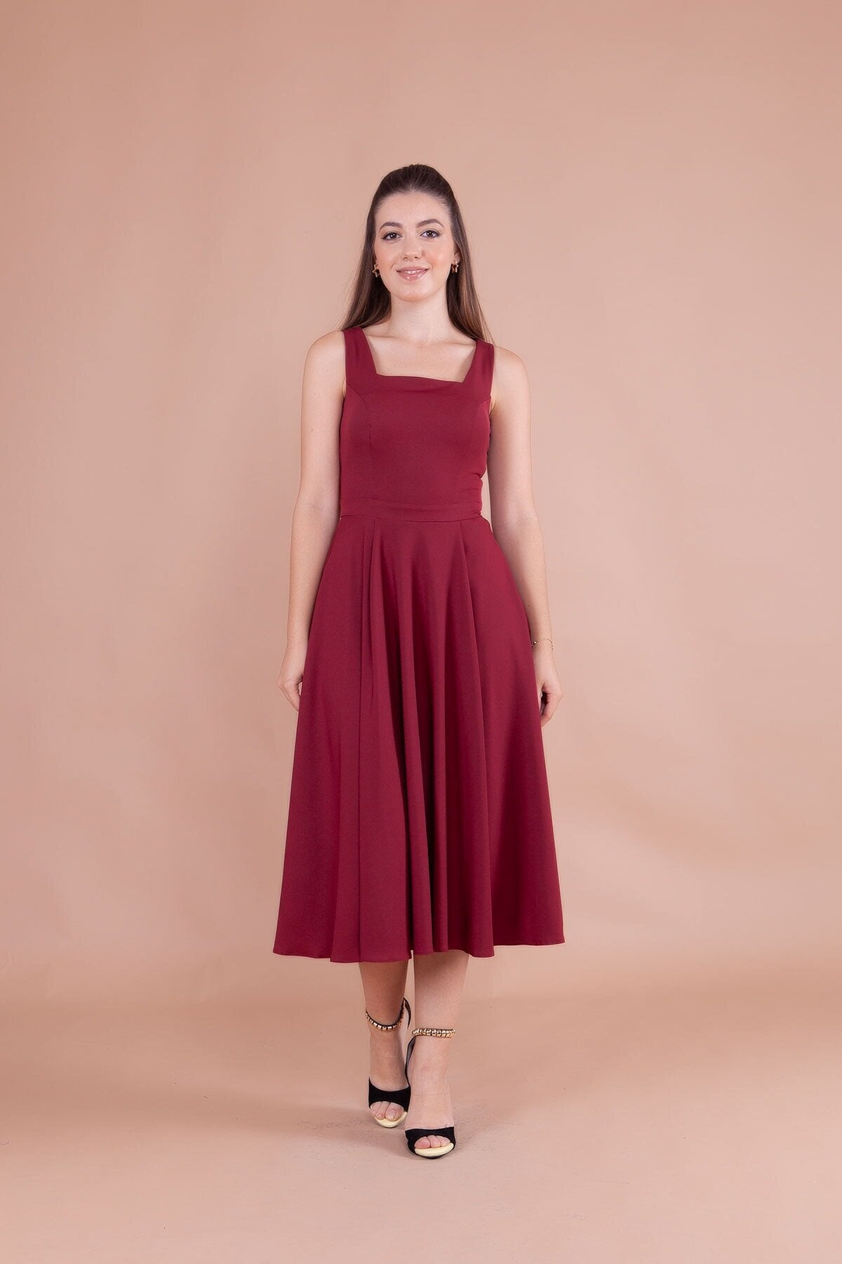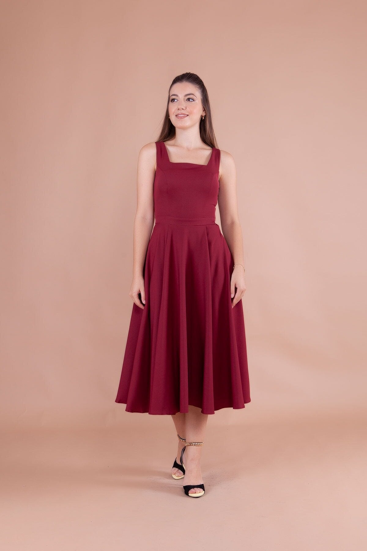 Fabric Type: Woven, Material: Cotton Polyester, Sleeve Type: Sleeveless, Pattern: Plain, Fit: Regular, Color: Burgundy, Neckline: Square Neck, Closure Type: Zipper, Sleeve Length: Sleeveless, Product Detail: Zipper, Pocket: No Pockets, Collection: Prom/Bridesmaid, Thickness: Medium, Lining Status: Unlined, Length: Midi, Persona: Fashion Forward, Silhouette: Flared, Occasion: Wedding/Ceremony, Weave Type: Tulle, Additional Features: No Additional Features, Print/Embroidery Technique: Unprinted, Belt/Sash Status: No Belt, Sustainability Detail: Yes, Package Contents: Single Item