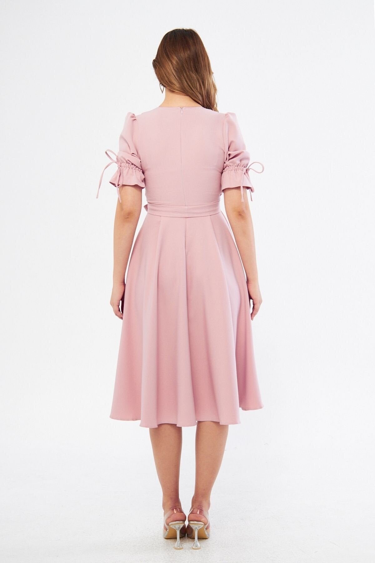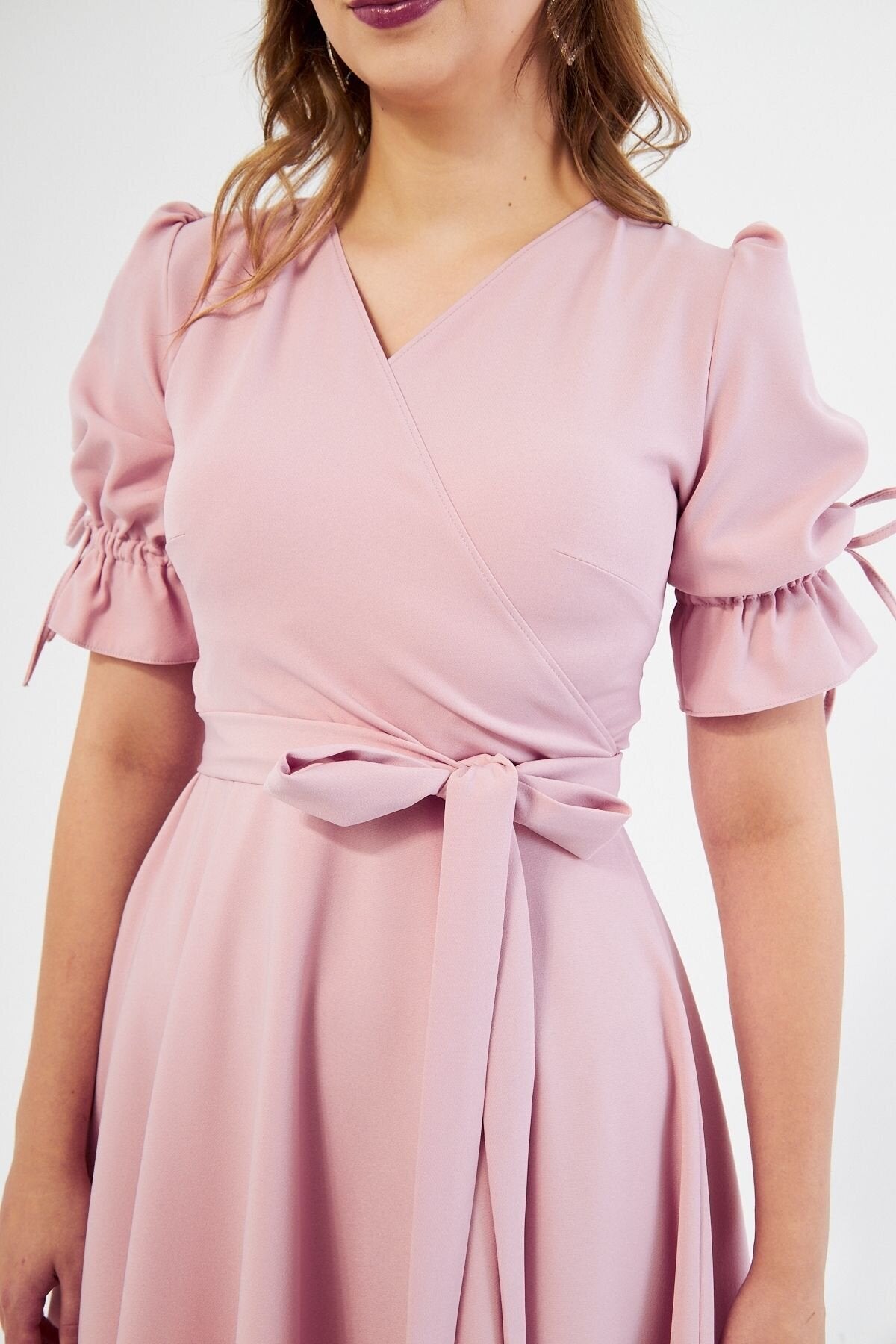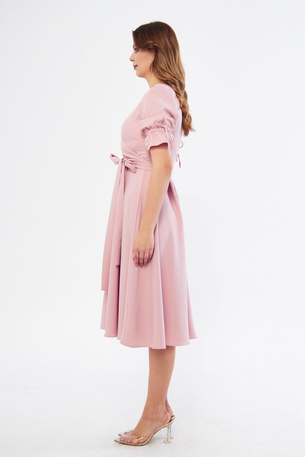 Midi Wrap Neck Ruched Belted Dress - Blush