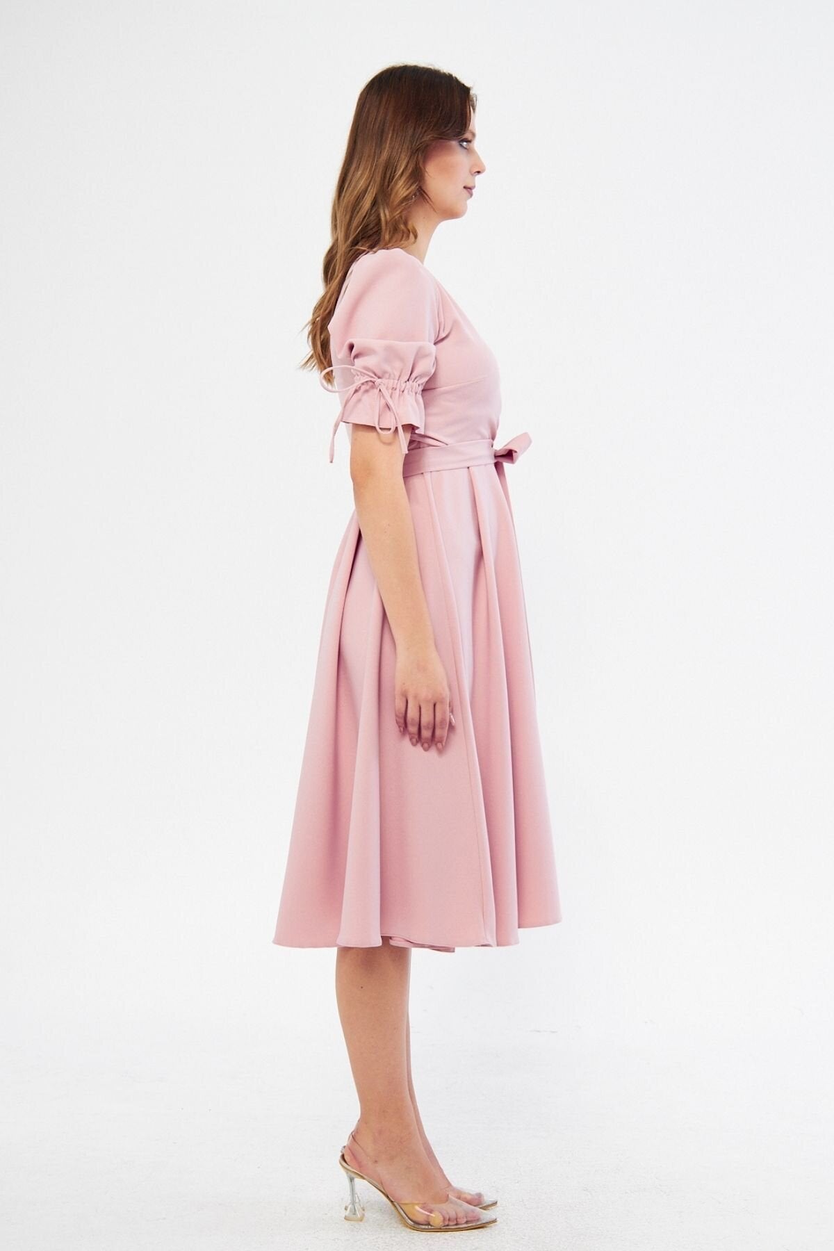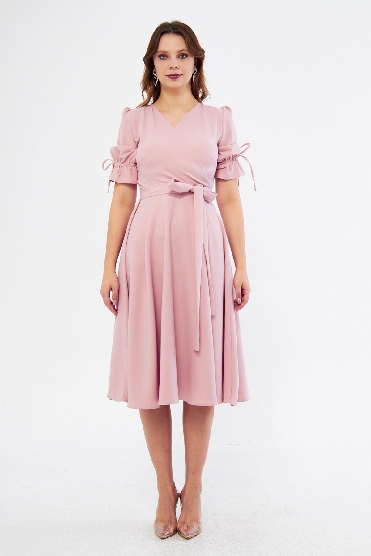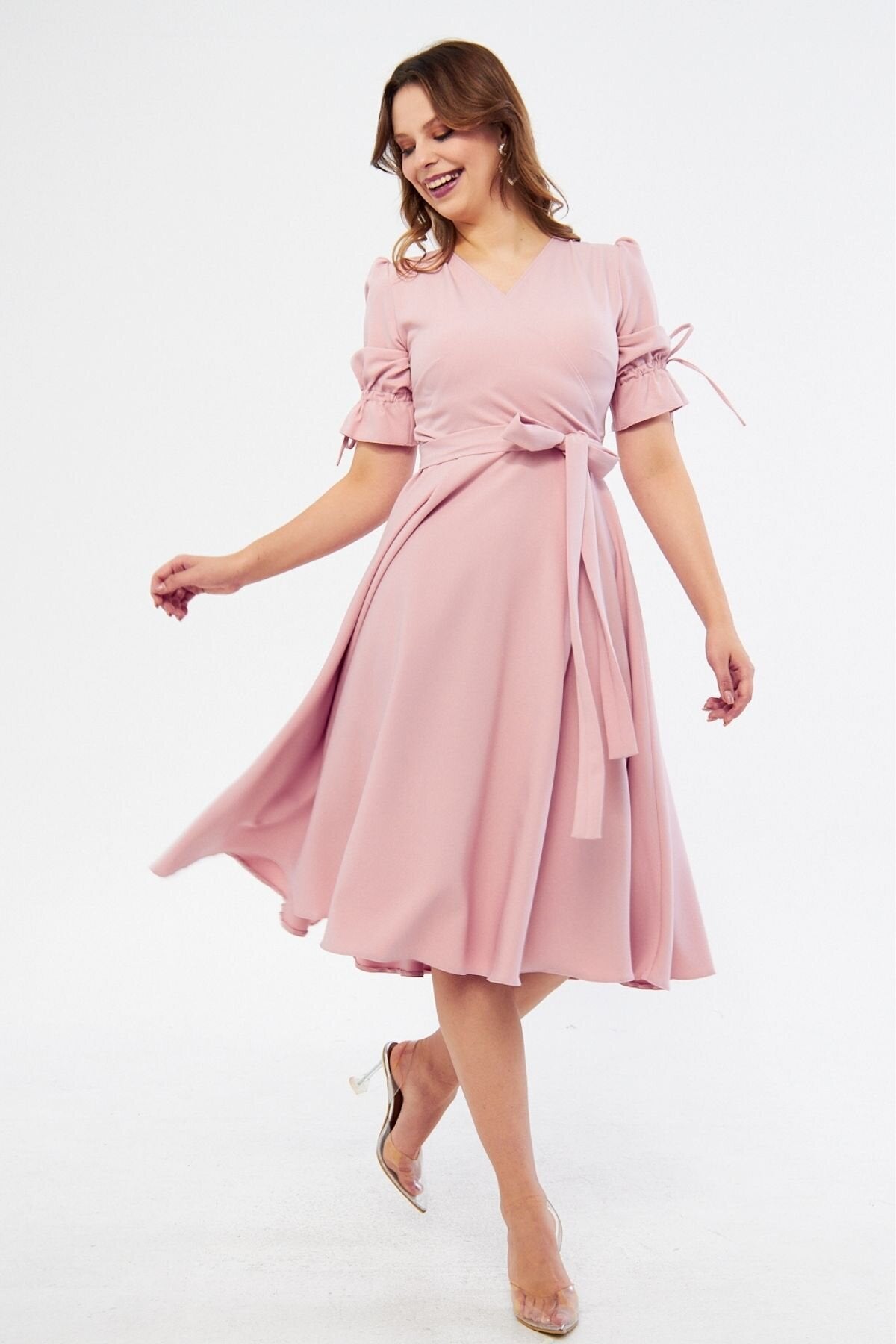 Midi Wrap Neck Ruched Belted Dress - Blush