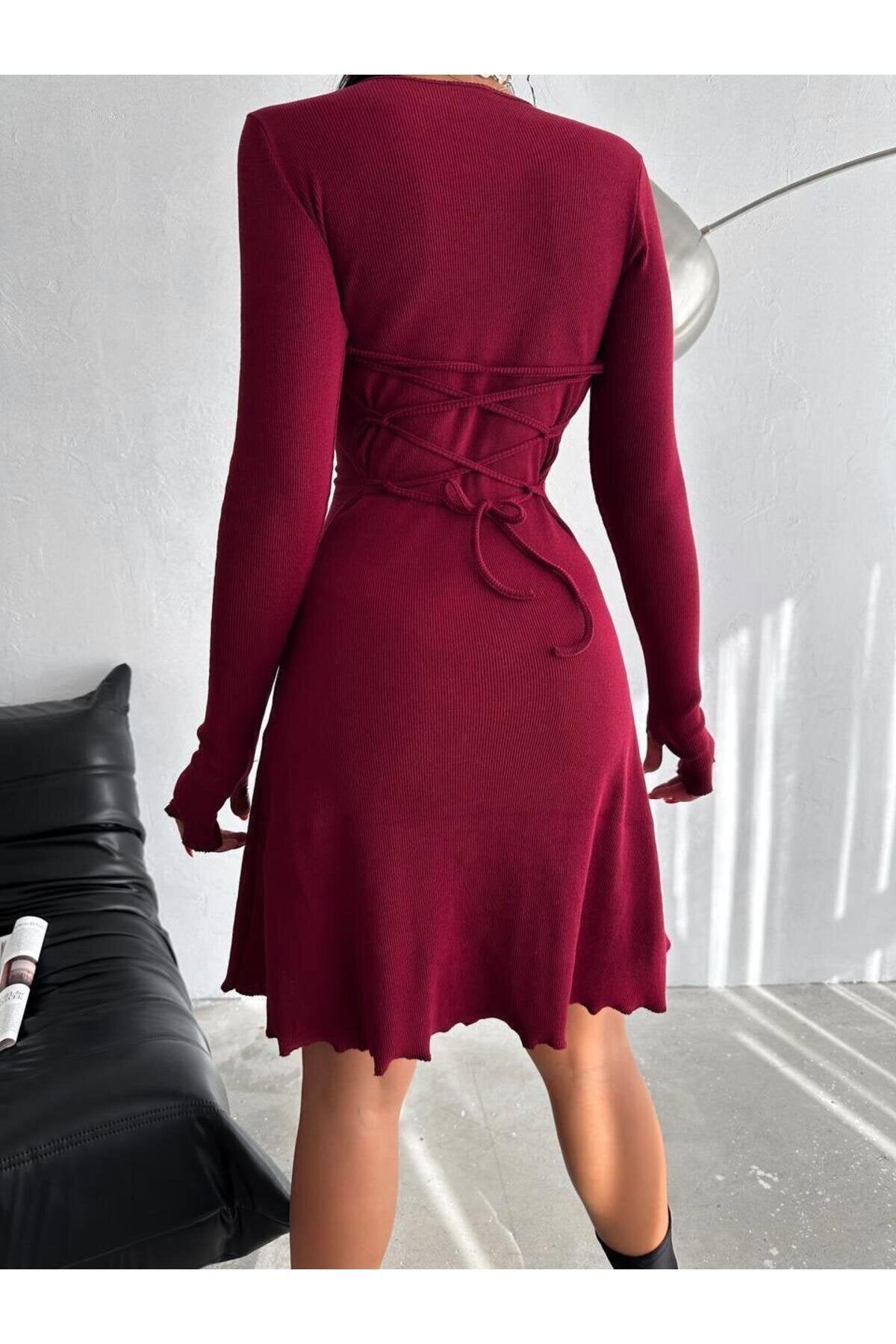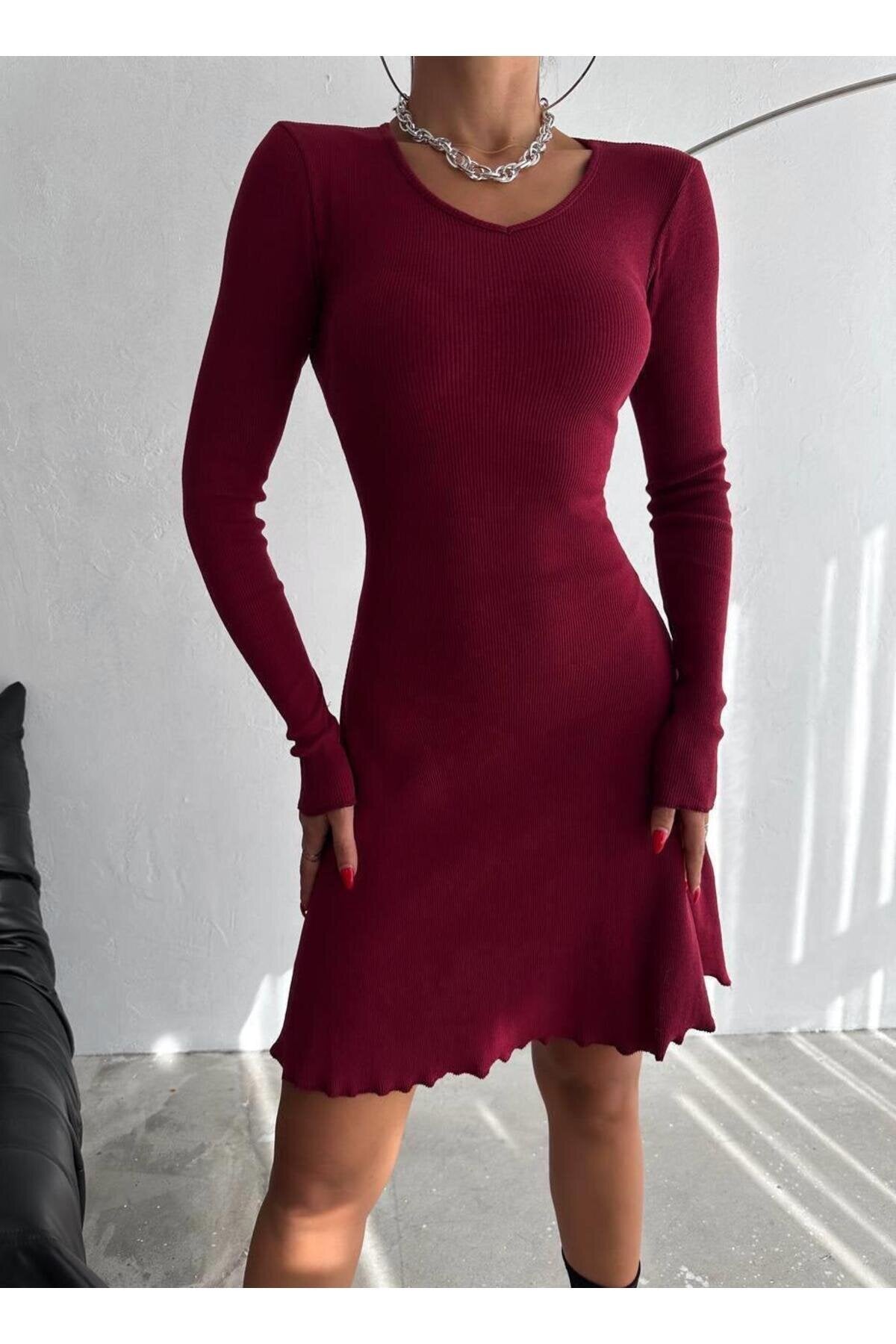 A stylish and comfortable casual dress, crafted from burgundy rib knit fabric. It offers a feminine touch with tie-back details. Its slim fit design, appealing to the energy of youth, elegantly hugs the body lines. With its long-sleeved and short length cut, it provides ideal comfort during seasonal transitions. Thanks to its material, composed of a blend of 95% cotton and 5% polyester, it offers all-day comfort with its soft texture. A simple and modern look is achieved with its round neck design. With its pocketless design, it is ideal for those who embrace minimalist aesthetics. It is suitable for long-term use when cared for according to washing instructions. With its single pack content, you can easily purchase and use it. Its medium thickness fabric enhances its versatility for all seasons. Thanks to its beltless design, it allows the freedom to combine with different belts. The unlined design provides lightness and breathability. While offering a simple and stylish look with its unprinted texture, it features textured pattern details. Product Attributes: Color: Burgundy, Material: Rib Knit, Package Content: Single, Occasion: Casual, Print/Embroidery Technique: Unprinted, Season: All Seasons, Length: Short, Additional Feature: Washed finish, Thickness: Medium, Gender: Women / Girls, Cup: Cupless, Sleeve Type: Long Sleeve, Pattern: Textured, Knit Type: Rib Knit, Fabric Type: Woven, Age Group: Young Adult, Material Composition: 95% Cotton, 5% Polyester, Fit: Slim Fit, Lining Status: Unlined, Product Detail: Tie-back Detail, Belt/Sash Status: Beltless, Washing Instruction: Type 1, Closure Type: No Closure, Collection: Young, Origin: TR, Neckline: Round Neck, Pocket: Pocketless, Sleeve Length: Long, Persona: Young, Silhouette: Pencil, Sustainability Detail: No, Box Status: No Box.
