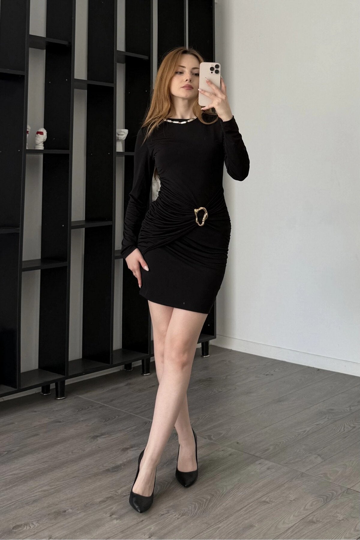 Embrace timeless elegance with this captivating black mini dress, expertly tailored to accentuate your silhouette. Its sleek, long-sleeved design is elevated by thoughtful details, making it an essential piece for a refined wardrobe. This bodycon mini dress promises a sophisticated allure that transitions effortlessly.