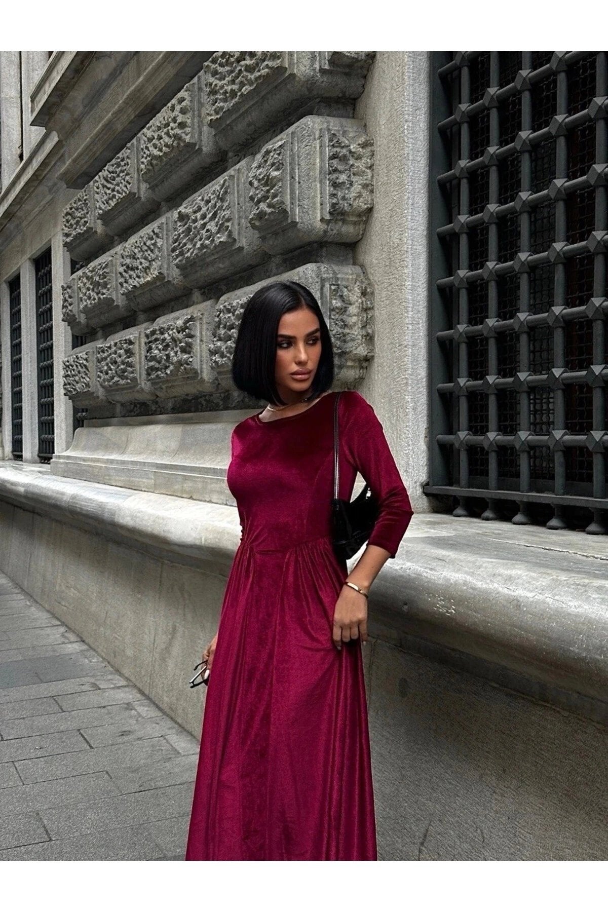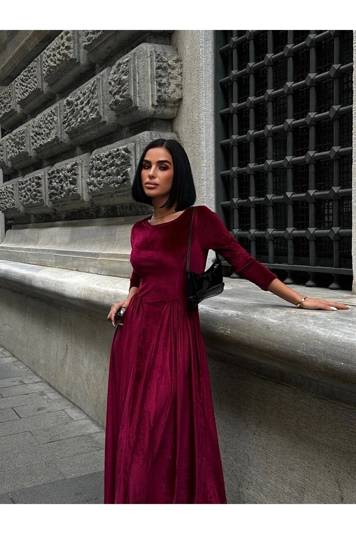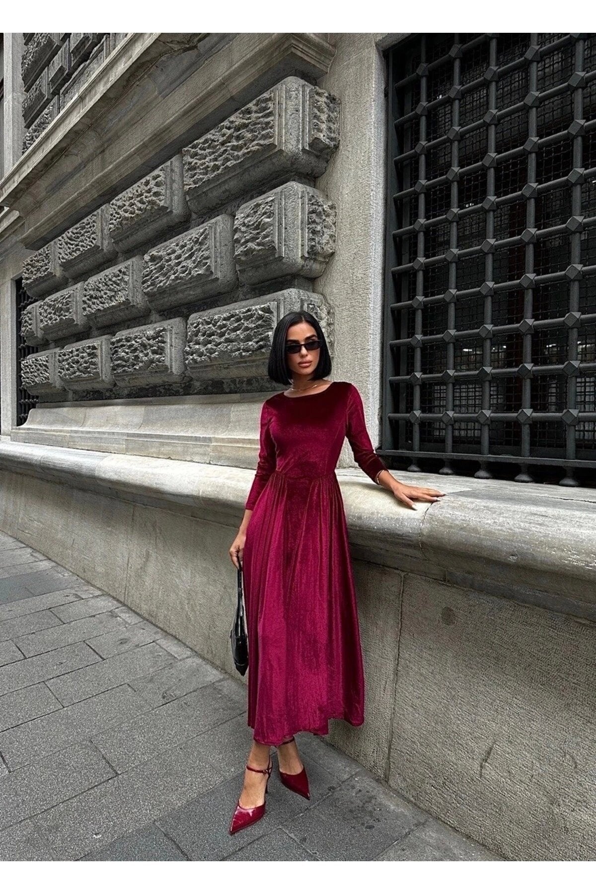 Fabric Type: Woven, Material: Velvet, Sleeve Type: Long Sleeve, Pattern: Plain, Color: Burgundy, Fit: A-line, Neckline Type: Crew Neck, Closure Type: No Closure, Sleeve Length: Long, Product Detail: Belted, Pockets: No Pockets, Collection: Basic, Thickness: Medium, Lining: Unlined, Length: Maxi, Persona: Feminine, Silhouette: Pleated, Occasion: Classic, Weave Type: Velvet, Additional Feature: Opaque, Print/Embroidery Technique: No Print, Belt/Sash Status: Belted, Sustainability Detail: No, Package Contents: 1+, Cup: Cupless, Season: Winter, Origin: TR, Box Status: No Box