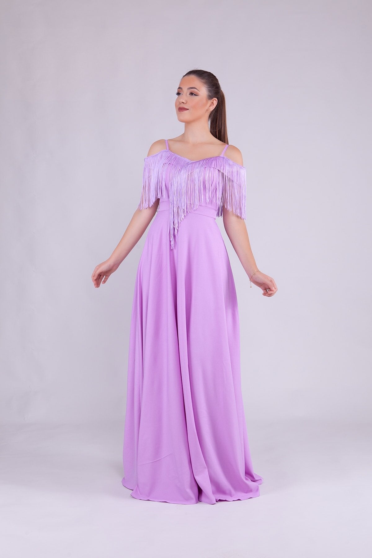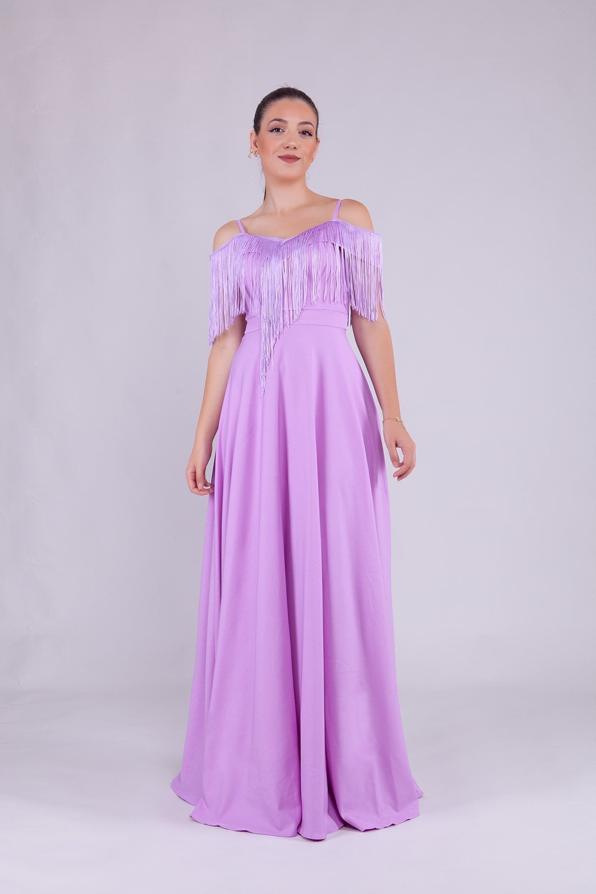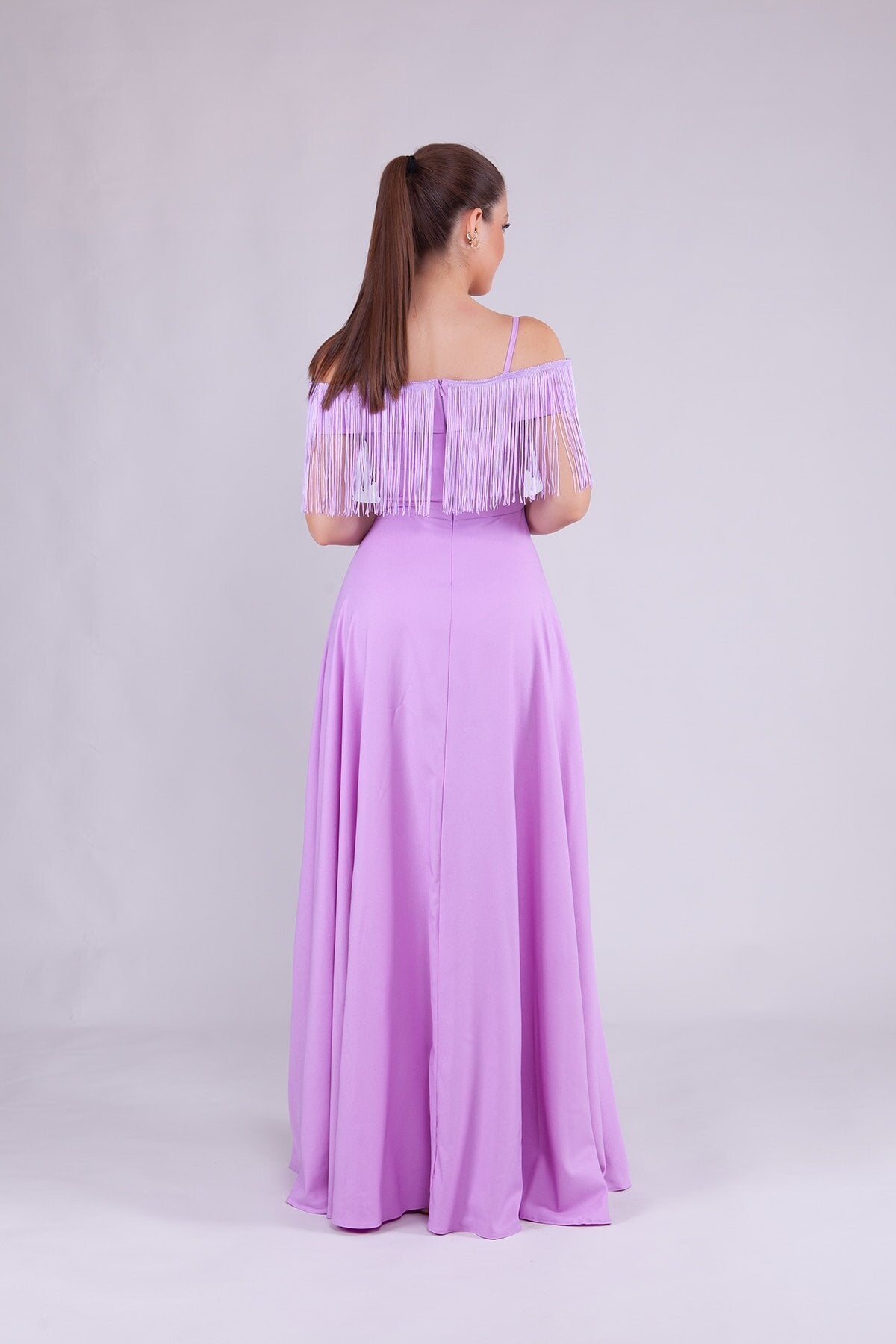 Long Strappy Boat Neck Tassel Detail Evening Dress - Lilac