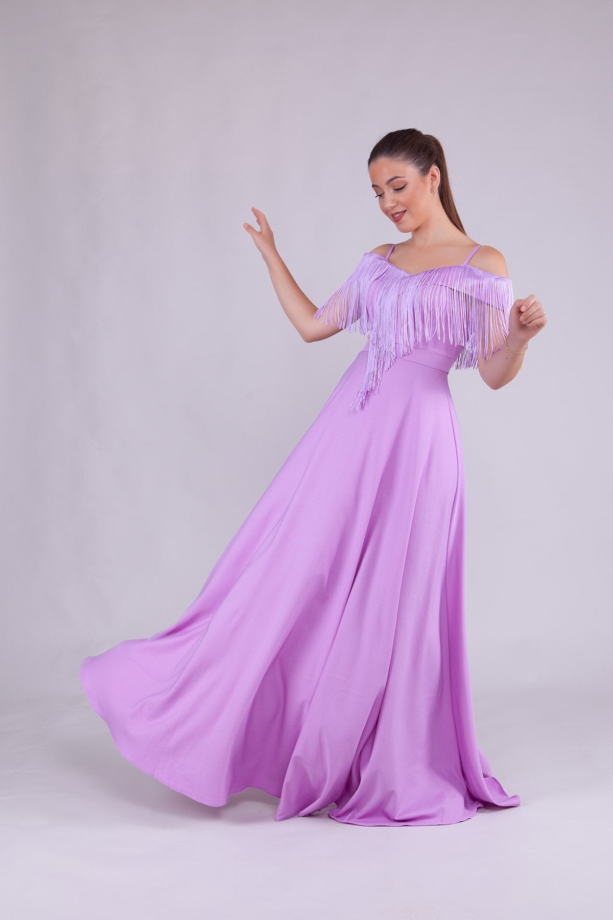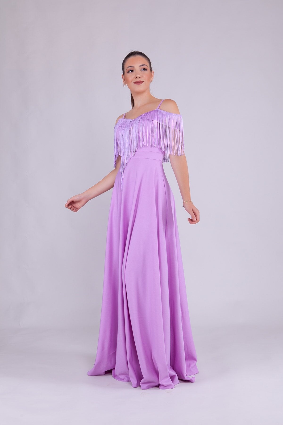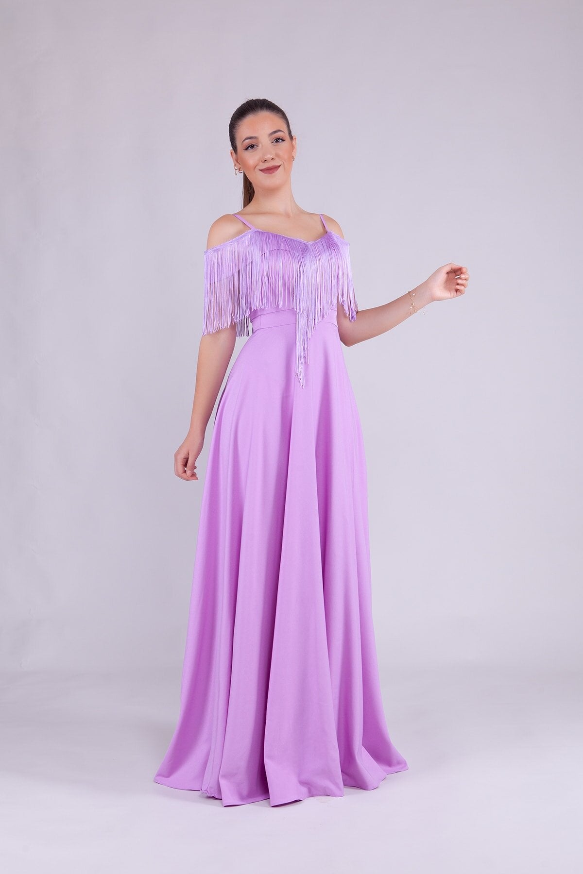 Long Strappy Boat Neck Tassel Detail Evening Dress - Lilac