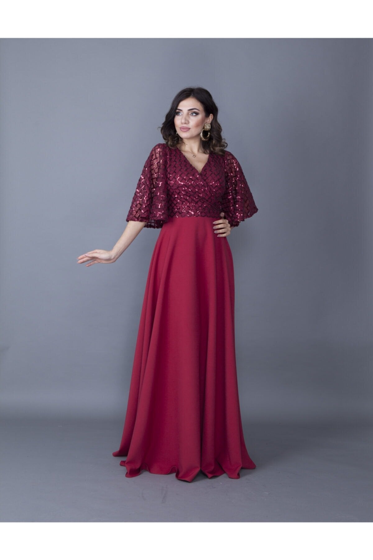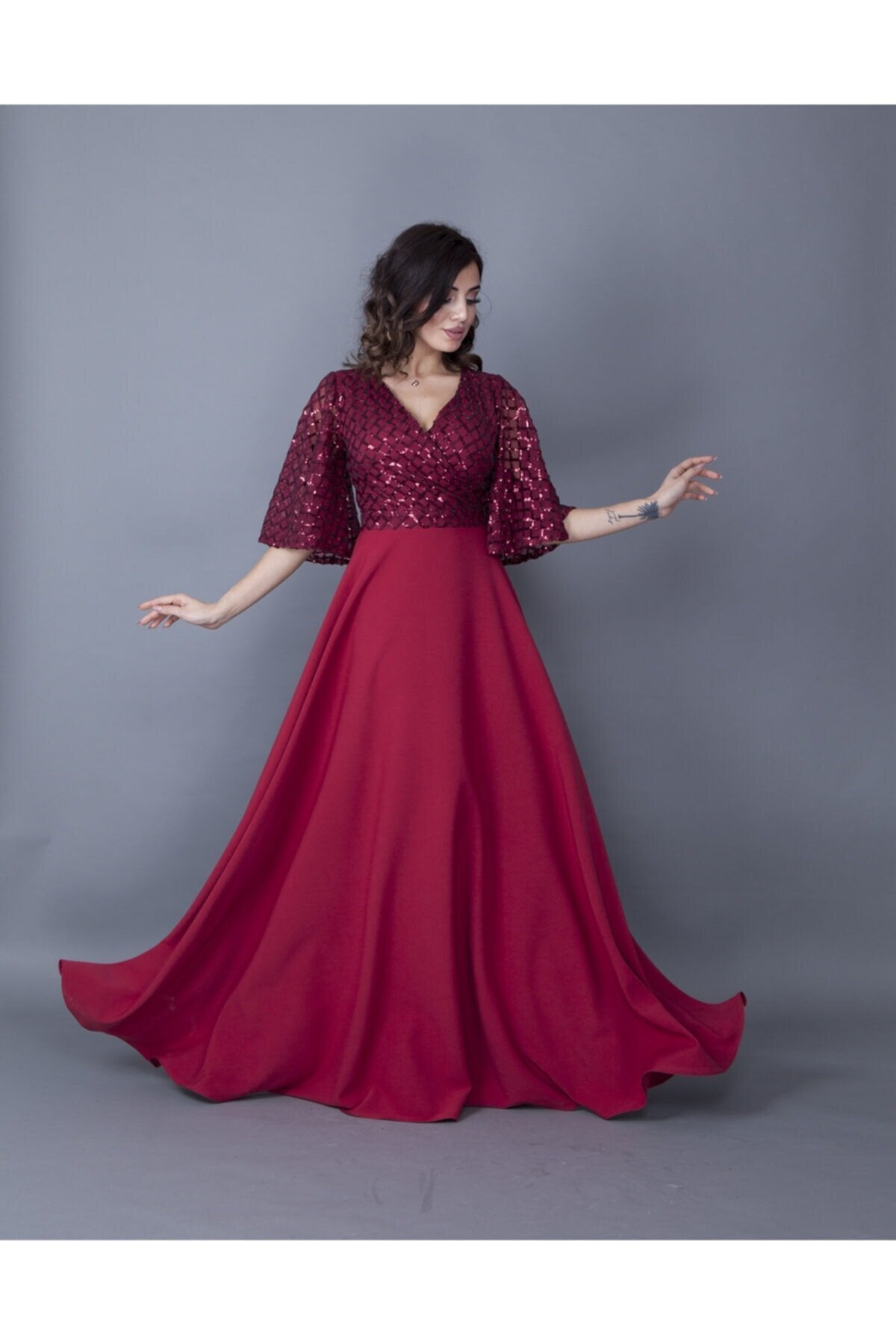 Long Wrap Batwing Sleeve Sequin Detail Evening Dress - Burgundy