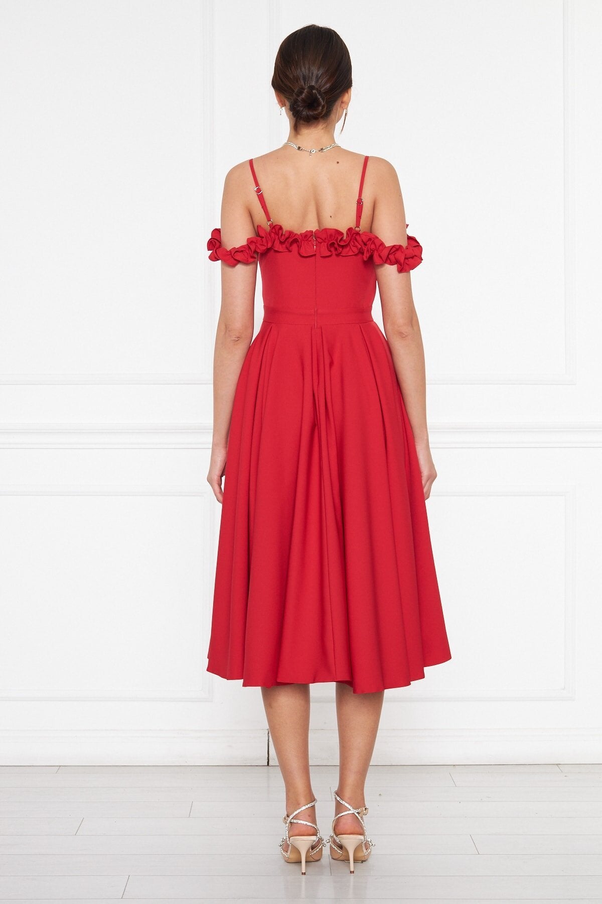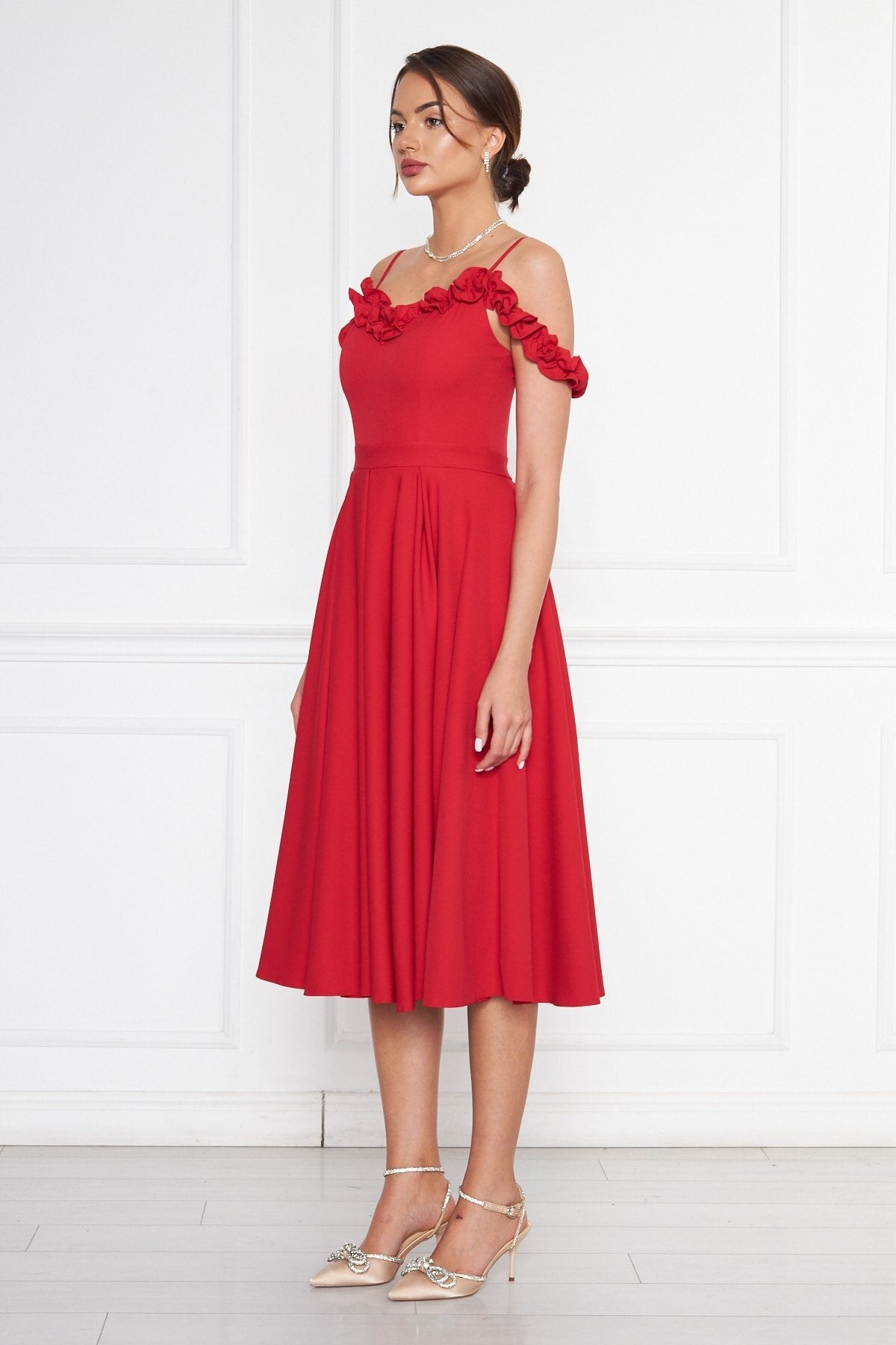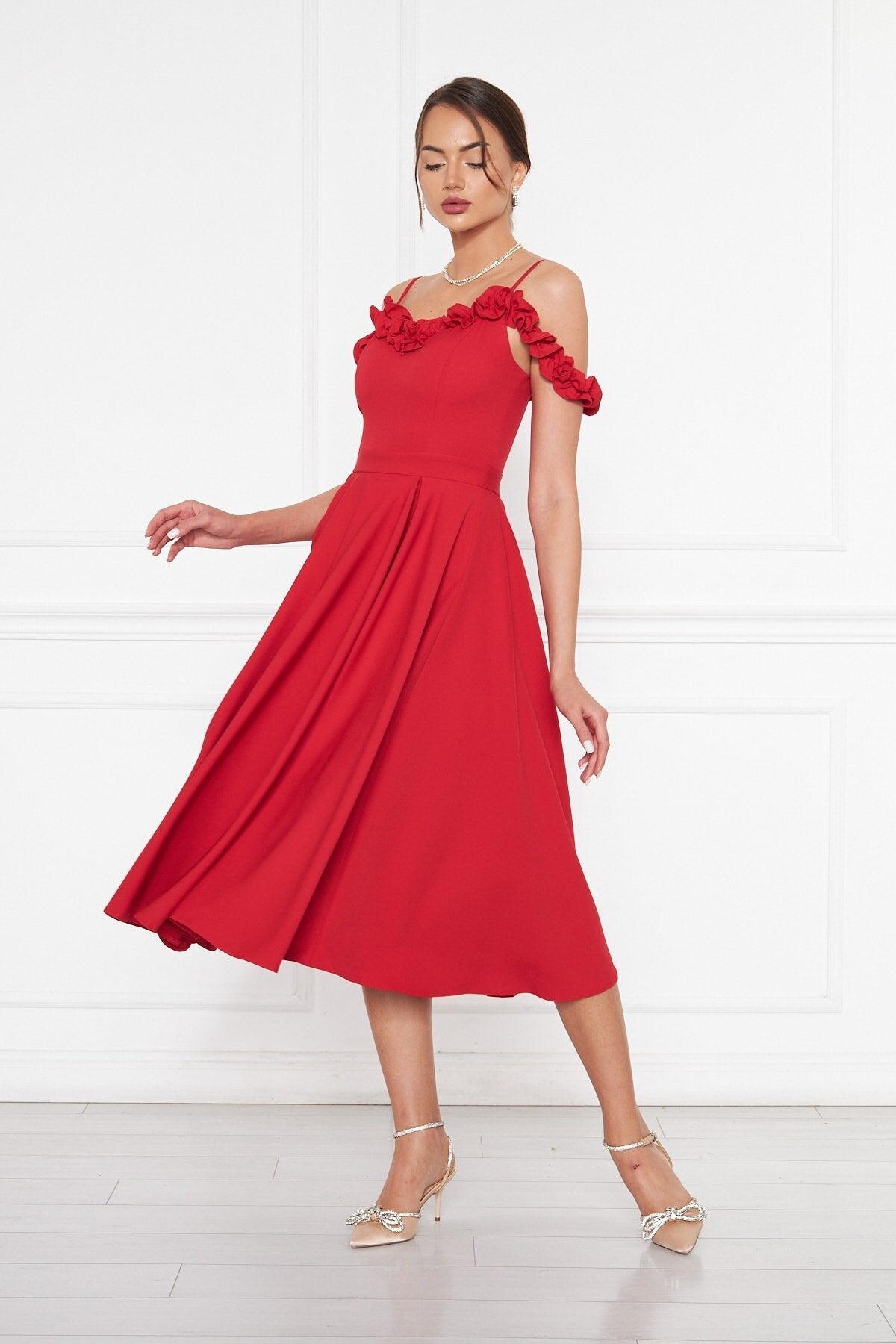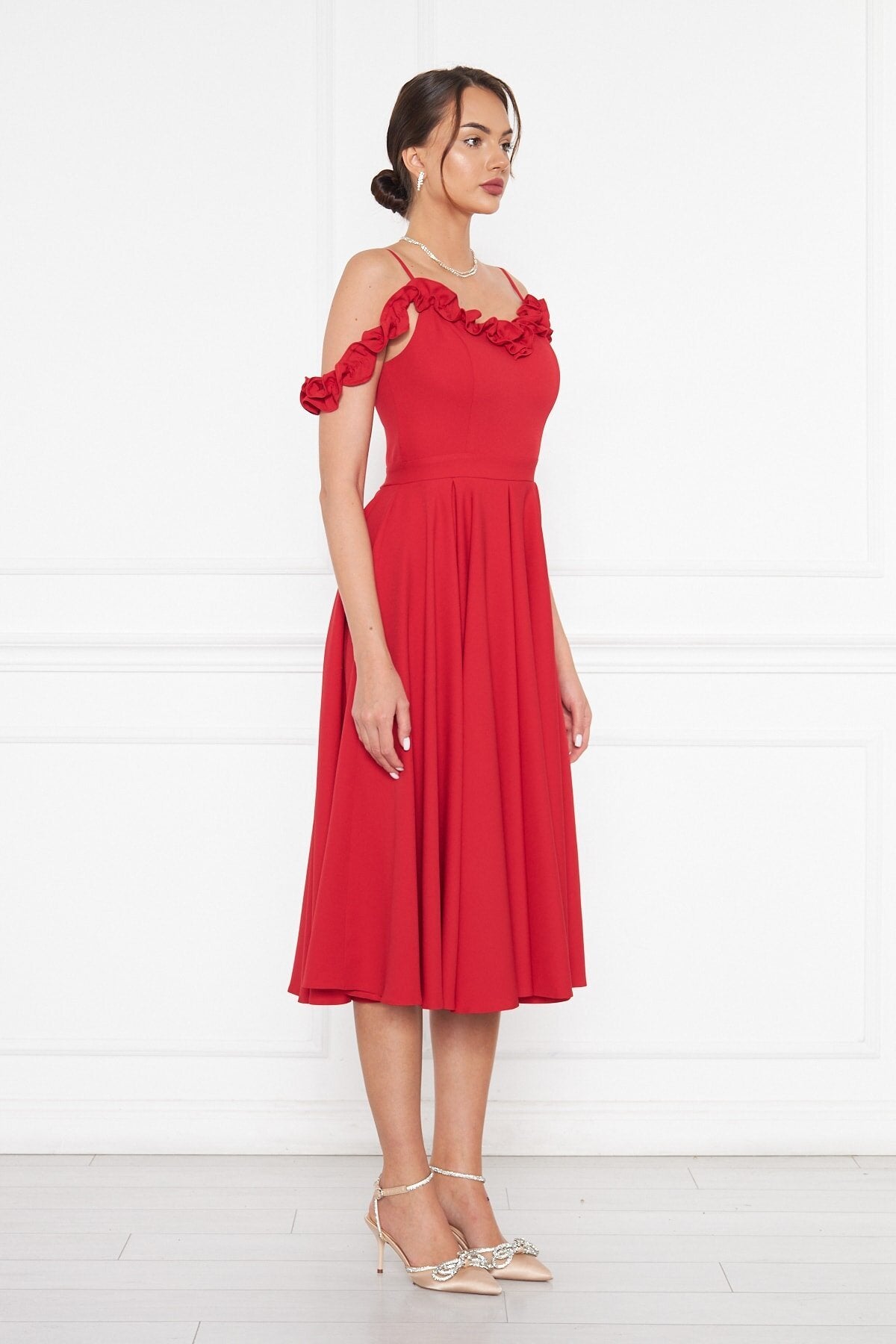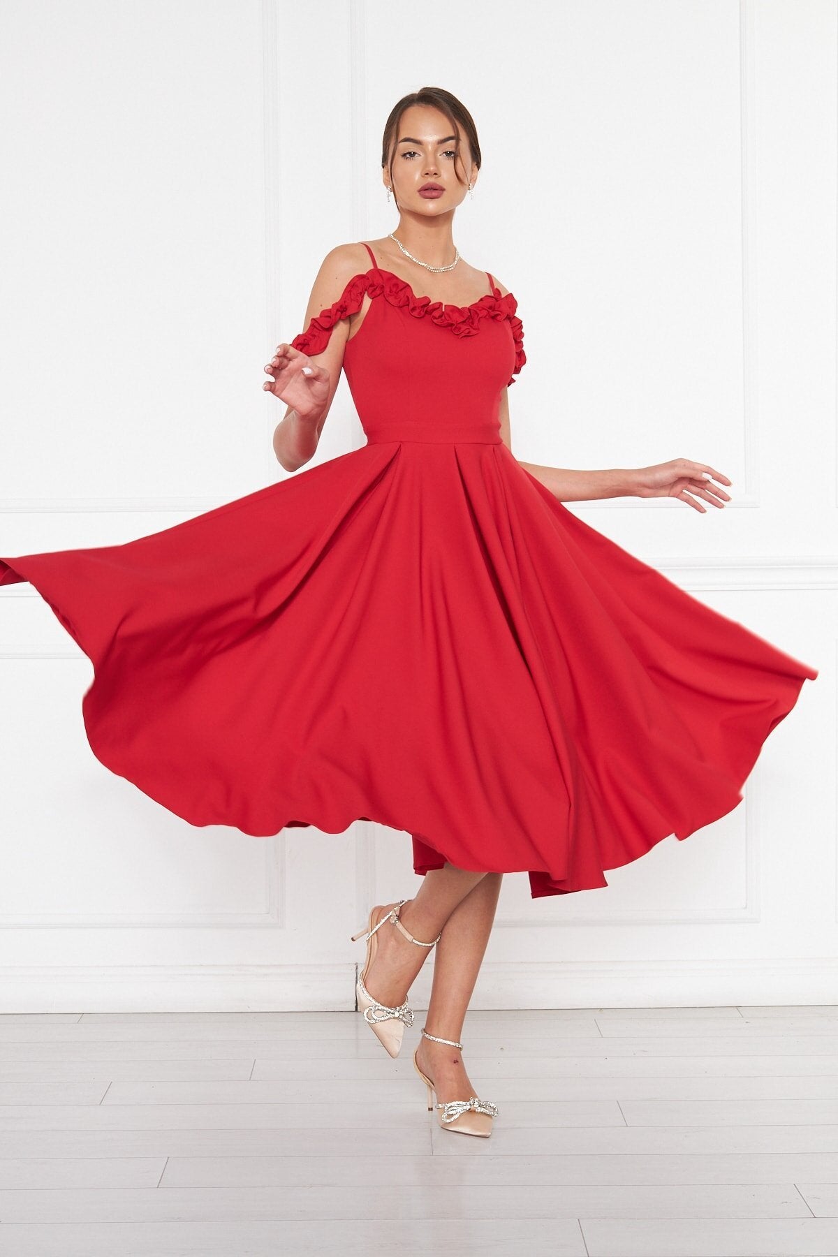Midi Flared Pleated Ruffle Detail Evening Dress - Red