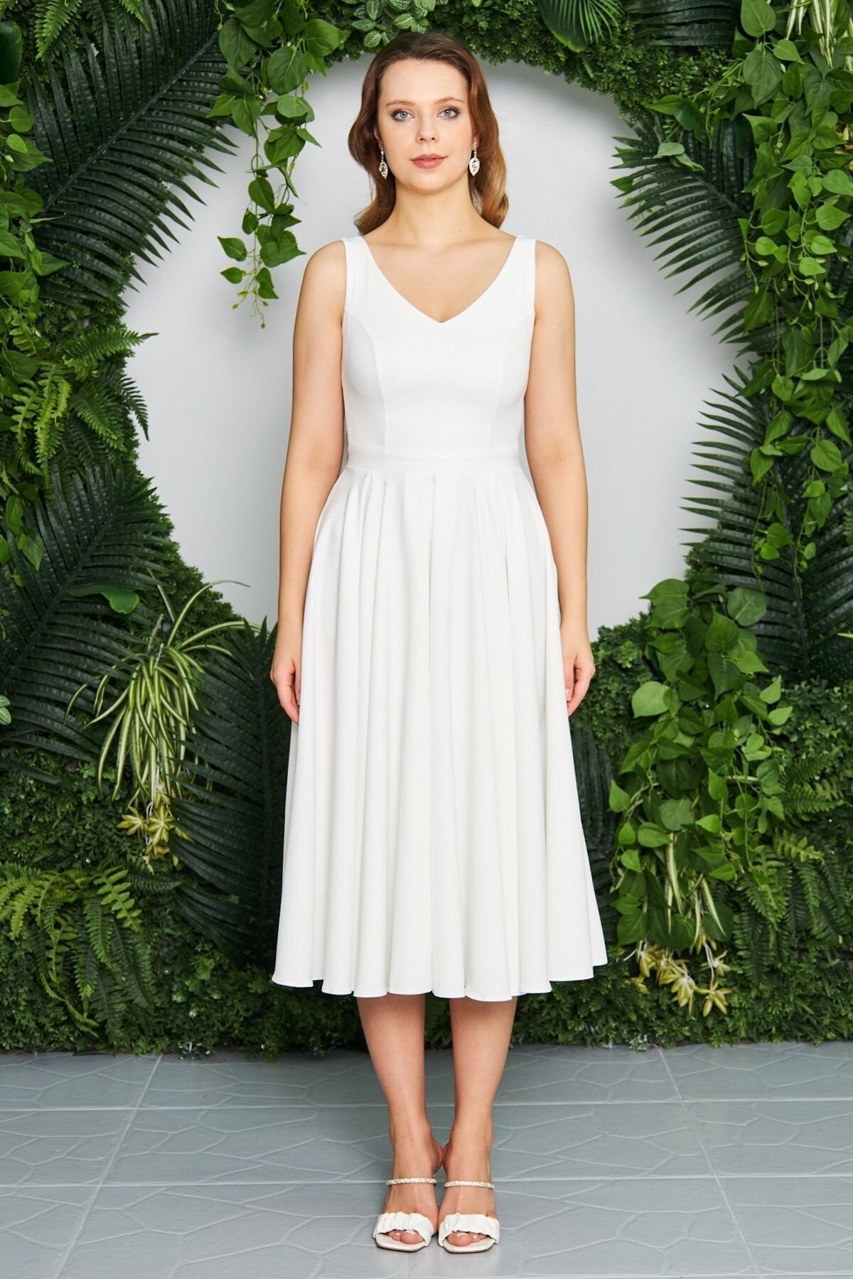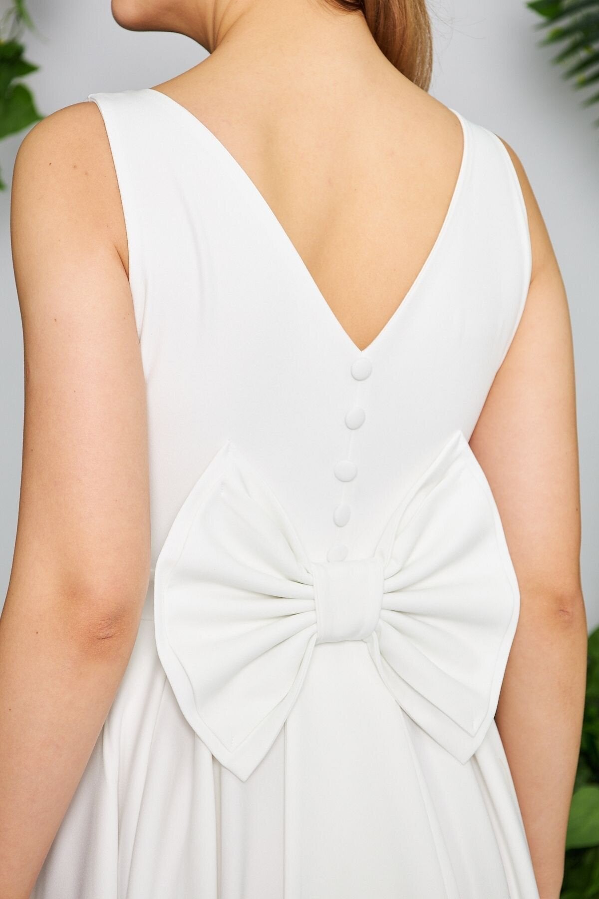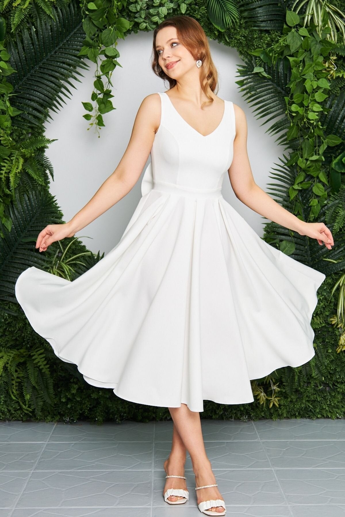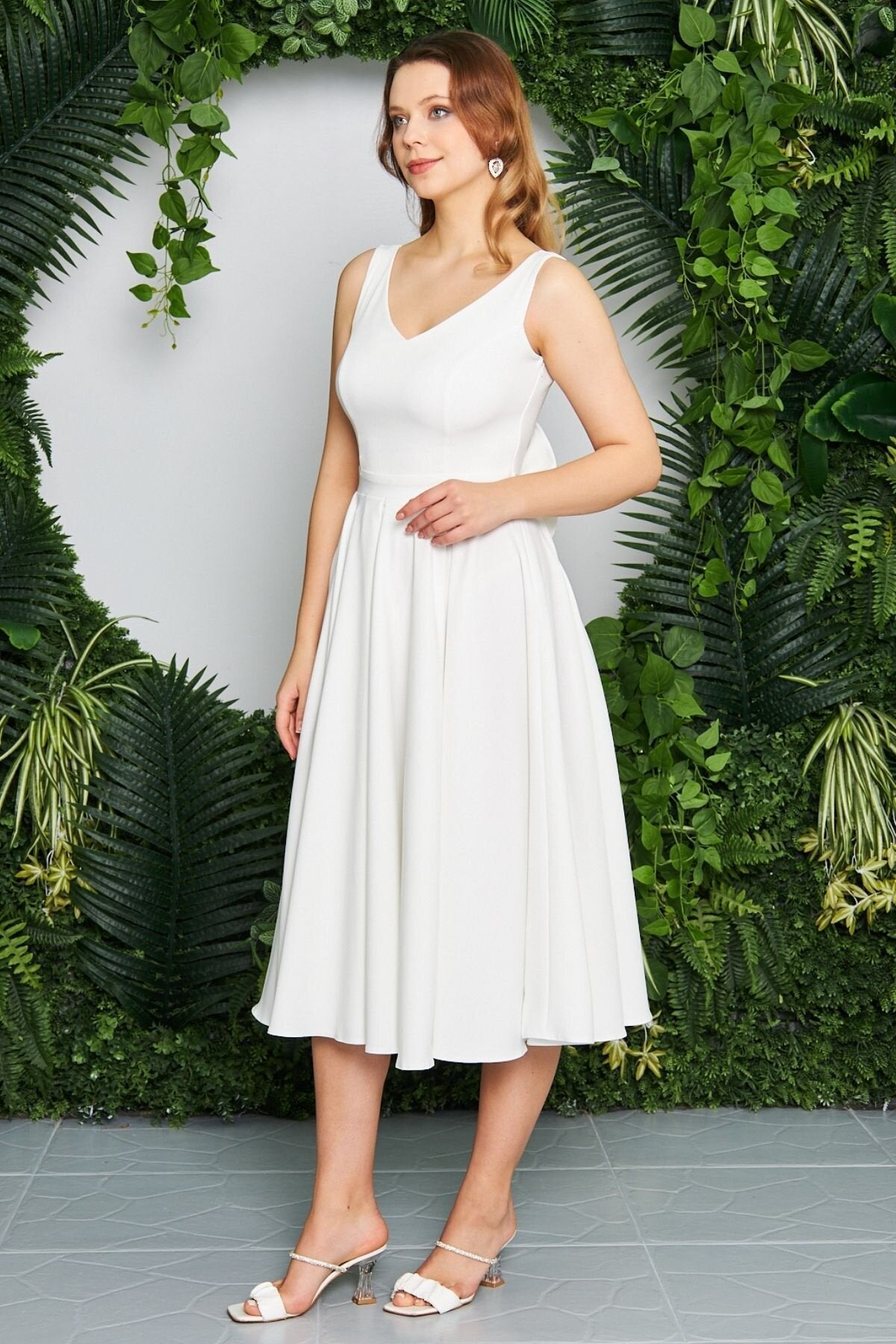 Midi Flared Pleated V-Neck Bow Back Evening Dress - White