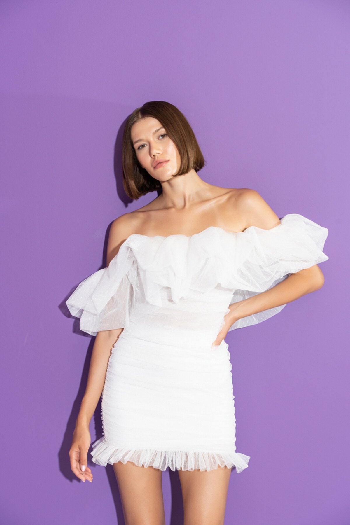 Material: Polyester, Fabric Type: Woven, Sleeve Type: Strapless, Fit: Slim Fit, Pattern: Plain, Neckline Type: Strapless, Color: White, Product Type: Plain, Sleeve Length: Short, Lining Status: Unlined, Length: Mini, Occasion: Elegant/Evening, Silhouette: Slim, Weave Type: Tulle, Pocket: No Pockets, Additional Feature: Not See-Through, Belt/Sash Status: No Belt, Sustainability Detail: No, Origin: TR, Box Status: No Box