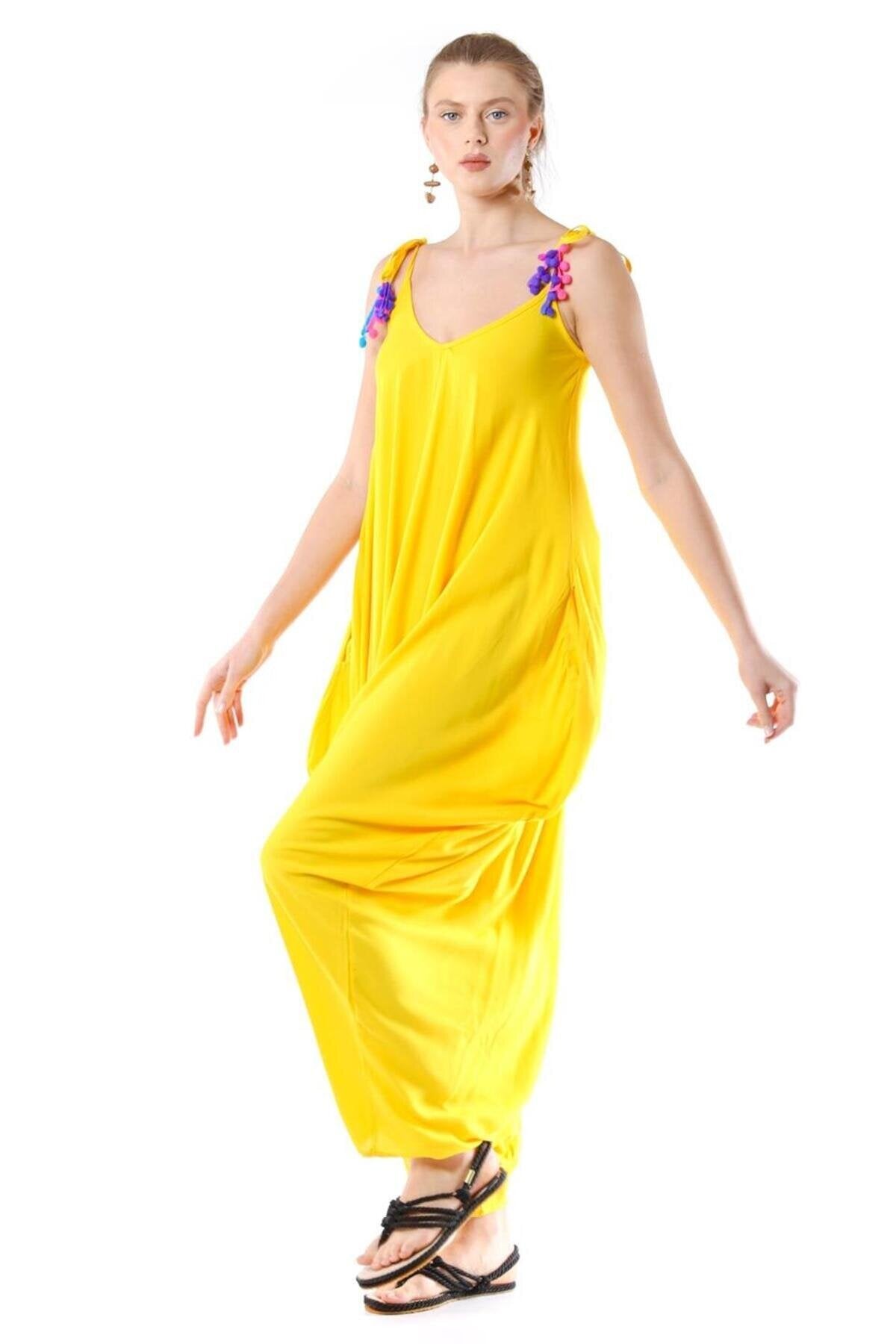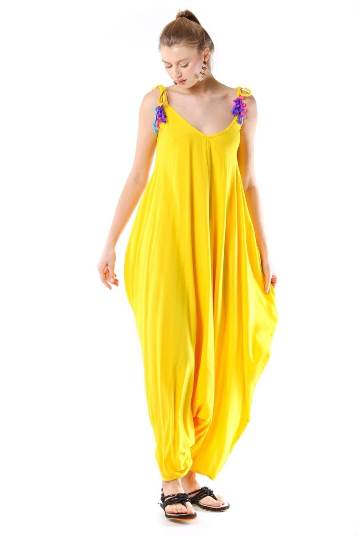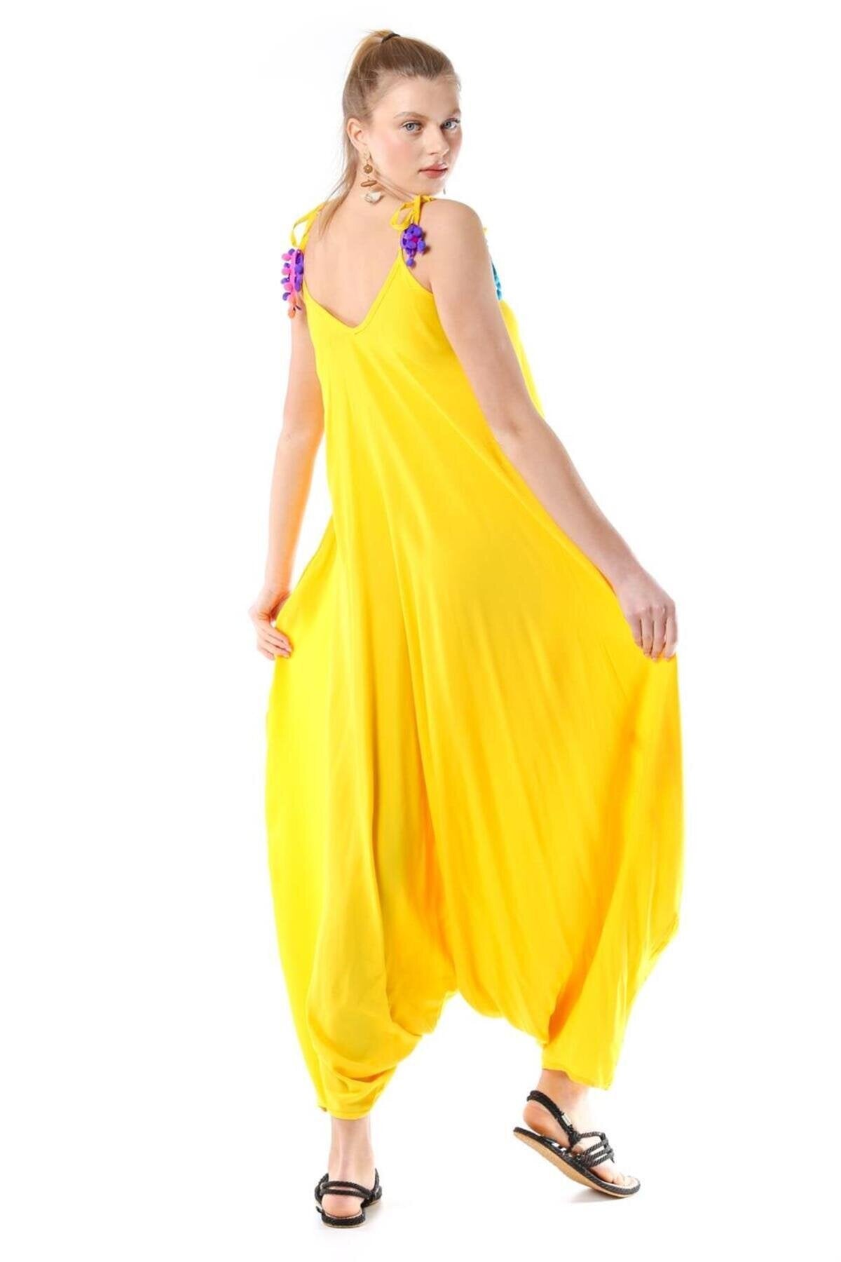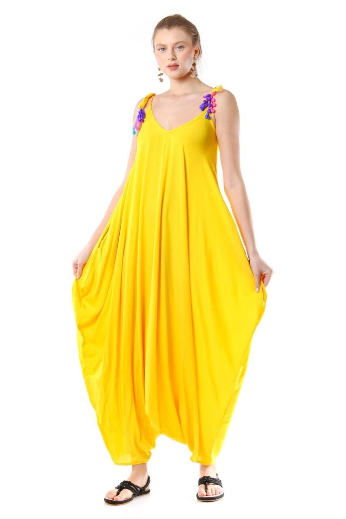 Sleeve Type: Strappy, Closure Type: No Closure, Fit: Oversize, Fabric Type: Denim, Color: Yellow, Material: Denim, Neckline Type: V-Neck, Product Detail: Denim Fabric, Pocket: No Pockets, Pattern: Solid, Sleeve Length: Strappy, Product Type: Plain, Belt/Sash Status: No Belt, Occasion: Trend, Persona: Fashion Forward, Sustainability Detail: No, Length: Standard, Leg Type: Straight Leg, Additional Feature: Keeps Cool, Silhouette: Basic, Season: Summer, Origin: TR, Package Contents: Single Item
