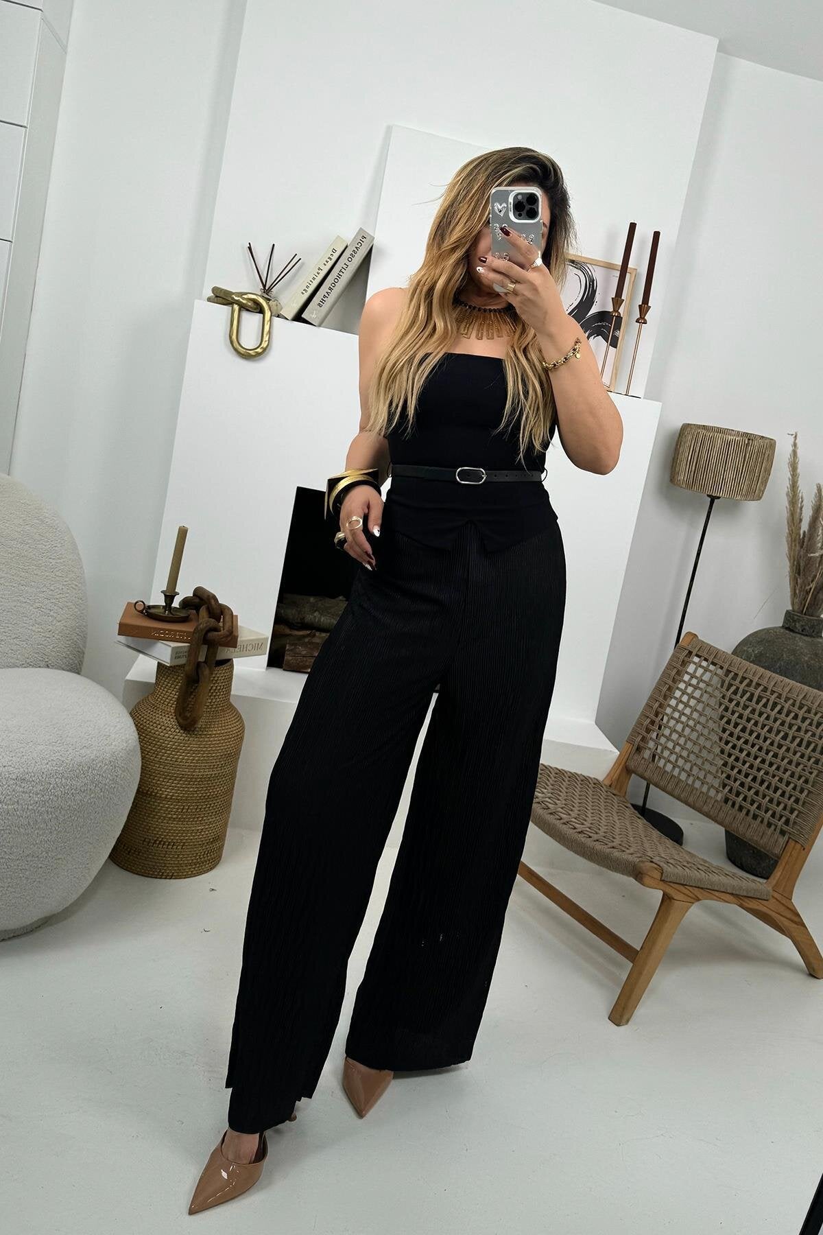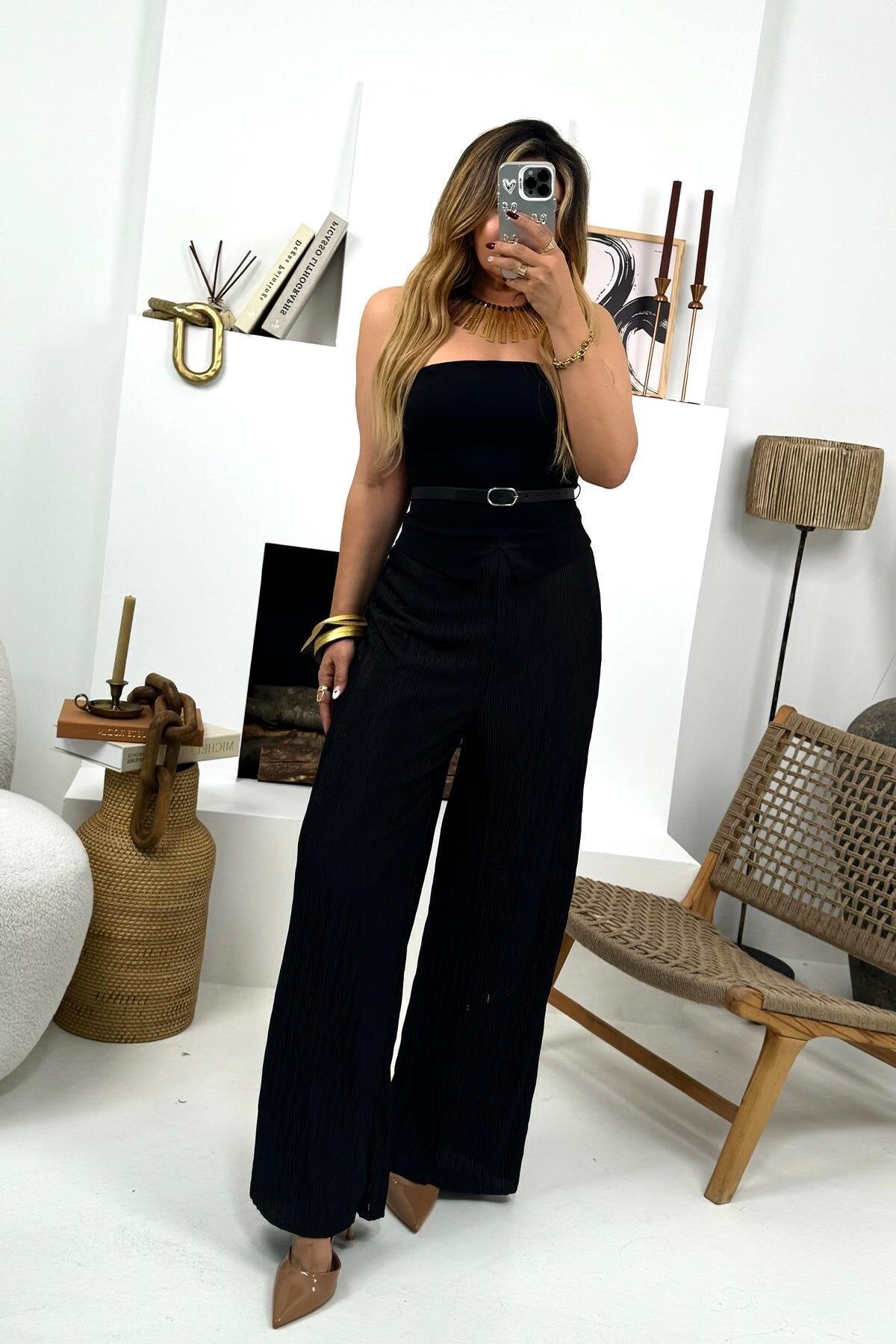 Pleated Trimmed Belted Jumpsuit - Black