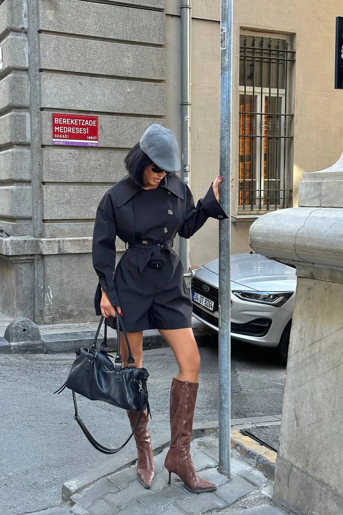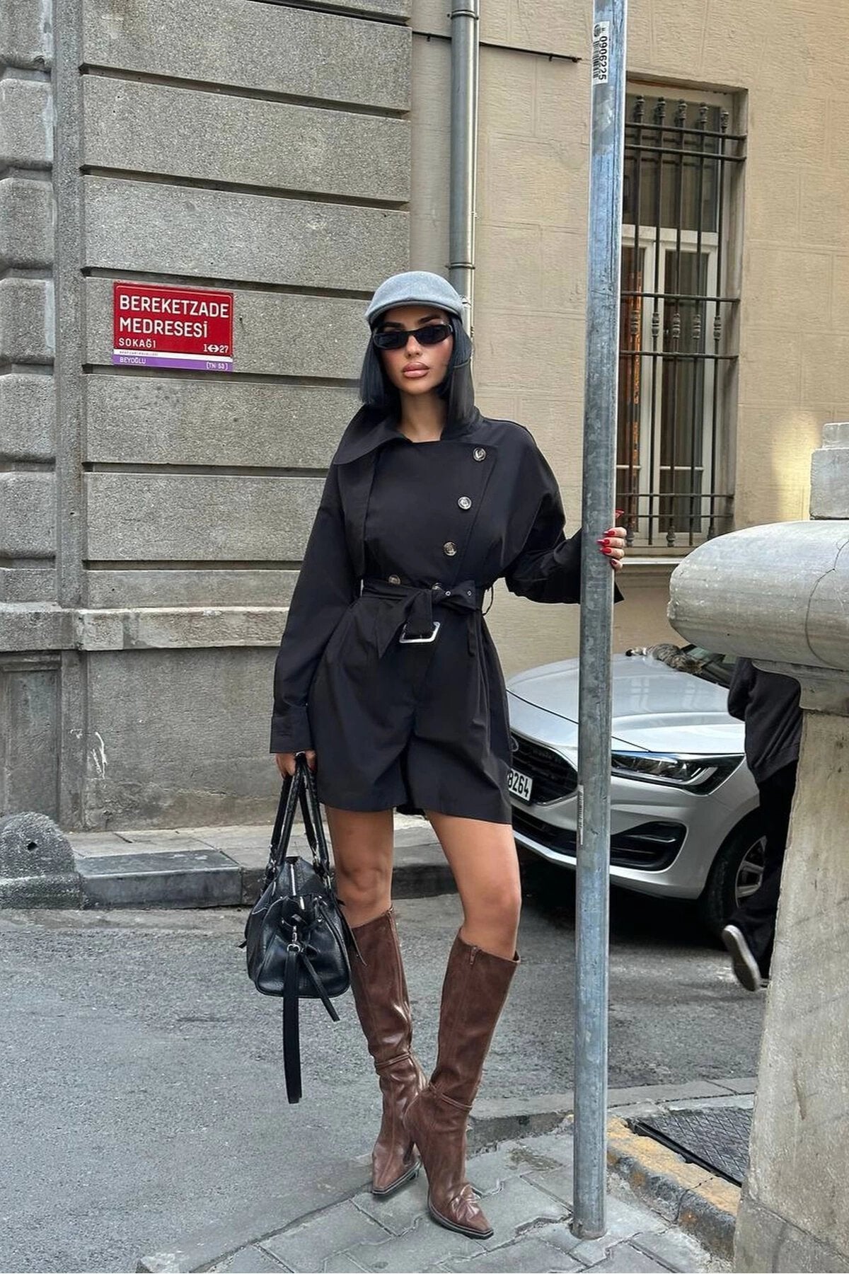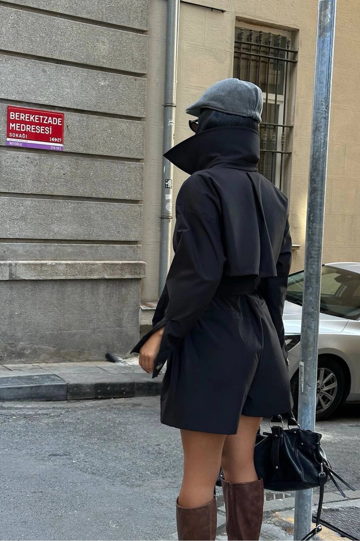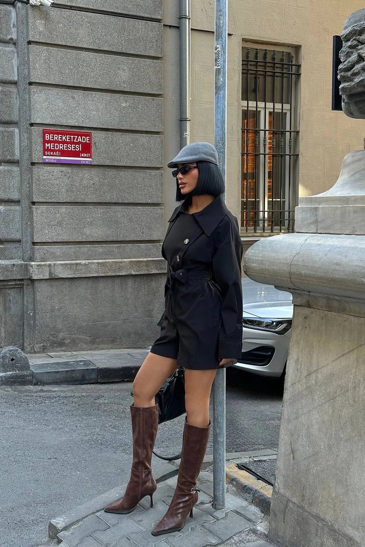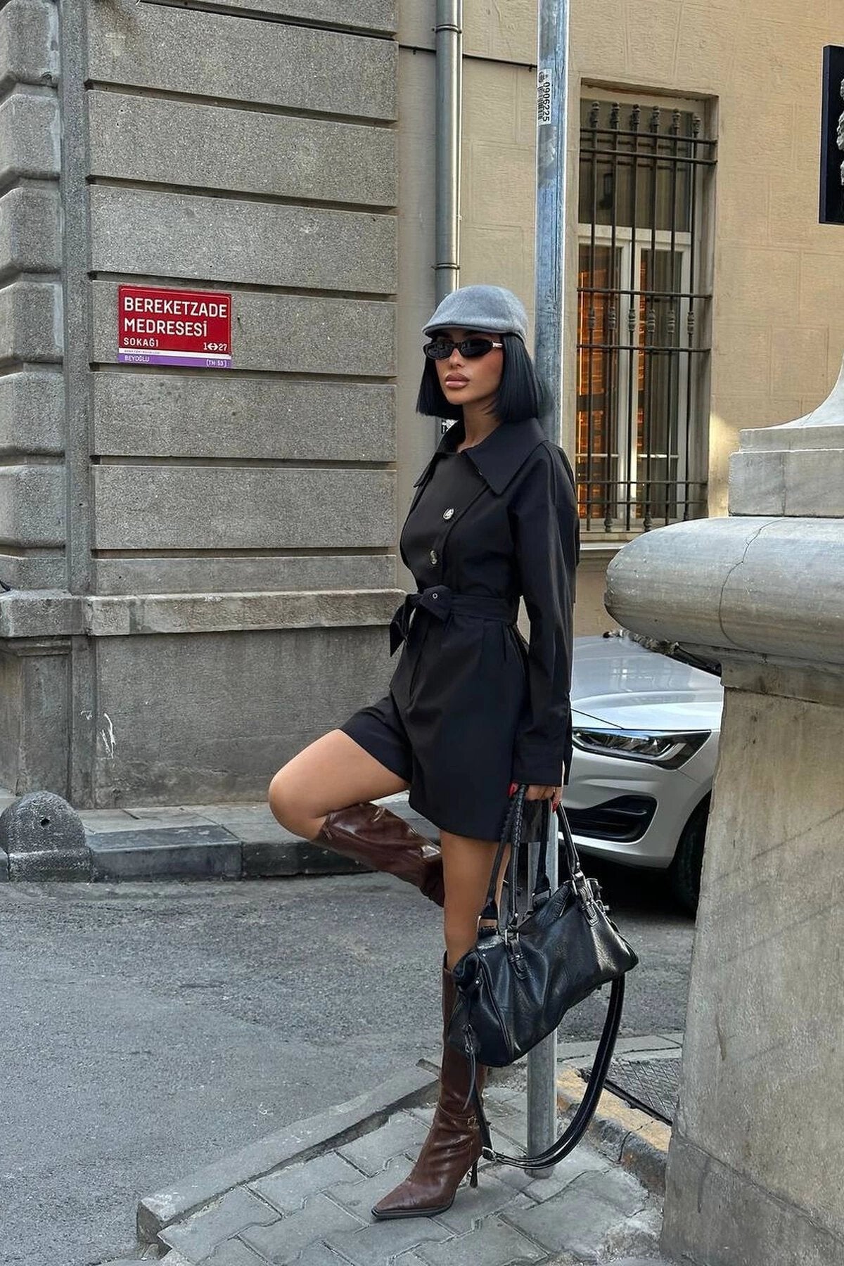 Fabric Type: Woven, Material: Cotton Polyester, Sleeve Type: Long Sleeve, Pattern: Solid, Fit: Jacket Dress, Color: Black, Neckline Type: Wrap Neck, Closure Type: Buttoned, Sleeve Length: Long, Product Detail: Tie Detail, Pockets: Two Pockets, Collection: Design, Thickness: Thick, Lining Status: Unlined, Length: Short, Persona: Fashion Forward, Silhouette: Jacket Dress, Occasion: Casual/Daily, Weave Type: Gabardine, Additional Feature: Cut Out, Print/Embroidery Technique: No Print, Belt/Sash Status: Belted, Sustainability Detail: No, Package Contents: 1+, Cup: Cupless, Season: Winter, Origin: TR, Box Status: No Box