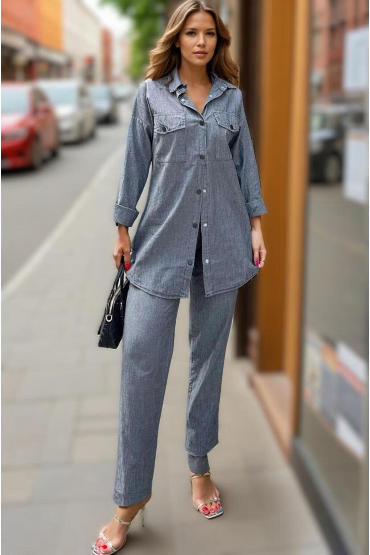 Long-Sleeve Pocketed Shirt and Elastic-Waist Pants Set - Anthracite