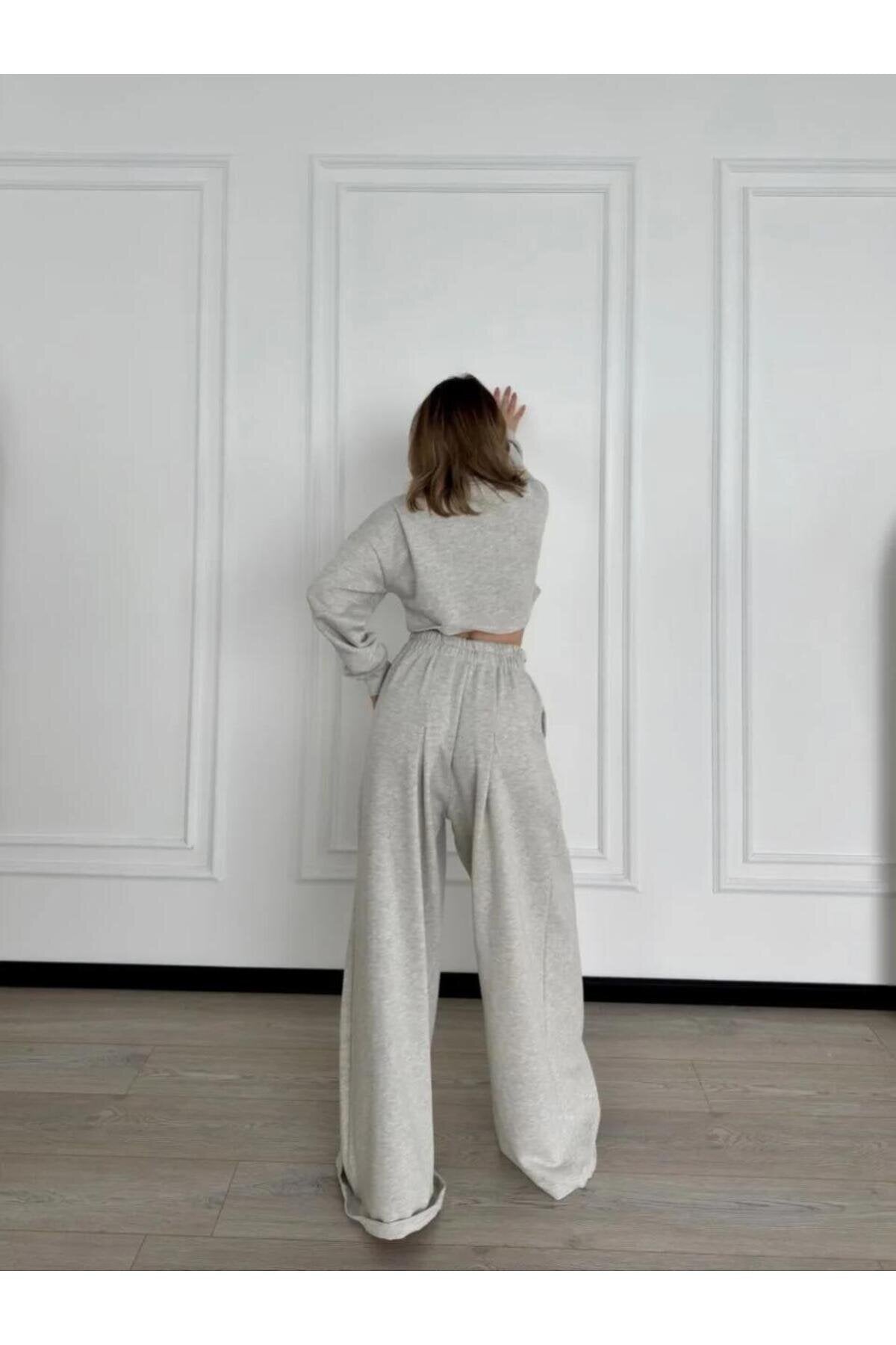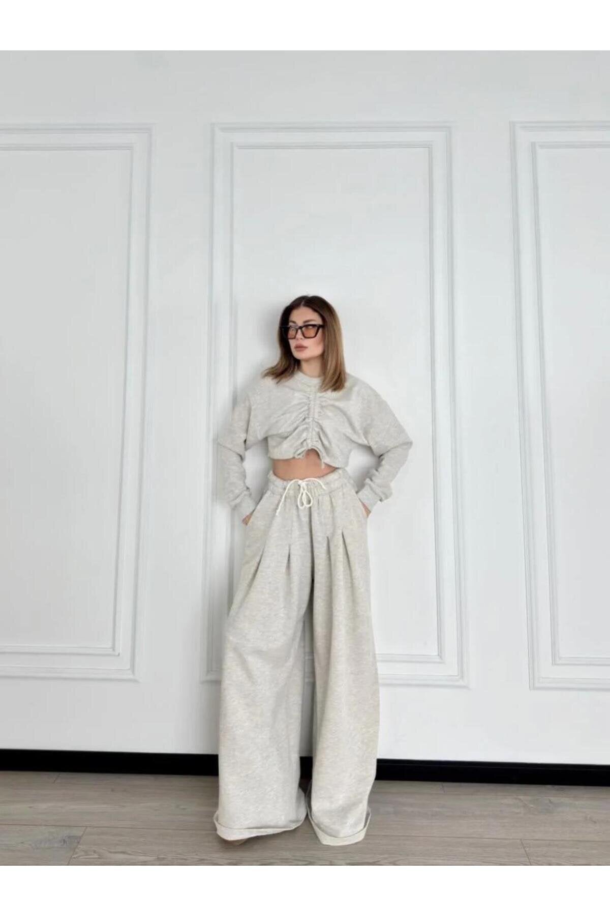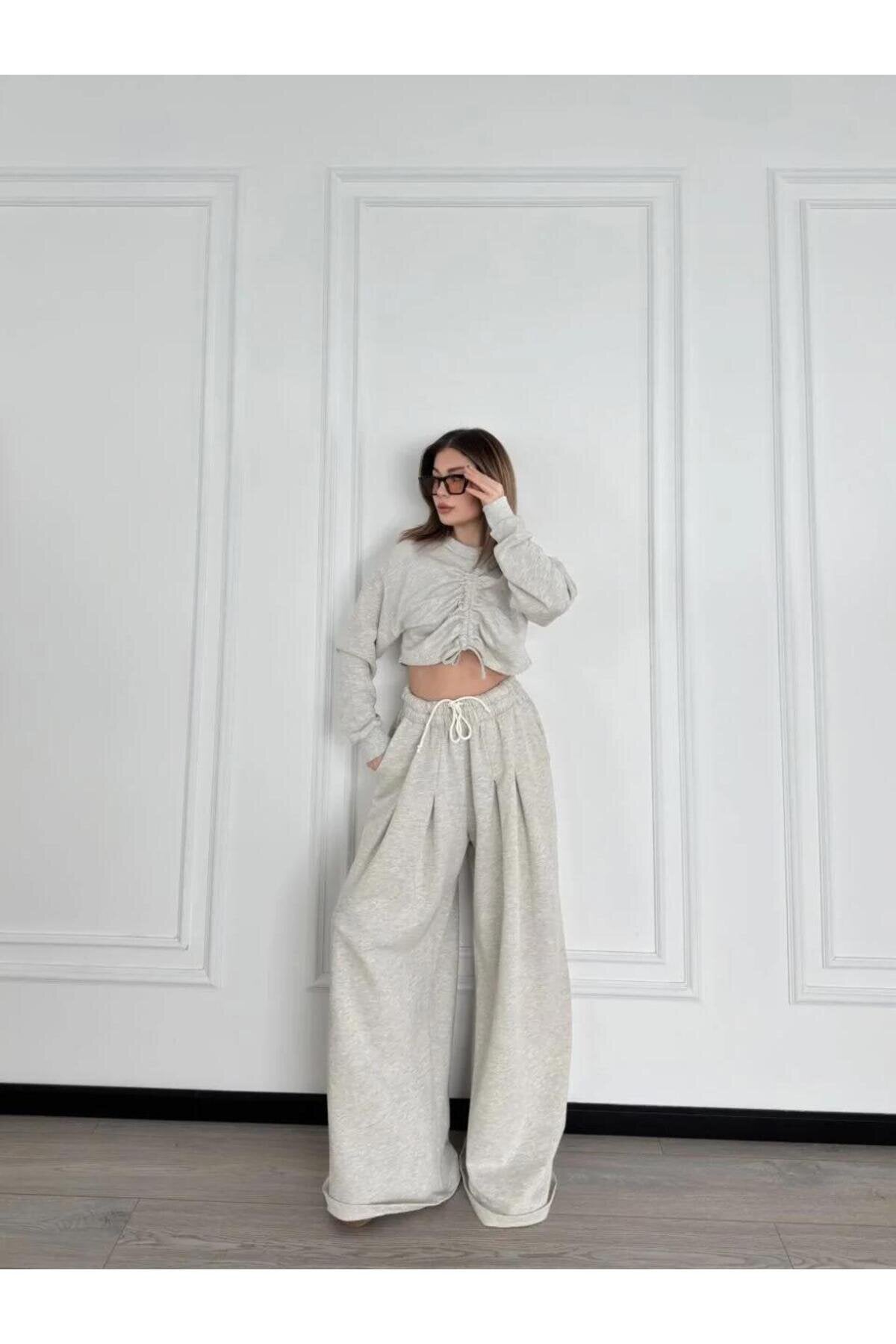 Long Sleeved Crop Drawstring Gathered Front Pants Two-Piece Set - Gray
