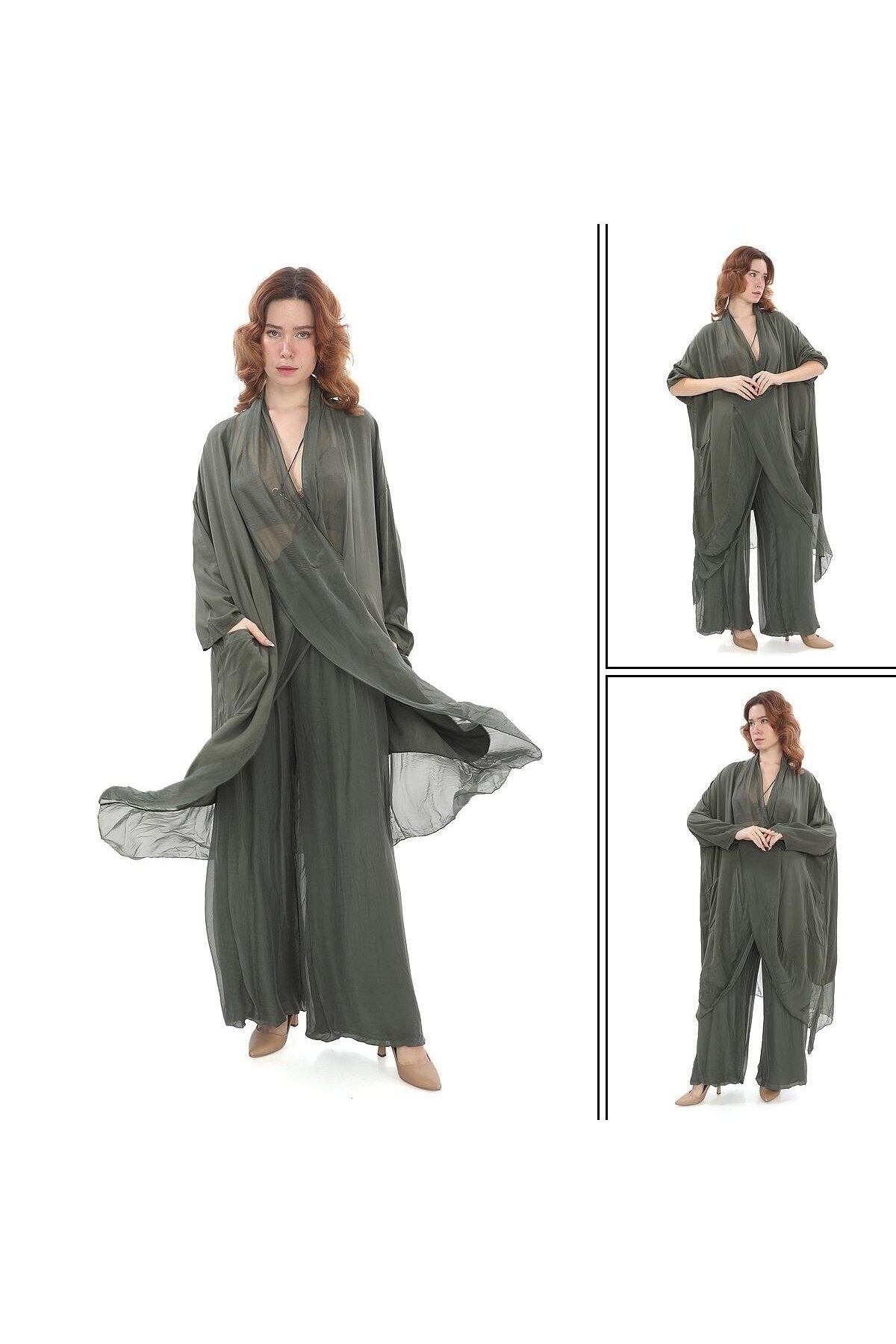 Oversize Italian Silk Detailed Kap Tunic and Pants Set - Khaki