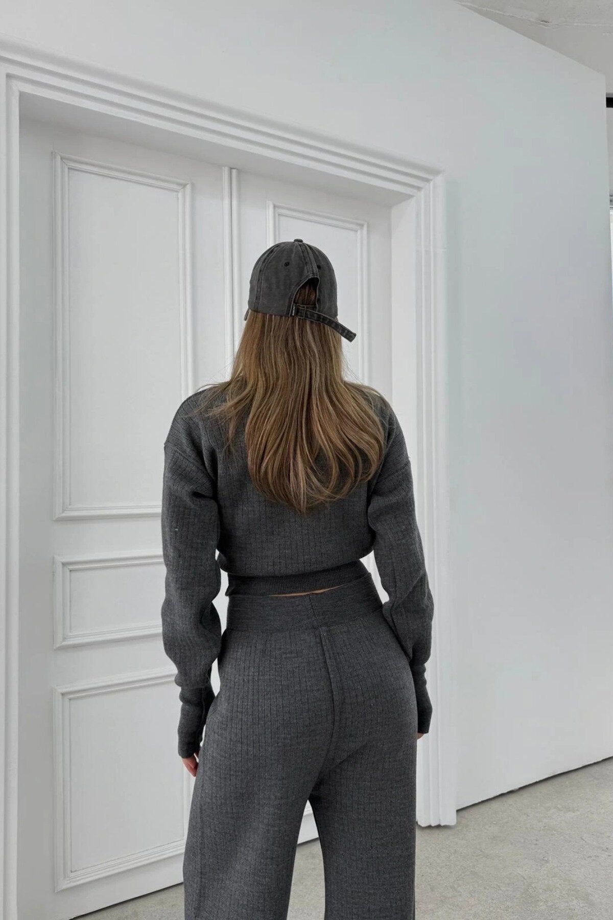 Fabric Type: Knit; Material: Cotton Polyester; Pattern: Solid; Fit: Fitted; Neckline: High Neck; Color: Grey; Product Detail: No Detail; Pockets: No Pockets; Product Type: Plain; Sleeve Length: Long; Sleeve Type: Standard Sleeve; Collection: Design; Thickness: Thick; Waist: High Waist; Leg Type: Straight Leg; Silhouette: Fitted; Style: Trendy; Length: Crop; Set Type: Sweater-Pants Set; Additional Feature: Stretchy; Weave Type: Knit-look; Persona: Cool & Comfort; Belt Status: No Belt; Print/Embroidery Technique: No Print; Number of Pieces: 2; Lining Status: Unlined; Sustainability Detail: Yes; Package Contents: 2-piece; Season: Winter; Origin: TR; Box Status: No Box; Closure Type: Mono Closure;