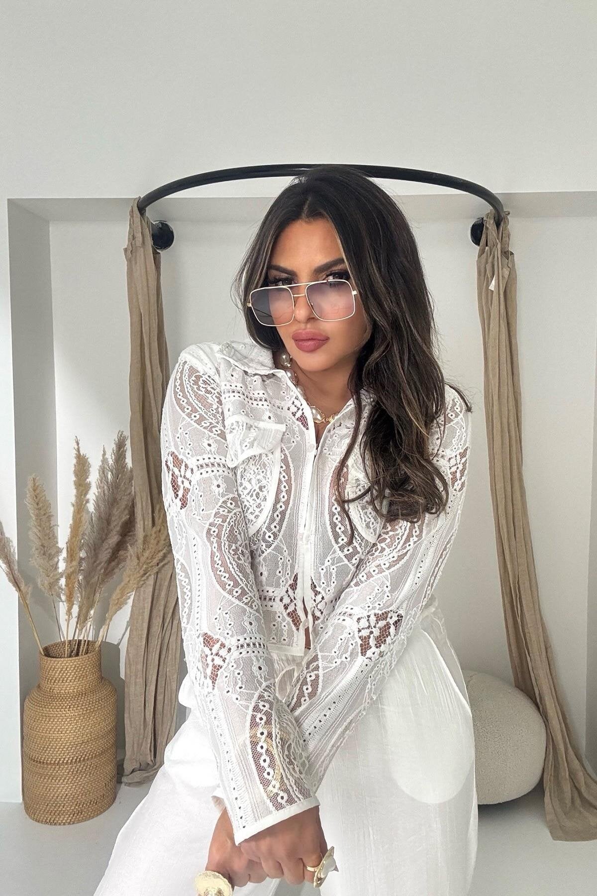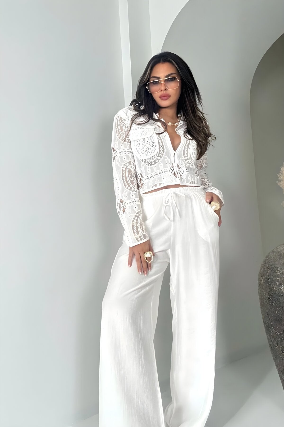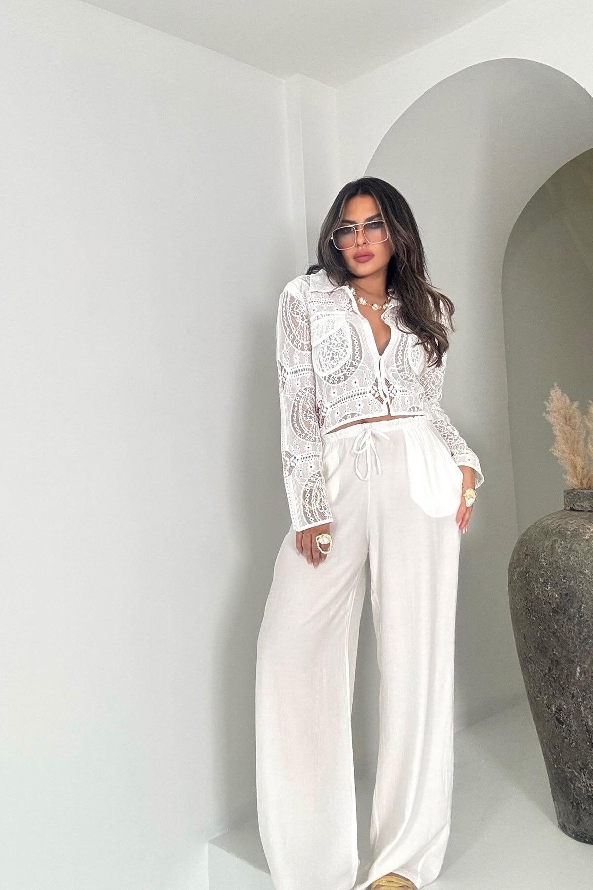 Crinkle Shirred Elastic Waist Pants - Ecru